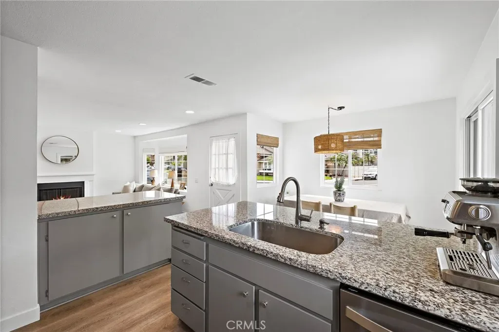 Ideally located, flawlessly designed and pristine in every way! Welcome to 191 Rockwood within the highly coveted community of Woodbridge. This premium single story end-unit home encapsulates all of the style and amenities sought out by even the most discerning buyers. Upon entering, you’ll notice the abundance of natural light shining in on the open concept family room, kitchen and dining space. The entire home has been recently upgraded with vinyl wood flooring, brand new paint and vinyl windows throughout. The family room offers a gas burning fireplace and large front bay window, while the adjacent kitchen includes newly painted cabinetry, granite counters, glass backsplash, breakfast counter seating, and stainless appliances, including newly upgraded fridge, dishwasher and stovetop hood. The spacious primary bedroom boasts custom wall sconce lighting, custom closet organizers and a desk space. The primary bath includes a new dual sink vanity, new light fixtures and a remodeled shower/tub. The two secondary bedrooms offer mirrored sliding closet doors and share a fully remodeled secondary bathroom, also with dual vanity. Other interior features include new Roman shade window coverings throughout, indoor washer and dryer closet, large hallway linen closet and new ceiling fans. Just outside the sliding kitchen door is the large enclosed side yard, ideal for kids to play or hosting weekend BBQs. The private carport is conveniently located just outside the side yard gate. The newly installed AC, heater and Nest thermometer ensure interior comfort for several years to come. A short 2 block walk from the home is the Blue Lake Swim Club, which recently underwent a $4+ million renovation. The park adjacent to the swim club includes expansive grass areas, basketball half court and playground. In addition, Woodbridge offers award winning schools, and the Village Association offers residents amenities such as two landmark lakes, fishing, paddle and row boats, sand-bottom beach lagoons, over twenty pools, volleyball, tennis and pickleball. Come see for yourself!!!