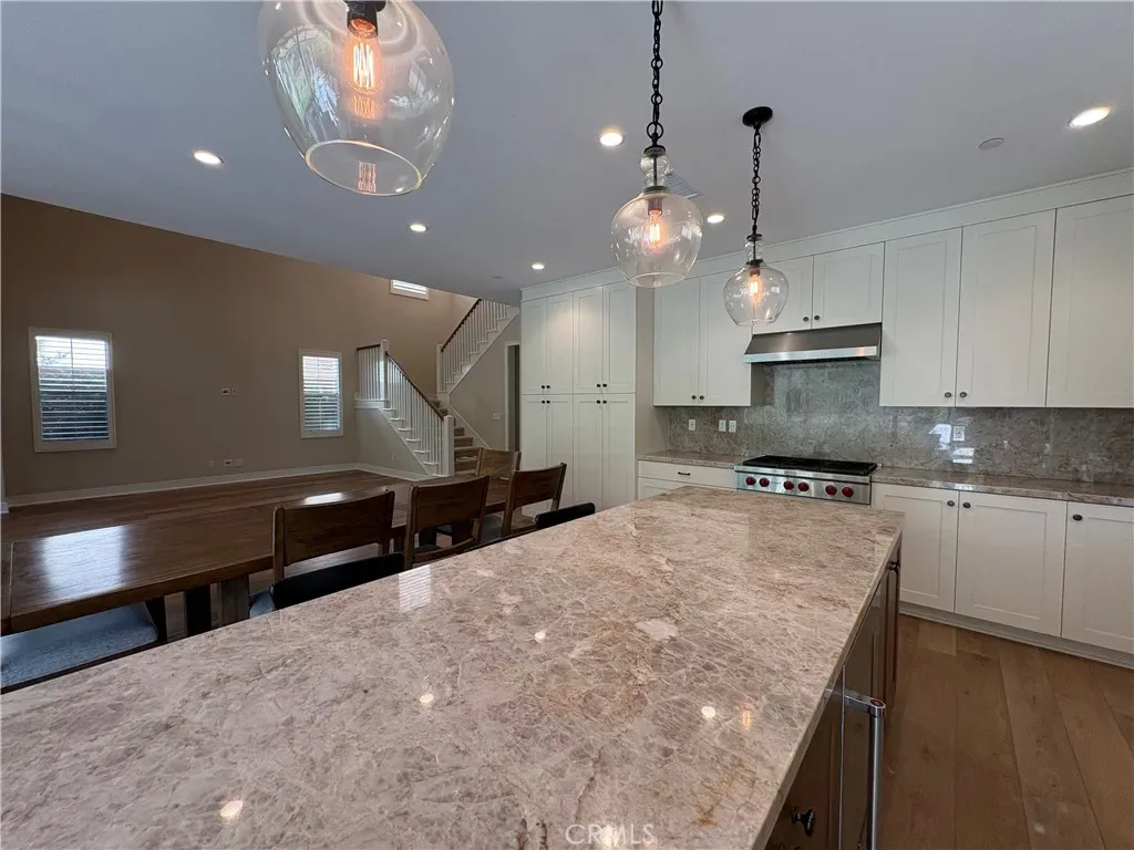 The chef’s kitchen is both functional and elegant, offering high-end appliances, ample storage, and a spacious island that anchors the heart of the home.