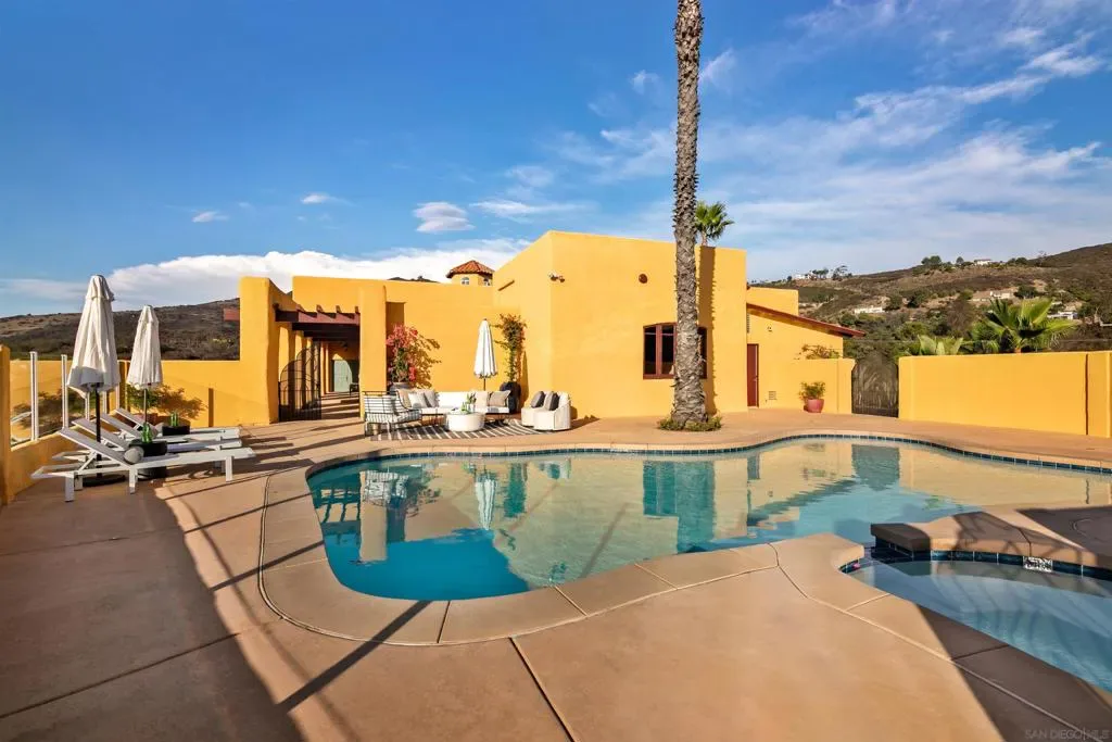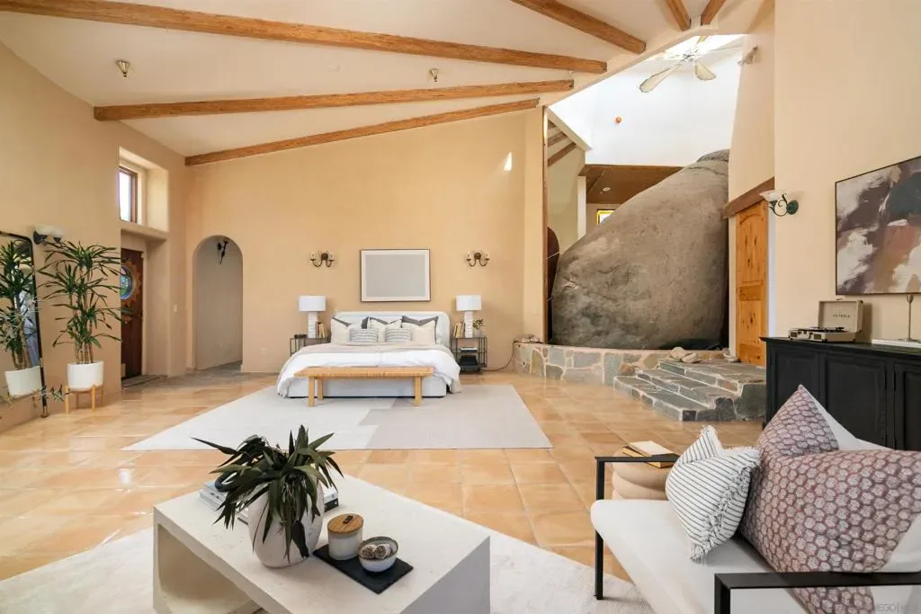 Perched high on Alta Loma Drive in eastern San Diego County, The Boulder House is a forward-thinking green home and a rare creation by Hubbell & Hubbell, the acclaimed father-and-son team of the late celebrated artist James Hubbell and his son, architect Drew Hubbell. Recognized with architectural honors and featured in multiple publications, including The Los Angeles Times, this residence stands as both a work of art and a pioneering model of sustainable living. Blending artistry with innovation, the home features new ceramic tile floors, custom tile work, vaulted ceilings, and arched windows that flood the open layout with natural light. At its heart, the residence is literally built around a 14-foot natural boulder, a dramatic centerpiece in the great room that cools and humidifies in summer and radiates warmth in winter. Above, a central tower fan enhances airflow, drawing heat up and out in warmer months and recirculating warmth in cooler seasons. Roof overhangs and arched arcades minimize solar gain while honoring California’s historic mission style. Super-insulated straw bale walls act like a thermos, keeping interiors comfortable year-round while exceeding California’s Title 24 standards by 41 percent. Recent upgrades include a newly re-plastered pool, freshly recoated exterior limestone, a new high-efficiency tankless water heater, new water softener, new well pump and renewed septic. Privately set against protected land and a wildlife sanctuary, the property offers unmatched seclusion, sweeping mountain views, and timeless architectural design.
