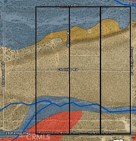 PRICE REDUCTION – Approx 0.37 Miles of Hwy Frontage, 3 Parcels, combined 119.21 Acres (APN: 0601-231-11, 0601-231-14, 0601-231-15) GPS: 34.135198, -116.33493 These properties are located in Joshua Tree, CA. San Bernardino County has zoned this property both Joshua Tree/Rural Living (JT/RL) and Joshua Tree Multiple Residential (JT/RM). There is approx 90 acres of RL zoning, this zoning can be subdivided into 1 until per 2.5 acres. There is approx 30 acres of RM zoning, which allows for approx 20 units per acre. The property has both a 115 KV power line along the highway and also along Sunny Vista Rd. There is also a residential electricity line on the property running on site (parallel to the highway approx 240 ft north of the 115 KV line). The Joshua Basin Water District services the area and has a water line across the street, along Sunny Vista Rd. Residents have septic tanks for their sewer needs. The properties have a blue line running parallel to the highway with a small portion of DWR Awareness area on parcel 0601-231-11, and a portion of the northern parcels in the 500 year floodplain. These properties are only a mile west of downtown Joshua Tree, a 10 minute drive away from the Joshua Tree National Park entrance and 27 minutes from 29 Palms Marine Corp Base. Pioneertown is also only a 16 minute drive. Living in Joshua Tree, CA, offers a unique blend of natural beauty and laid-back desert living. Imagine building your desert getaway and waking up to bright desert sunrises, panoramic views of rugged mountains, or dark starry nights. Endless opportunities for outdoor adventures are a short drive away in Joshua Tree National Park. There’s always something exciting to explore. Plus, the tight-knit community fosters a sense of belonging, with local shops, art galleries, and events showcasing the area’s vibrant culture. Whether you’re seeking tranquility or adventure, Joshua Tree welcomes you with open arms. This property does not yet have an address. While the boundary lines on the map offer a glimpse, they are only approximate. A Buyer should verify boundaries, zoning and utilities, ensuring every aspect aligns with their vision for the property.
