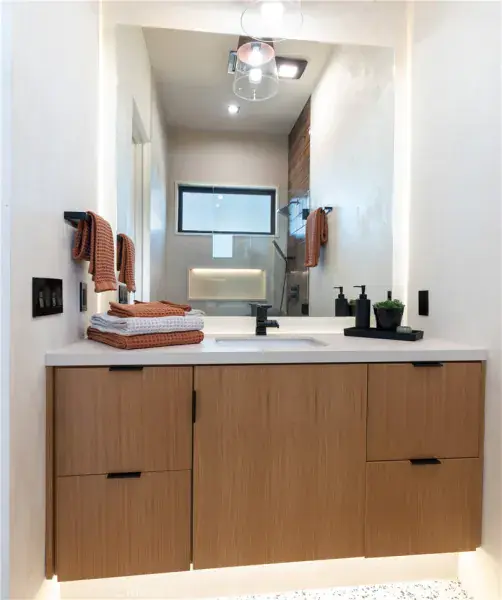 The resort style backyard features a beautiful inground pool and privately fenced backyard while transitioning into the great room and chef’s kitchen for easy entertainment. The custom kitchen features a professionally designed 3-D island, handmade cabinetry, countertops imported from Spain, premium Fisher & Paykel and Bosch appliances. The bathrooms are finished with elegant Italian terrazzo flooring and imported tile.