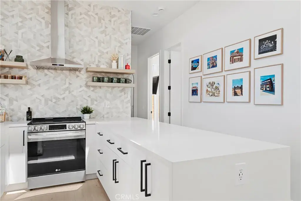 An automatic gate opens to a concrete driveway leading to an attached carport. Interior finishes include recessed lighting, linear air distribution, and a custom entertainment wall with floating shelving. The kitchen is designed for both function and aesthetics, featuring new stainless steel appliances, a 12-foot peninsula with breakfast bar seating, custom cabinetry extending to the ceiling, open shelving, a vent hood, and tiled accent walls.