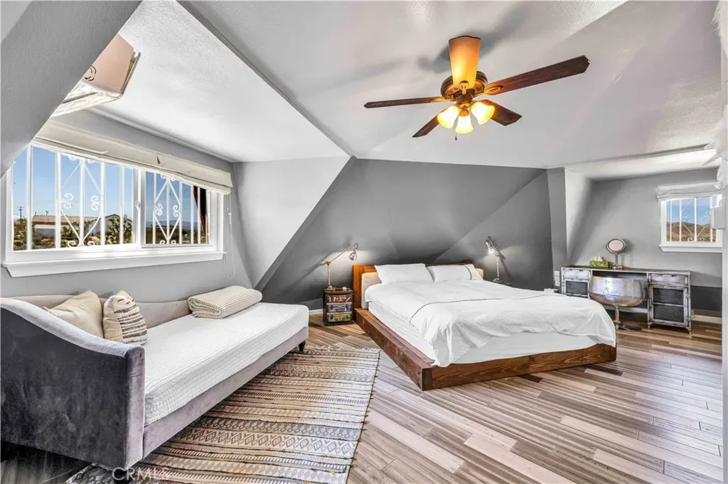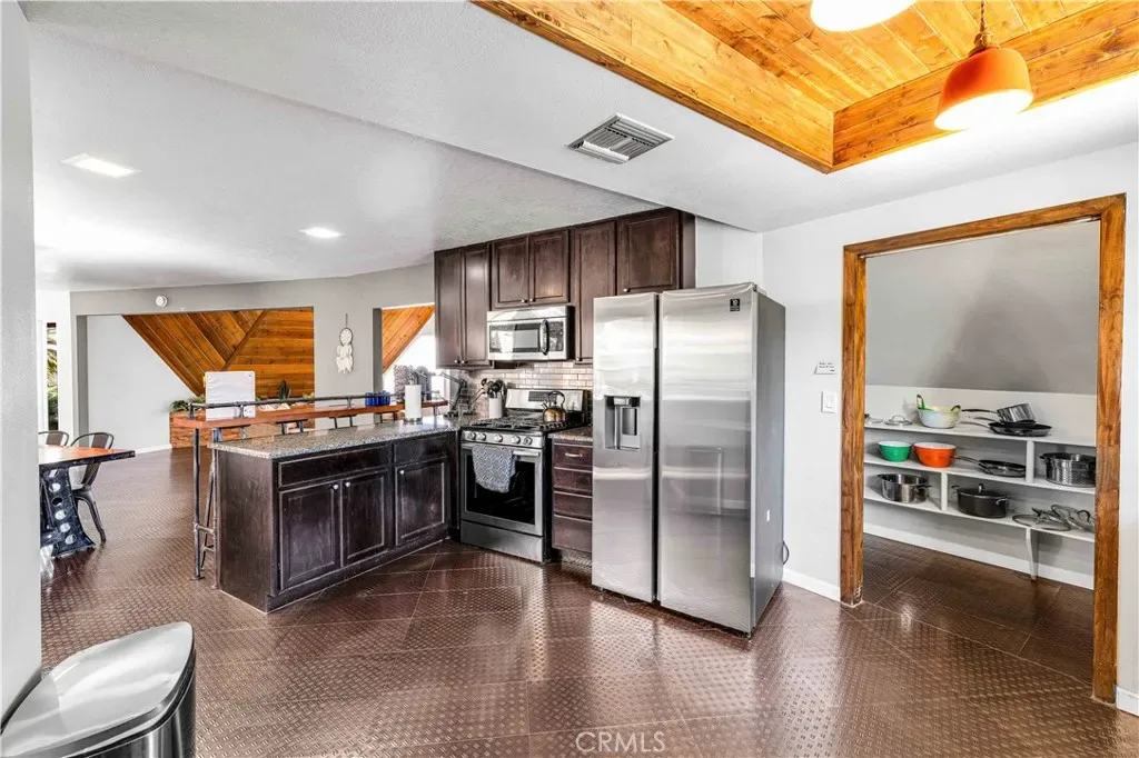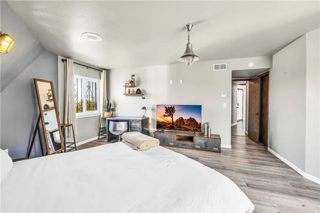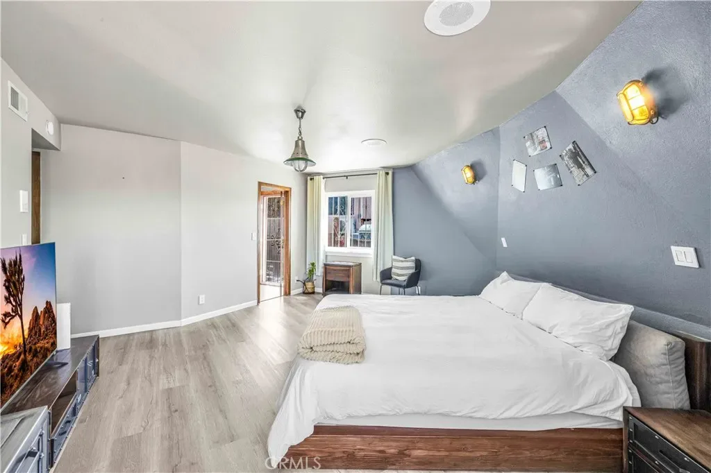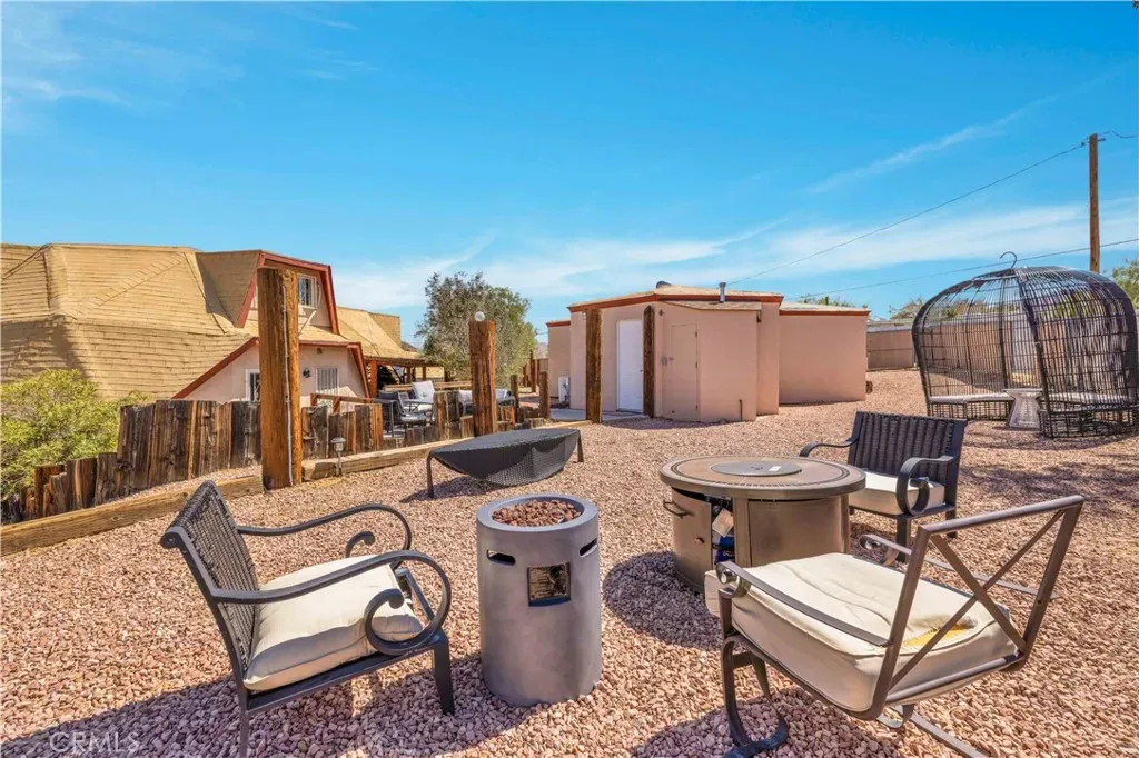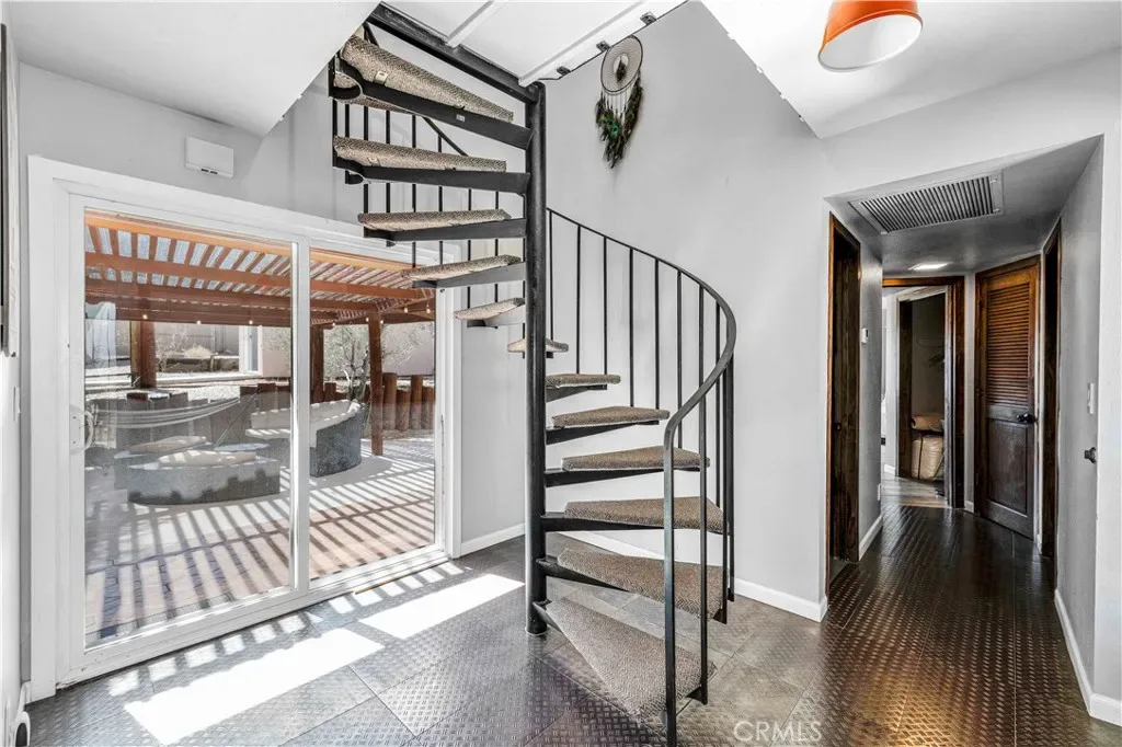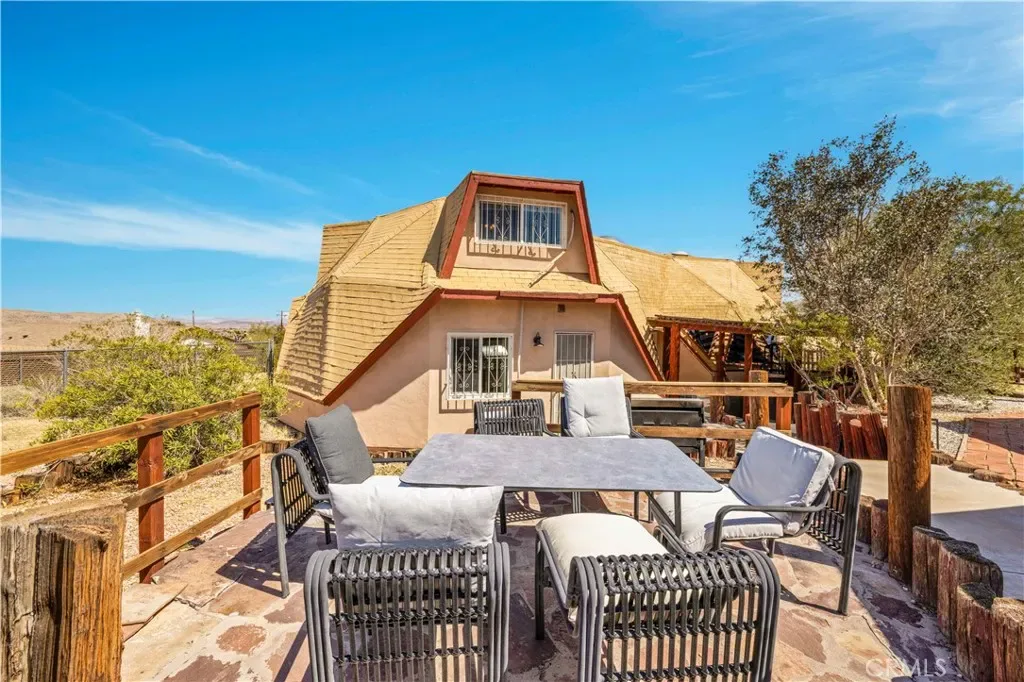 This rare and unforgettable dome-style home is a permitted short-term rental located just minutes from Downtown Joshua Tree and the entrance to Joshua Tree National Park—making it a prime location for both investment and personal use. Sitting on 1.25 acres and being sold fully furnished, this property features a large main home, a converted detached ADU, and a massive spa retreat area that makes it a standout in the high desert. As you arrive, the unique dome architecture immediately catches your eye. Step inside to discover a completely remodeled interior with a cool industrial vibe and eye-catching wood-wrapped hexagon walls that accentuate the character of the dome design. The main living area is expansive, open to the kitchen and dining room, with soaring ceilings and abundant natural light. The kitchen is equally impressive, with plenty of cabinet space, breakfast bar seating, and a walk-in pantry. A dedicated laundry room is conveniently located off the kitchen. Downstairs, you’ll find two spacious bedrooms and two full bathrooms, including the primary suite, which features a fully remodeled ensuite bath and direct access to the spa area for ultimate relaxation. Head up the custom metal spiral staircase to the third oversized bedroom, loft area with extra sleeping space, and another full bathroom, all with views overlooking the living space below. Step outside into your cross-fenced spa sanctuary, where you’ll find a massive in-ground spa, BBQ area, and plenty of lounge seating to take in the stunning desert views and starry night skies. The converted detached garage serves as a bonus ADU, complete with a living room, kitchenette, large bedroom, and full bathroom. Additional perks include leased solar panels for energy efficiency and ample space on the 1.25-acre lot for privacy and future possibilities.Whether you’re looking for a turnkey short-term rental, multi-unit investment, or a unique Joshua Tree escape, this fully furnished, high-style dome property is a rare find. Come see it in person and experience the magic for yourself!