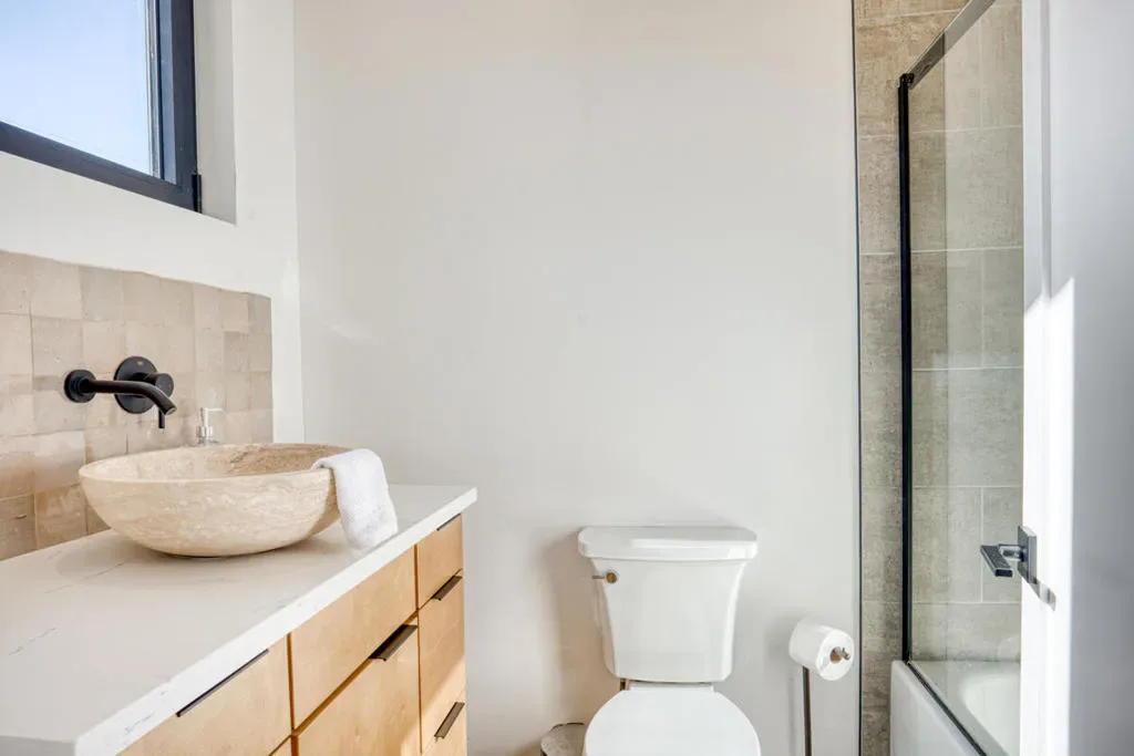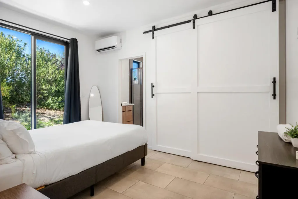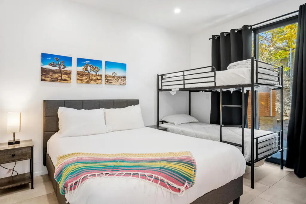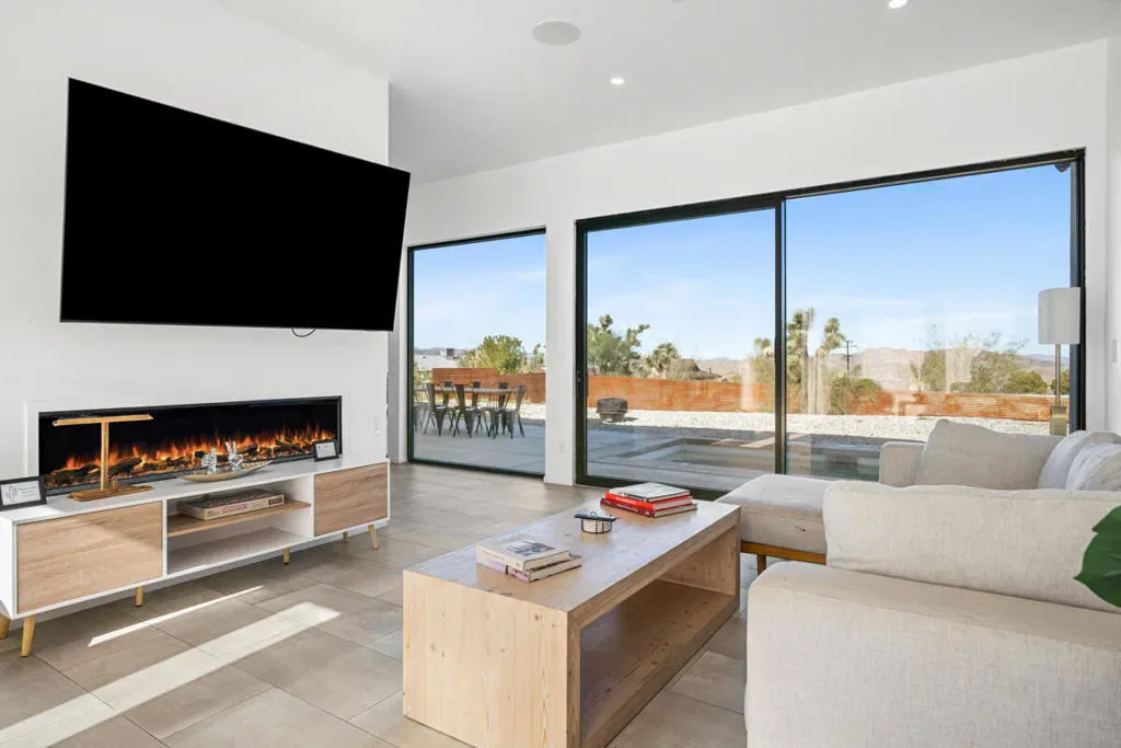 Modern 2021-built home with floor-to-ceiling German-imported Arka windows, paid-off premium solar, and stunning mountain & desert views from every room. This contemporary retreat blends high-end design with exceptional comfort, offering a bright, open layout and top-tier finishes throughout. Perfect as a full-time residence, desert getaway, or turnkey short-term rental–with the option to assume the existing successful Airbnb listing and furnishings (additional price). Inside, enjoy a beautiful modern kitchen featuring quartz countertops, tiled backsplash, sleek cabinetry with soft-close drawers, open shelving, and a large wine fridge. The spacious living area includes an electric fireplace/heater, built-in Sonos ceiling speakers, dimmable lighting, and seamless indoor-outdoor flow. All four bedrooms are generously sized, and three feature en suite bathrooms, ideal for privacy and guest comfort. Barn doors on closets, keyless entry, and a tankless water heater add both style and convenience. Go outside to the expansive nearly 1/2-acre lot with a 15′ x 8′ propane-heated 4-ft deep pool (dedicated propane tank & autofill), large concrete patio with grill, and wide-open desert skies. Additional highlights include a 2-car carport, large finished storage room, an EV charging port (NEMA 14-30 & 14-50 capacity), very efficient 6 mini split/3 condenser heating and AC system, low-voltage speaker wiring, virtually no electric bills, WiFi connection, and new washer/dryer. Located just 10 minutes to Joshua Tree National Park, 5 minutes to Downtown Joshua Tree, and a 3-minute walk to the Friendly Hills hiking trail, home to occasional Mojave Tortoise sightings. With high-end construction and a proven rental history this property is an exceptional opportunity in one of the desert’s most desirable locations.
