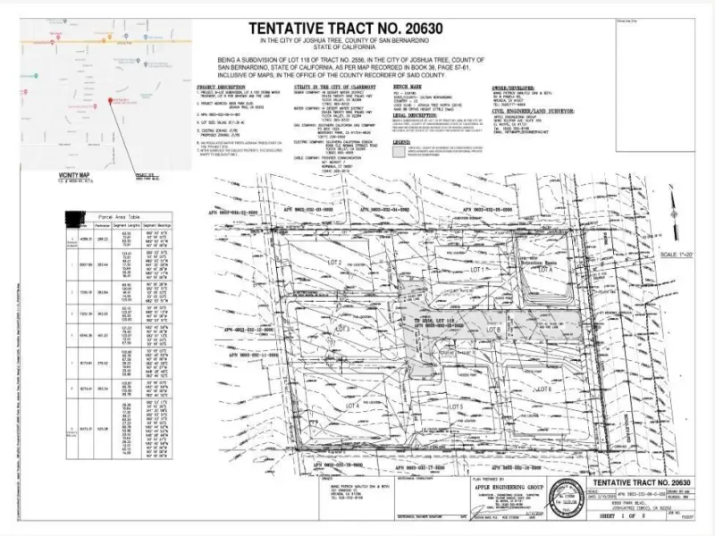 Tentative tract map vacant land subdivision planned with reports included. Ideal for a contractor to build out 6 infill homes – with homes already developed on all sides. Soaring vistas and central location right on Park Blvd. Park Blvd is the main thoroughfare to the Joshua Tree National Park. Joshua Tree has become a internationally known zip code with more million dollar homes being sold than ever before. Designer new constrictions a modern revival remodels can be seen throughout the area. The area is established for solid investment. JT has become a trendy enclave for Hollywood celebrities, artist’s, musicians and more. The Joshua Tree National Monument sees about 3 million tourists annually. Not far from the 29 Palms Marine Base, Copper Mtn College, and the Hi-Desert Medical Center. New businesses, new hotels, new bars, new grocery stores have sprung up in the area. Save time an money with a turn key subdivision in a prime location. The 45 minutes to Palm Springs. 2 hours and 15 minutes to Los Angeles. APN: 0603-032-06-0000 For all questions on building and uses contact the county planners. Address is legally assigned. Don’t Wait – Call Now!