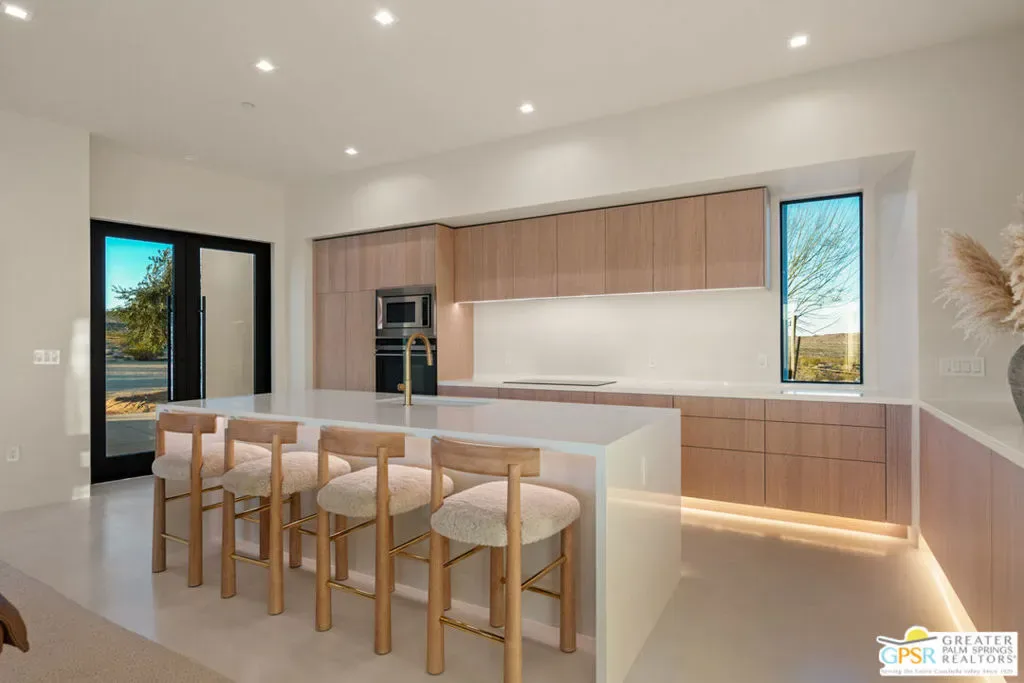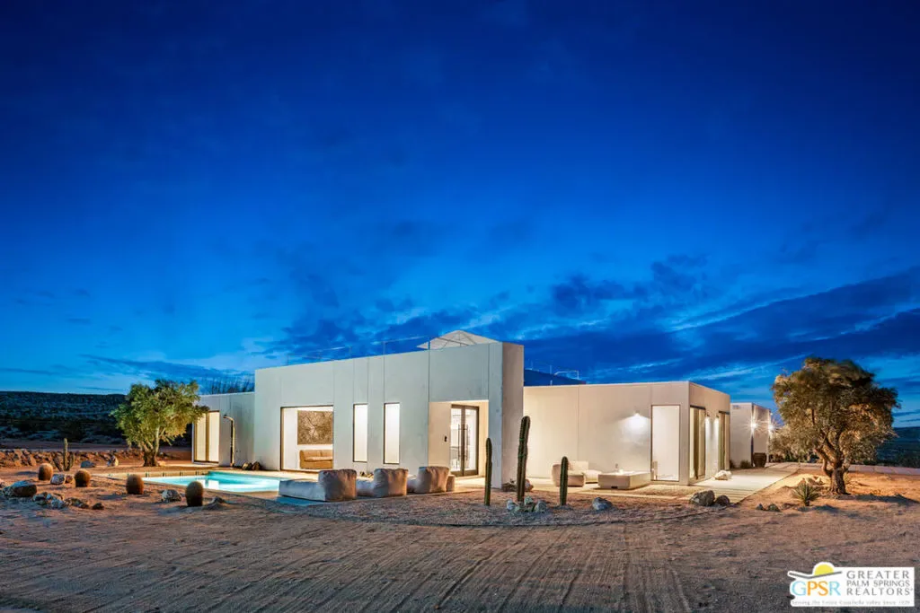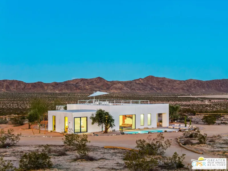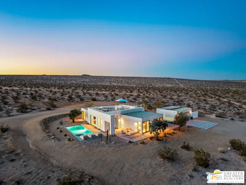 Panorama Valley introduces the FIRST completed residence within a limited SIX-home architectural reserve in Joshua Tree an infrastructure-first offering defined by permanence and scale. Set on approximately six private acres, this newly constructed 4-bedroom, 4-bath estate was completed in 2026 with secured water access and power installed prior to construction. In a market where utilities are often improvised, this foundational investment distinguishes the property and reinforces long-term viability. It is not simply new construction; it is deliberate development. The architecture draws from minimalism clean geometry, disciplined proportion, and honest materials. Low horizontal volumes rest quietly against the desert floor, framed in steel and finished in smooth Venetian stucco and concrete tones that mirror the surrounding landscape. Expansive steel-framed glazing defines the structure, allowing light to shape the interiors throughout the day. Polished concrete floors, restrained detailing, and an open-plan great room emphasize volume and clarity rather than ornament.Large glass windows dissolve the boundary between interior and exterior, extending the living space into a protected courtyard anchored by a private pool and spa. The custom kitchen, centered around a waterfall island with integrated appliances, maintains the home’s minimalist language while offering functional precision. Each bedroom is privately oriented to capture open horizon views, while spa-inspired baths incorporate clean lines and architectural windows that frame the desert sky. A rooftop terrace elevates sunset viewing, and a fire courtyard and dedicated outdoor cinema complete the experiential design amenities integrated into the site rather than imposed upon it. Positioned minutes from Joshua Tree National Park yet intentionally removed from density and light pollution, Panorama Valley offers privacy without isolation. As the first completed home within a six-residence enclave, it establishes the architectural and infrastructural benchmark for the development. For buyers accustomed to luxury and seeking scale, clarity, and long-term value in the high desert, this residence represents a rare convergence of land, design, and permanence. Engineered modernism, executed with intention.