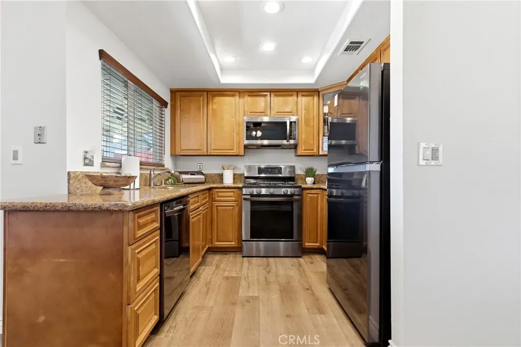 The kitchen is both stylish and functional, complete with granite countertops, stainless steel appliances, and recessed lighting—ideal for everyday living and entertaining. Both bathrooms have been tastefully updated with modern finishes.