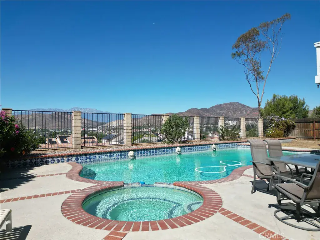 The backyard is designed for both entertainment and tranquility, complete with lush landscaping, a heated pool, a soothing spa, and multiple spots to enjoy the panoramic vistas.