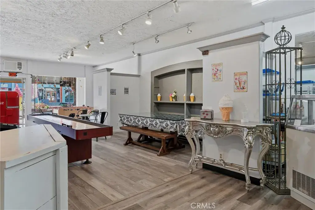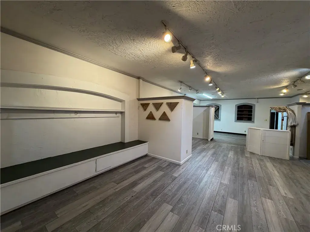 The space features an open layout with partial divider walls, multiple built in shelves, and new flooring extended all the way through to the back. There is a large additional space in the back along with 3 sinks, a kitchenette, and bathroom.