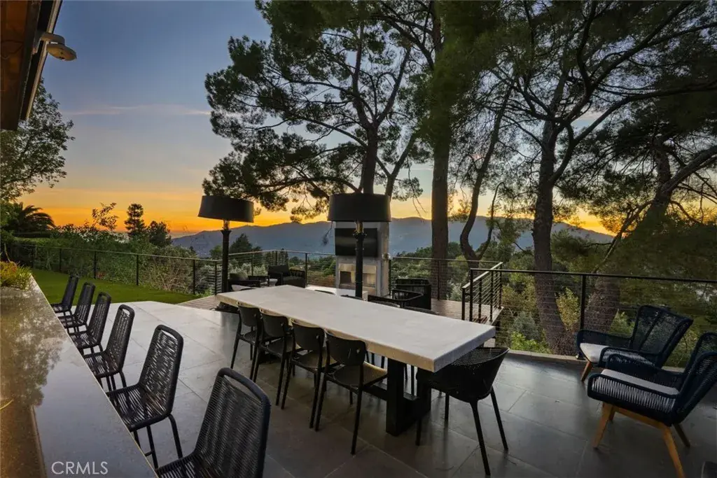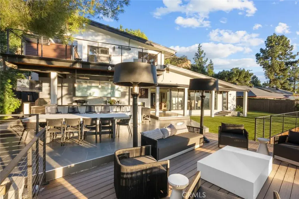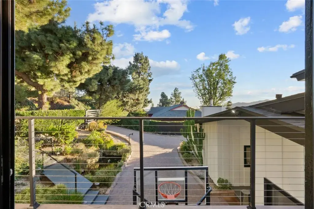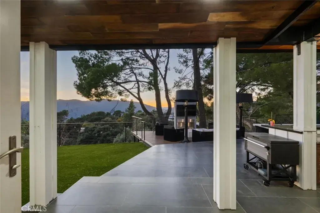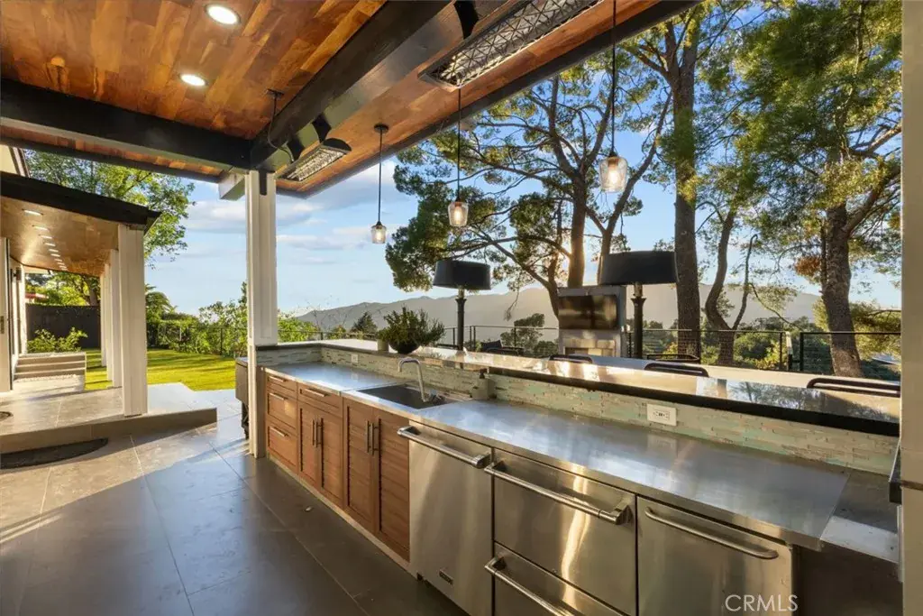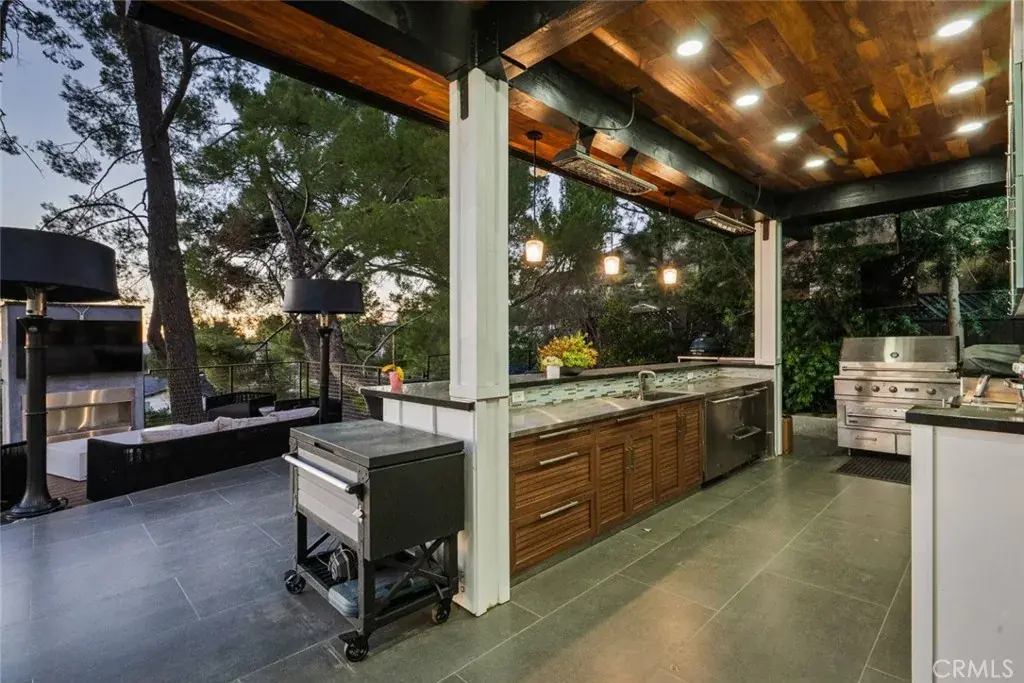 The landscaped grounds offer privacy and include a koi pond, balconies, and a custom deck ideal for outdoor dining and entertaining with Downtown Los Angeles views. The outdoor kitchen is equipped with a 42 inch Viking grill, Viking dishwasher, 24 inch U Line beverage center, Lynx drawer refrigerator, Scotsman ice maker, Avantco deep fryer, and Ooni pizza oven.