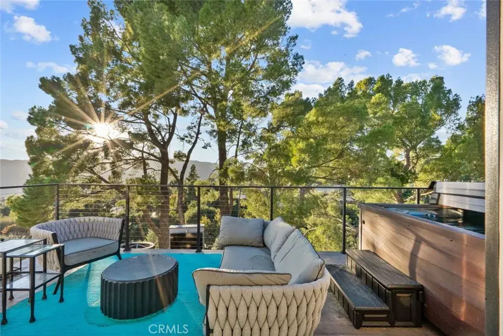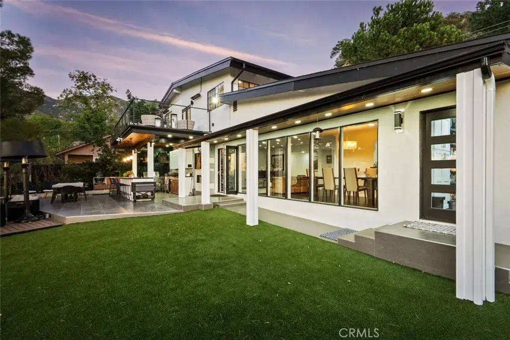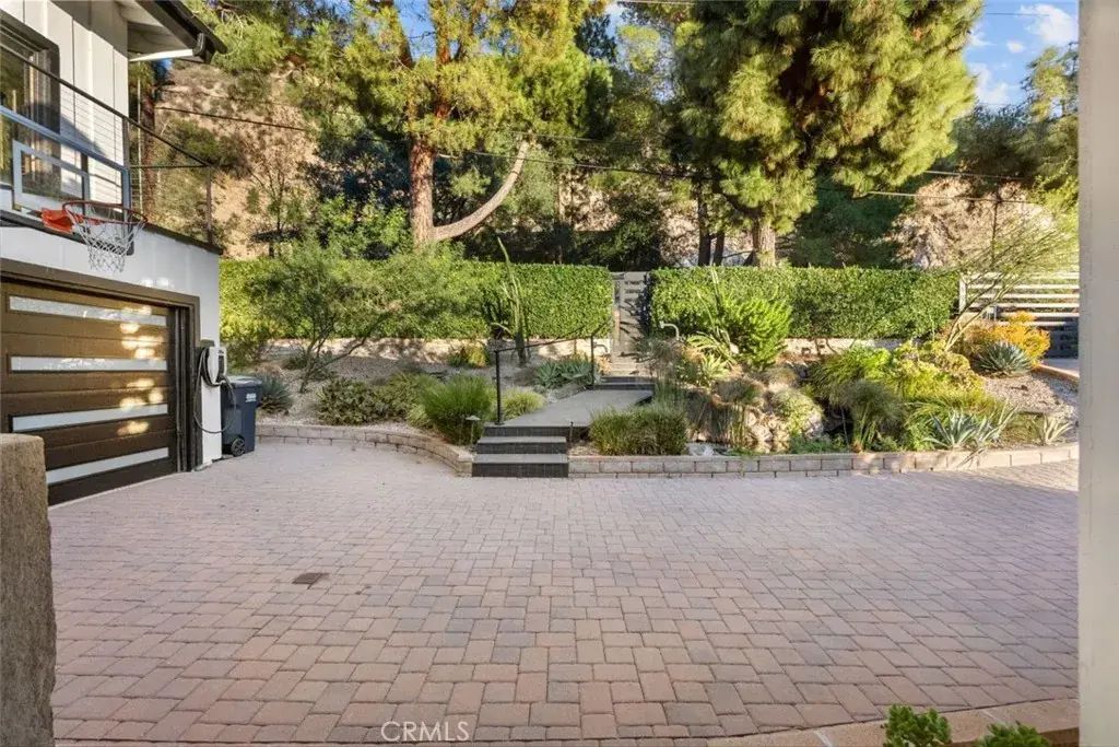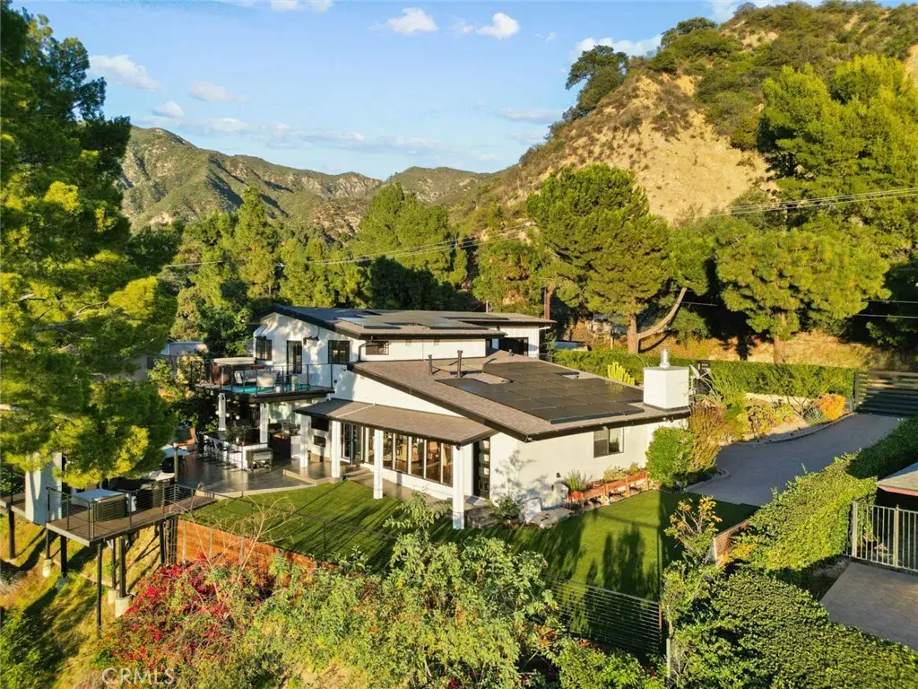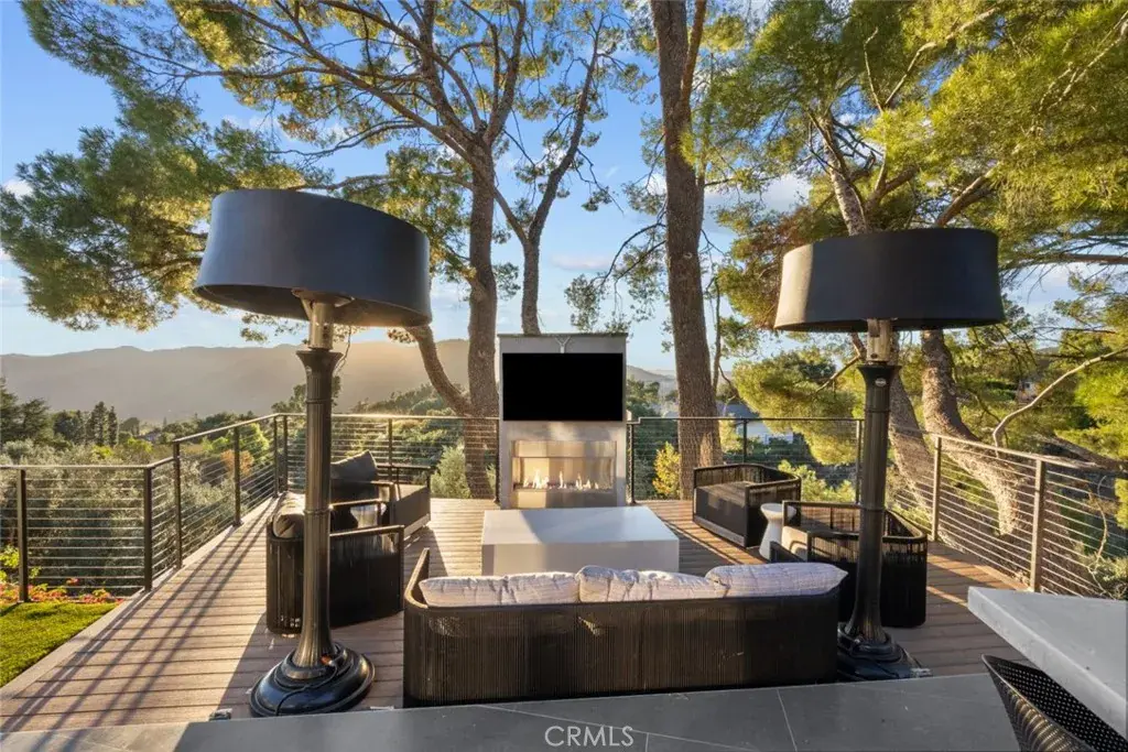 The landscaped grounds offer privacy and include a koi pond, balconies, and a custom deck ideal for outdoor dining and entertaining with Downtown Los Angeles views. The outdoor kitchen is equipped with a 42 inch Viking grill, Viking dishwasher, 24 inch U Line beverage center, Lynx drawer refrigerator, Scotsman ice maker, Avantco deep fryer, and Ooni pizza oven.