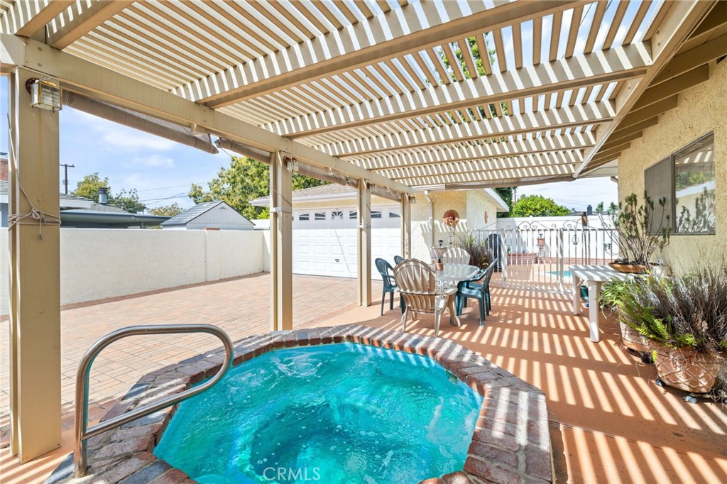 Detached 2-car garage with built-in cabinets and epoxy flooring. Exterior features include a gated pool, covered patio with spa, long driveway, and automatic sprinkler system in the front yard.