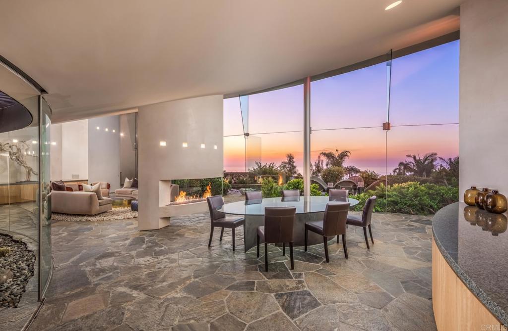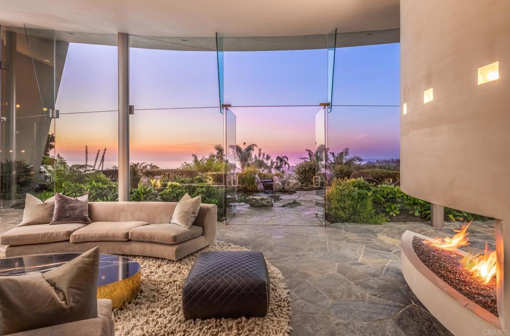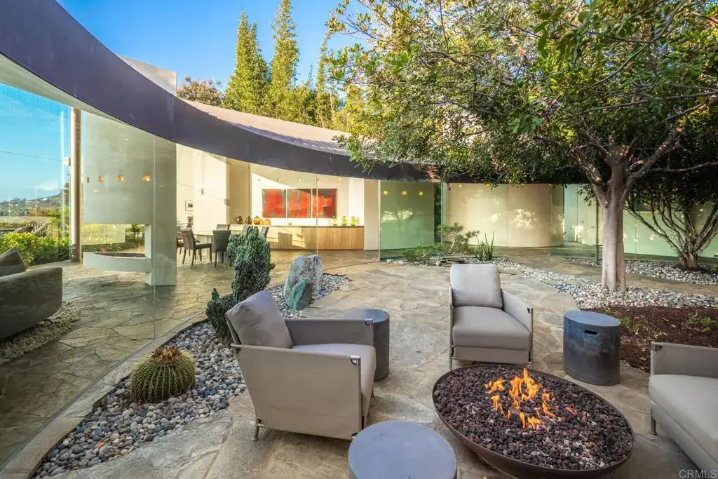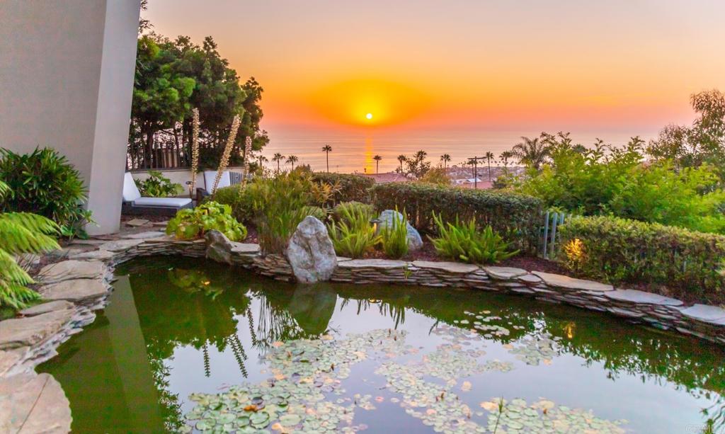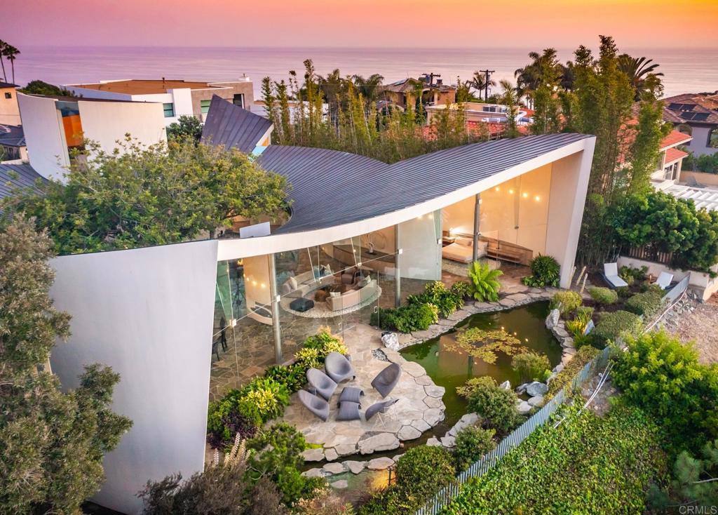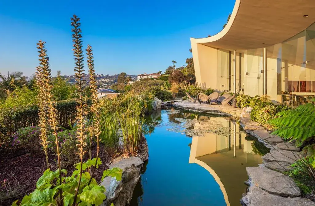 Available March 5! Superior Bold and Dynamic Contemporary Masterpiece. This unique distinctive free form structure rests upon the lush hillside within La Jolla framed byCoastal Vistas. Tucked away in a quiet Cul De Sac. Expansive single level approx 4,900 SF home, 3 bedroom, 3.5 baths with office, artist/loft/home theatre. 20 Foot floor to ceiling towering glass walls are both artistic and functional and act as a framing device for the unique structure itself. Fully enclosed private courtyard with protected glass walls, seamless indoor and outdoor living spaces open to expansive Coastal Vistas. Every custom detail is part of the whole ‘LIVING IN ART” experience. Open Living/Great Room/Dining Room accented by crushed glass free form fire feature. MainSuite with disappearing doors and wall panels. Spiral staircase leads to artist retreat/theatre. Custom inset cabinets blend seamlessly into walls throughout. Gallery custom Kitchen with rough stone flooring and granite countertops. Backyard is completed by babbling water brook, tropical koi pond and natural canopy trees. Fully Furnished Luxury Long Term Rental. This barrier free design captures coastal views, downtown La Jolla, and theGolf Course. Stylish, Ultra Contemporary, Luxury Private Estate that connects to its natural surroundings.