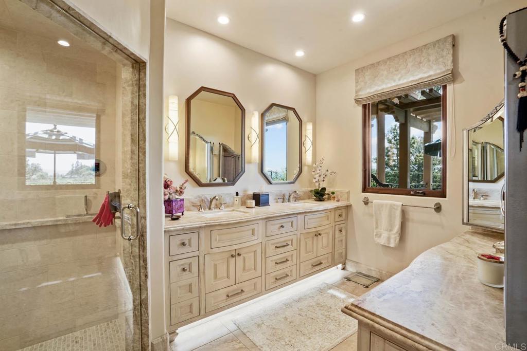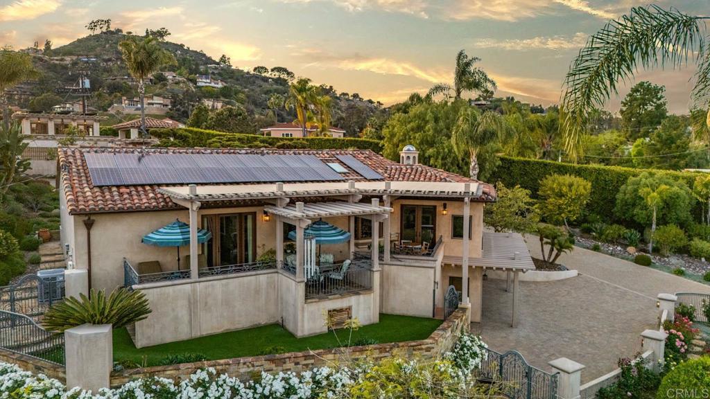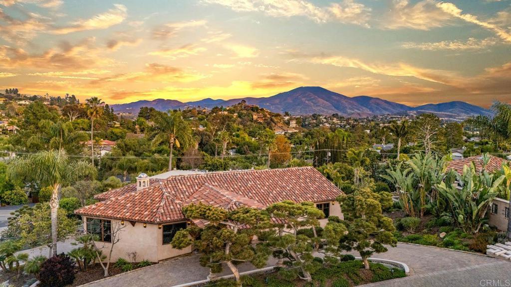 Discover an unparalleled opportunity in Mt. Helix with this expansive 2.41-acre estate, comprising a 5,872-sq-ft Santa Barbara–inspired main residence, a 2,428-sq-ft meticulously remodeled casita and a separate 0.77-acre ready-to-build vacant lot. The main residence blends architectural elegance with resort-style amenities, featuring interconnected octagonal structures and a dramatic tower room offering 360° panoramic views. Formal and casual living areas complement a chef’s kitchen and a primary suite that opens to a wraparound terrace. An executive office adds functionality, while the lower level includes versatile bedrooms, auxiliary flex rooms, and a gym/storage space. Outdoors, botanical gardens with over 100 rose varieties, four tranquil fountains, and diverse specimen trees create a serene setting. Multiple pools and spas, including an elevated spa with sweeping views to the east, south, and west—encompassing Downtown San Diego and Point Loma—provide relaxation, while expansive terraces and a fully equipped outdoor kitchen enhance alfresco dining experiences. Centrally located between the pools, a two-story pool house features multiple bathrooms, a rejuvenating sauna, and the “Las Brisas” guest retreat with a detached gym/yoga studio and direct spa access. The casita, extensively renovated in 2018, offers a chef’s kitchen, hardwood floors, exposed wood beam ceilings, and a separate downstairs studio with a full bath and kitchenette. Completing this exceptional estate is a generous buildable lot equipped with a private water well currently used for irrigation, offering sustainable landscaping and potential for future development or added privacy. This estate masterfully combines architectural elegance, luxurious amenities, and breathtaking views, offering a one-of-a-kind living experience in the prestigious Mt. Helix community.
