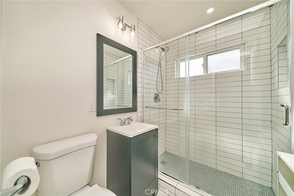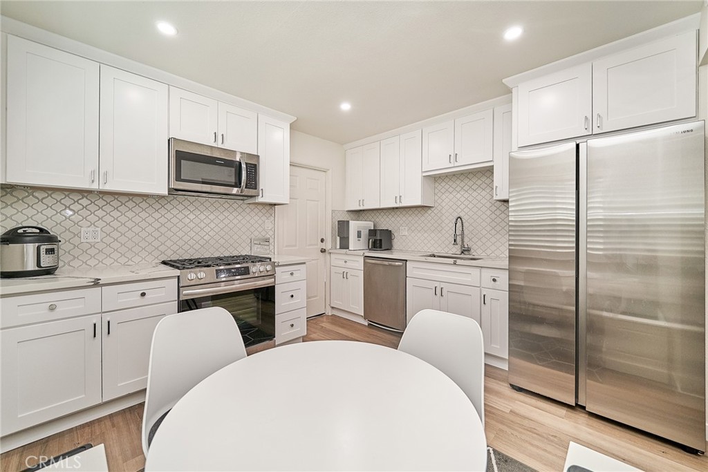 The living room boasts fresh paint, recessed lighting, and modern wood vinyl plank flooring. The remodeled kitchen includes quartz countertops, white shaker cabinets, and stainless steel appliances. First-floor bathroom has a glass shower door, second-floor bathroom features a smart toilet, and all closets have been updated.