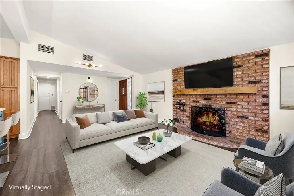 Beautiful 4 Bedroom 2 Bath Single Story Mid Century La Mirada Home in a Quiet Cul-De-Sac Neighborhood. This amazing home isn’t a flip, it was a family home that has been lovingly cared for by the people who actually lived there. We think the difference is striking. Upon entering, your friends will be jealous of the open concept great room, perfect for everything from simple family dinners to entertaining a house full of guests. The remodeled kitchen portion includes a huge custom island, quartz countertops, natural cabinets, white subway tile backsplash, stainless gas range, microwave, dishwasher, laminate flooring, dramatic pendant lights, and recessed lighting. The living area portion of the great room boasts vaulted exposed beam ceilings, laminate flooring (same as kitchen), inspired light fixtures, exposed brick fireplace, and a new wood mantle. There has been an intentional effort to keep the great room area warm and welcoming while still light, clean and contemporary. Moving down the hallway that leads to the bedrooms, you’ll first come across a very convenient 3/4 bath that doubles as guest restroom and on suite bathroom for Bedroom #2. Bedrooms #2 and #3 feature laminate flooring, closet storage, vaulted ceilings, and modern ceiling fans. Bedroom 4 is on the other side of the hallway and features carpet flooring, vaulted ceilings, and a newer ceiling fan. The primary bedroom is also on this side of the hallway, and in addition to vaulted ceiling, a spacious closet, custom accent wall, and newer ceiling fan, it also sits directly adjacent to the remodeled full bathroom. The remodeled full bathroom has new tile flooring, vanity, light fixtures, plumbing fixtures, and a brilliant shower/tub with with subway tile and custom recessed shower shelf. The entire home has new neutral paint plus central AC and heat. There is ample vehicle storage with a two car garage plus an oversized driveway. The home provides a Laundry room directly off the kitchen with washer hookups, electric and gas dryer hookups, as well as convenient cabinet storage. Around back, the yard area features a slightly elevated wooden deck with sunshade, perfect for outdoor dining on a warm Spring evening. Address feeds La Pluma Elementary, Benton Middle, and La Mirada High School. Close proximity to shopping, groceries, the La Mirada Theatre, La Mirada Regional and Splash Waterpark. This will be a very clean sale with no seller contingencies so hurry because it won’t last long.