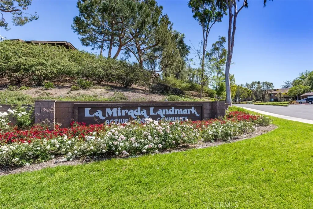 Great location within the popular Landmark+55 retirement community! What makes this location so ideal is the easy access from the garages and the privacy of being in the back of the building next to a large sloped green belt area directly behind the home. Therefore, it is a very quiet location. It is an upper unit but it is ground level with the back of the unit, including a nice patio area that is part of the property. Another important feature is this unit has two garages where typically most units in Landmark only have one garage. This section of Landmark was built in 1981 and has gas connections unlike the units that were built in 1975. The entry has vaulted ceilings with recessed lighting and skylight, creating a nice spacious living room area. The covered patio extends off the living room and is a very private area that enjoys views of the greenbelt. The kitchen and bathrooms have been beautifully updated and both bathrooms have skylights. The primary suite also has two closets. The tile floors in the living room, kitchen and hallway are a special tile designed to not get too hot or cold. Refrigerator, washer and dryer are included in the sale. Landmark is a special community offering a variety of amenities starting with 24/7 guarded security. The large clubhouse offers a variety of different events and activities, supplemented by tennis courts, large pool/spa area, pickleball court, putting green, fitness center, library, etc. Also directly across from La Mirada Golf course and Regional Park.