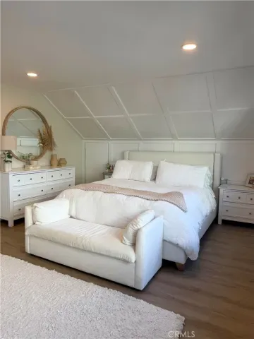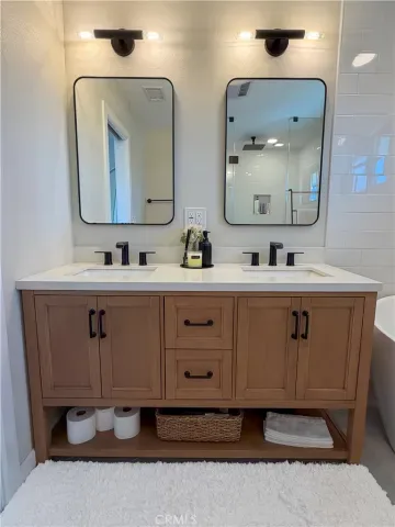 The spacious primary suite features a relaxing retreat with a walk-in closet and a beautifully upgraded bathroom featuring dual sinks, a soaking tub, and a separate walk-in shower.