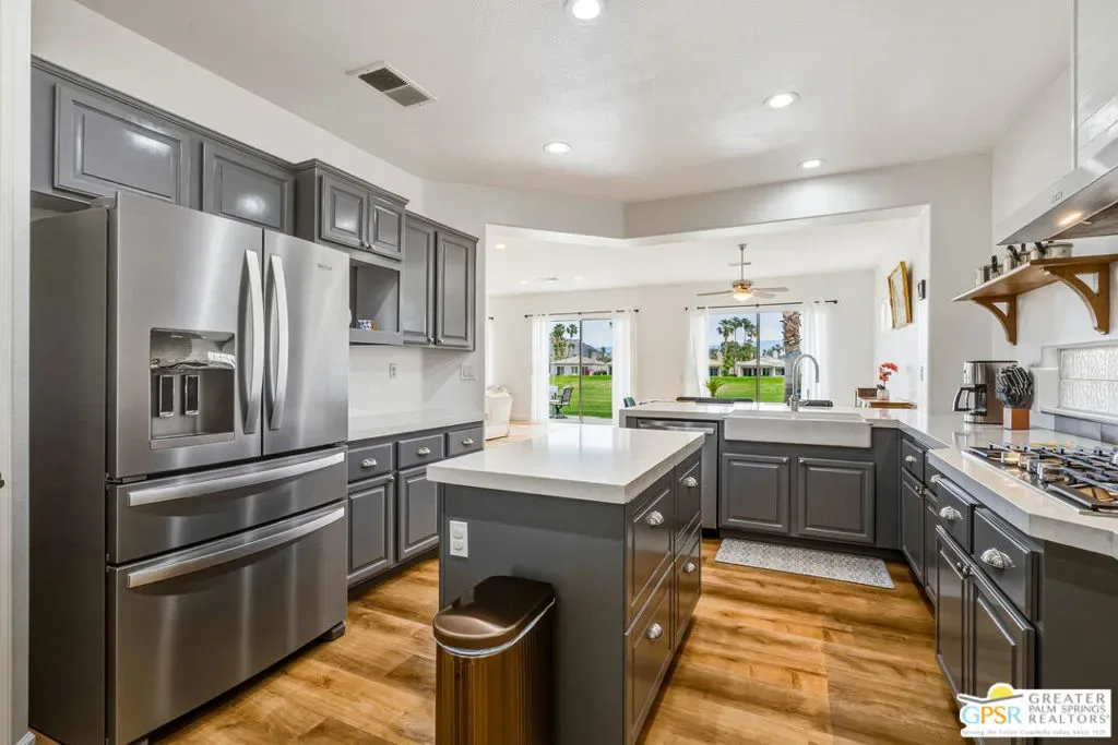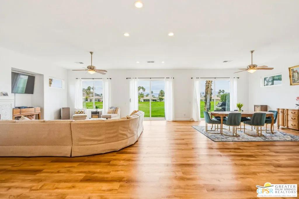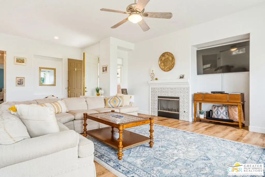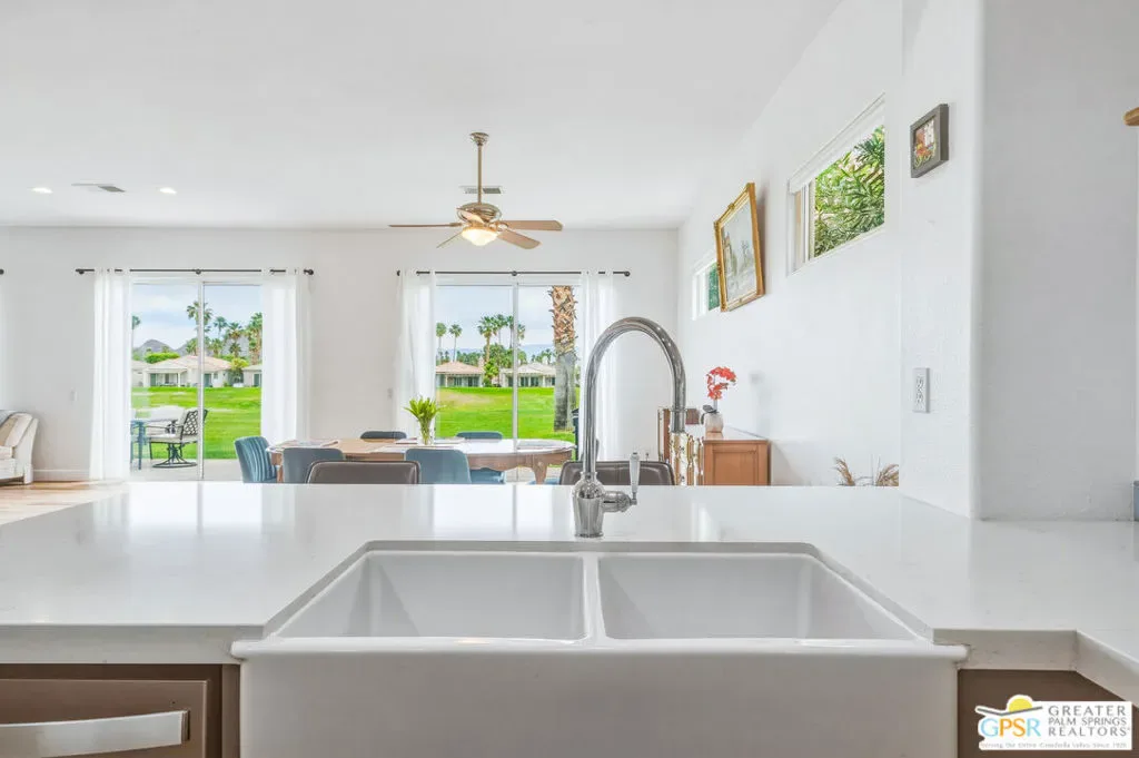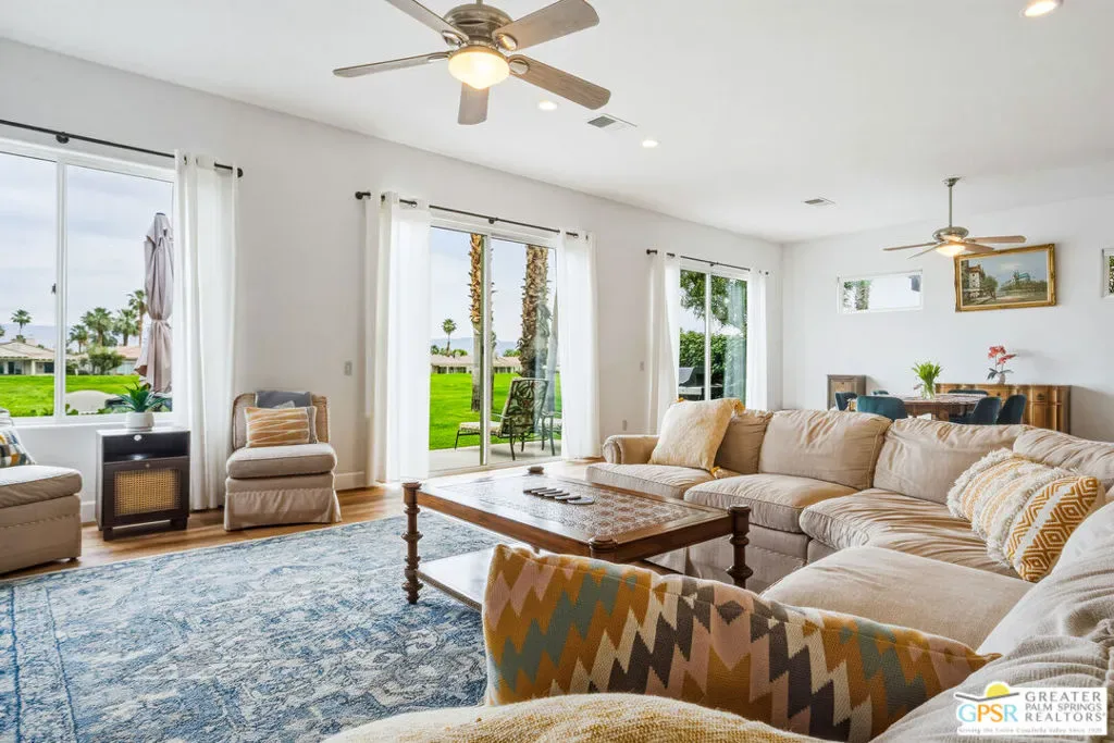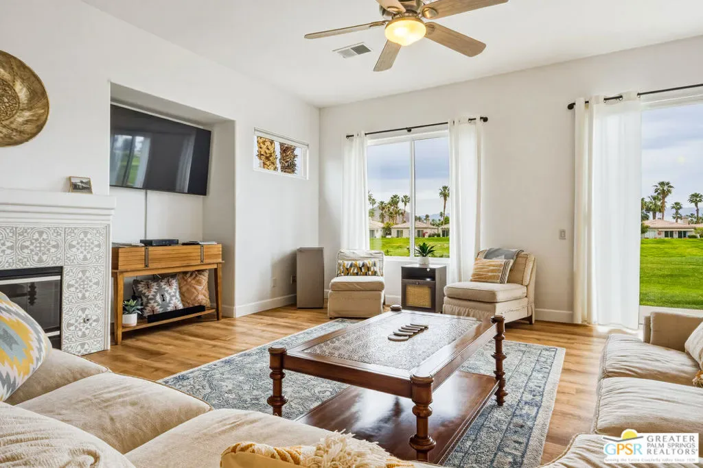 Located in the scenic community of Duna La Quinta, this beautifully appointed 3-bedroom, 3-bath casita-style home offers 2,412 sq. ft. of comfortable desert living. Enter into a light-filled interior designed for both relaxation and entertaining.The expansive great room and dining area showcase stunning mountain and fairway views, complemented by luxury vinyl wood-look flooring, a cozy fireplace, a built-in entertainment niche, and dual sliding doors that open to the back patio. The updated kitchen is a chef’s delight, featuring quartz countertops, a center island, stainless steel appliances, and a 5-burner gas stove. The spacious primary suite is a private retreat, accessed through double doors and offering direct outdoor access. The en-suite bath includes dual vanities, a soaking tub, a shower, and a generous walk-in closet. Guests will appreciate the attached casita with its own private entrance, complete with a serving bar, separate bath, and ample closet space, which is ideal for visitors or extended stays. Step outside to your back patio and unwind while taking in sweeping golf course views and breathtaking desert scenery. Residents of Duna La Quinta enjoy a gated community with pools and spas, greenbelts, and a dog park. Conveniently located near Old Town La Quinta, you’ll be just minutes from world-class dining, shopping, entertainment, hiking, golf, and tennis.