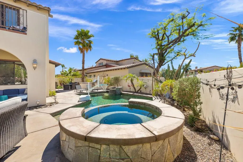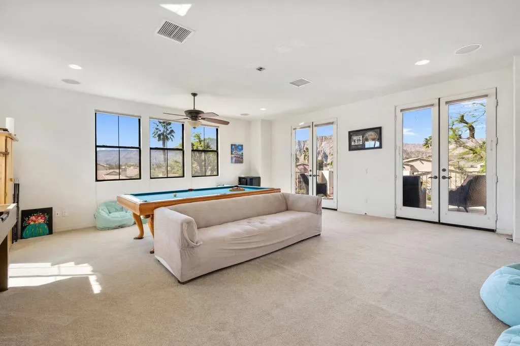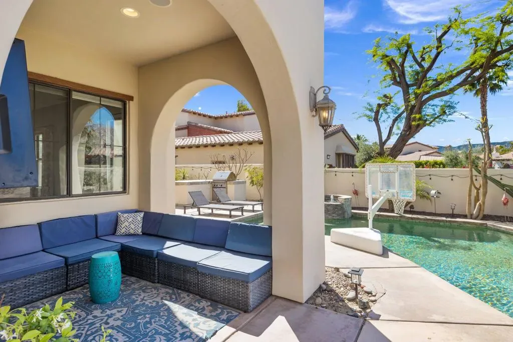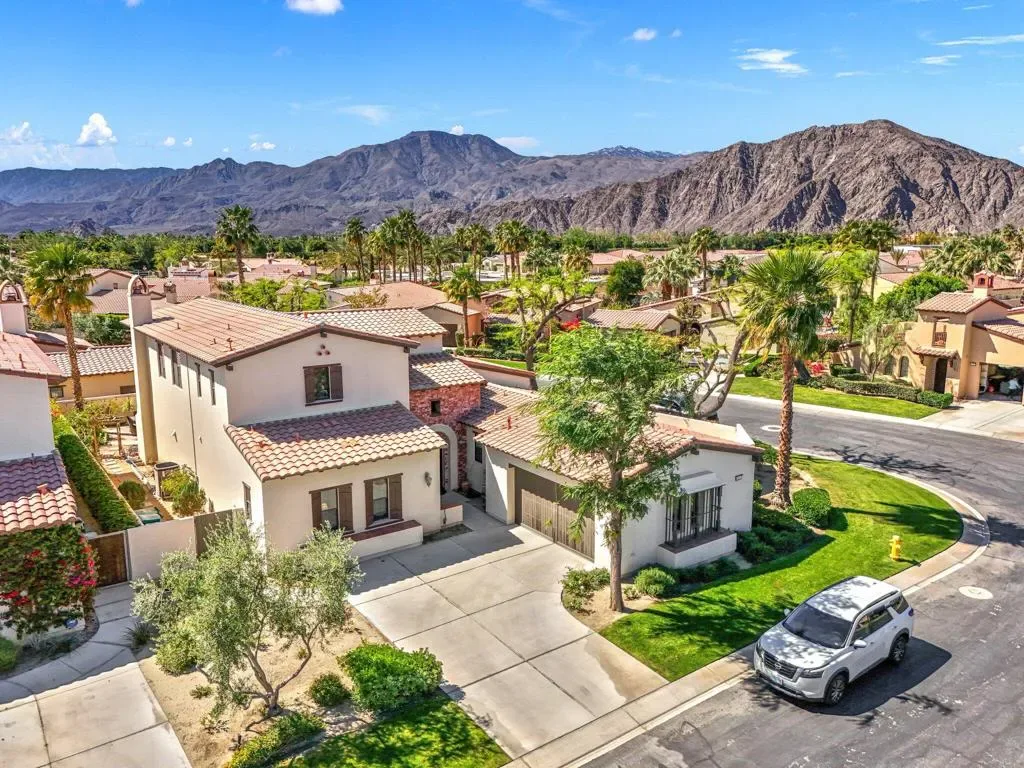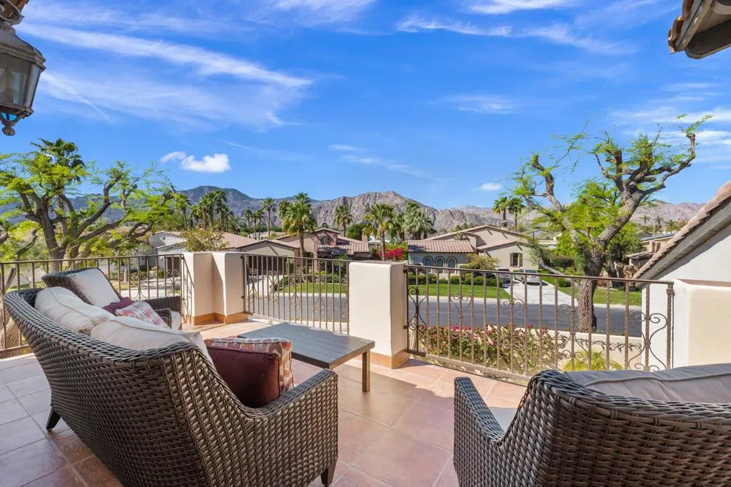 Discover the largest floorplan in the exclusive La Cantera community–an exquisite 4-bedroom, 4-bathroom residence situated on an oversized corner lot with breathtaking southern mountain views. This beautifully designed home offers a bit of Mediterranean charm with arched details and large neutral tile running throughout, offering an unparalleled desert retreat. Step inside to find rich wood cabinetry, granite countertops with a matching backsplash, and a walk-in pantry in the chef’s kitchen, equipped with high-end Thermador stainless steel appliances. Entertaining is effortless with a wet bar and an inviting open-concept layout. The main-floor primary suite is a private oasis featuring dual vanities, a separate tub and shower, with a secondary main floor bedroom including a private en suite- great for a home office or guest room. Upstairs, a spacious loft/bonus room offers a large screen tv for movie nights and leads to a private deck, where you can take in the panoramic mountain views from two sets of french doors. 2 additional upstairs bedrooms include mirrored closet doors, newer carpeting and share a spacious bathroom with dual vanities. Outside, the gorgeous rear yard is a true entertainer’s paradise, complete with a pool and spa, firepit, and a built-in BBQ island–perfect for relaxing under the desert sky. Located just minutes from world-class golf, dining, and shopping, this La Cantera gem offers the best of La Quinta living!