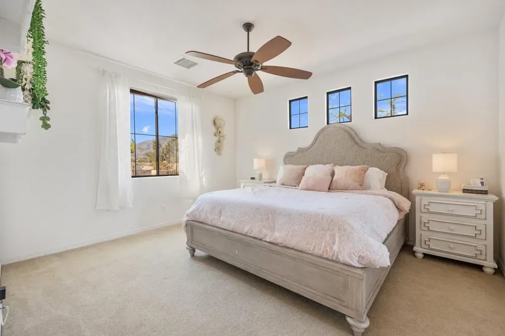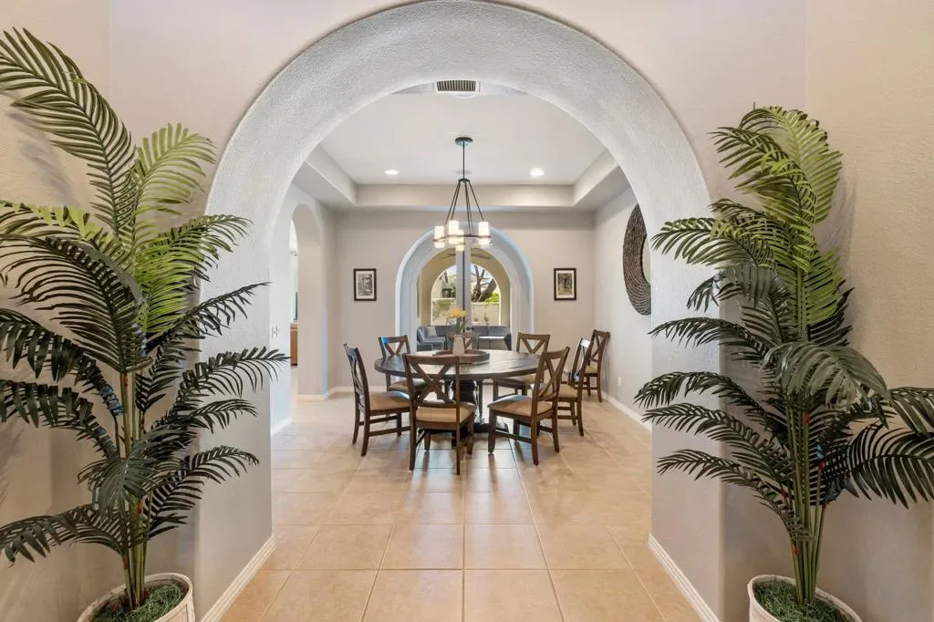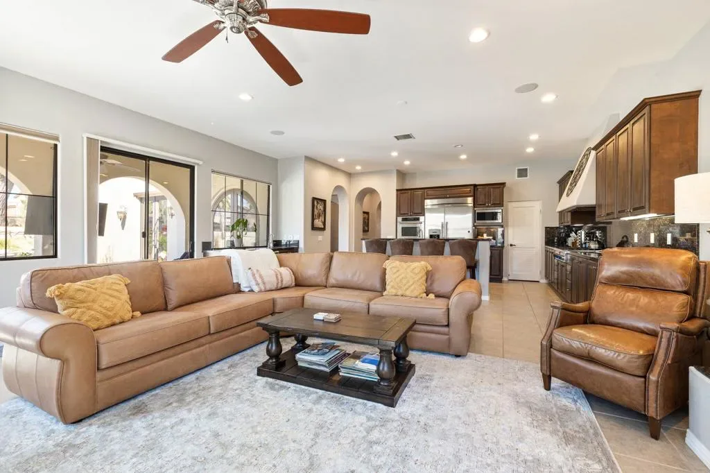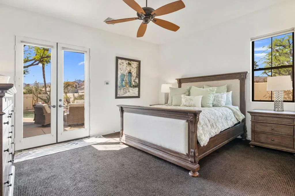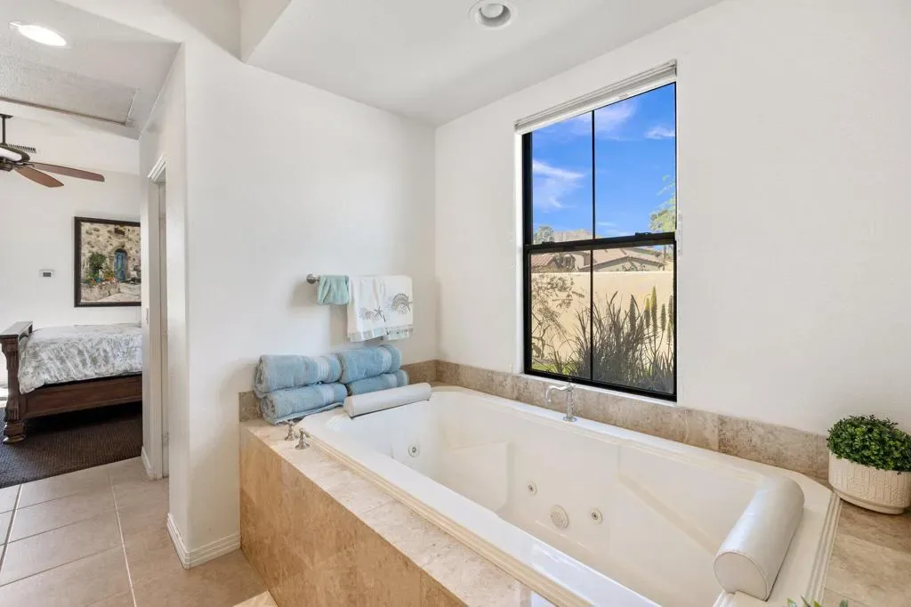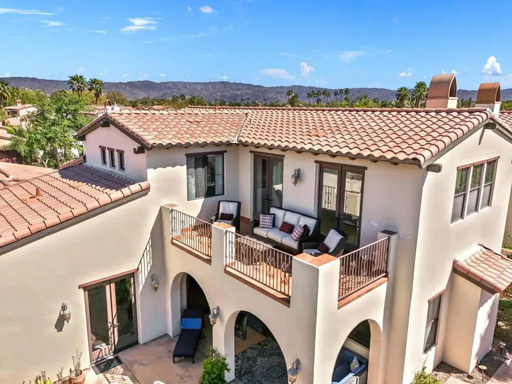 Discover the largest floorplan in the exclusive La Cantera community–an exquisite 4-bedroom, 4-bathroom residence situated on an oversized corner lot with breathtaking southern mountain views. This beautifully designed home offers a bit of Mediterranean charm with arched details and large neutral tile running throughout, offering an unparalleled desert retreat. Step inside to find rich wood cabinetry, granite countertops with a matching backsplash, and a walk-in pantry in the chef’s kitchen, equipped with high-end Thermador stainless steel appliances. Entertaining is effortless with a wet bar and an inviting open-concept layout. The main-floor primary suite is a private oasis featuring dual vanities, a separate tub and shower, with a secondary main floor bedroom including a private en suite- great for a home office or guest room. Upstairs, a spacious loft/bonus room offers a large screen tv for movie nights and leads to a private deck, where you can take in the panoramic mountain views from two sets of french doors. 2 additional upstairs bedrooms include mirrored closet doors, newer carpeting and share a spacious bathroom with dual vanities. Outside, the gorgeous rear yard is a true entertainer’s paradise, complete with a pool and spa, firepit, and a built-in BBQ island–perfect for relaxing under the desert sky. Located just minutes from world-class golf, dining, and shopping, this La Cantera gem offers the best of La Quinta living!