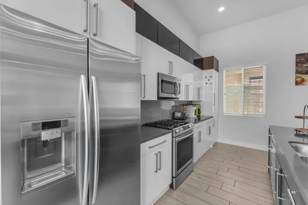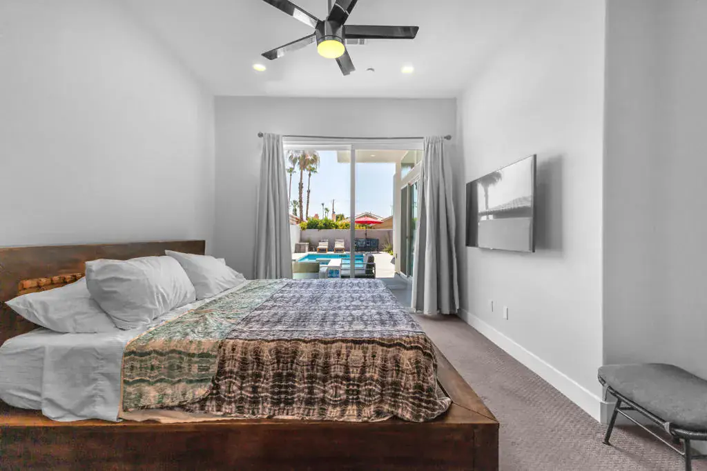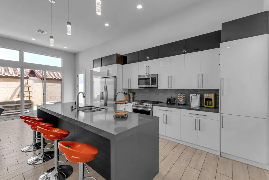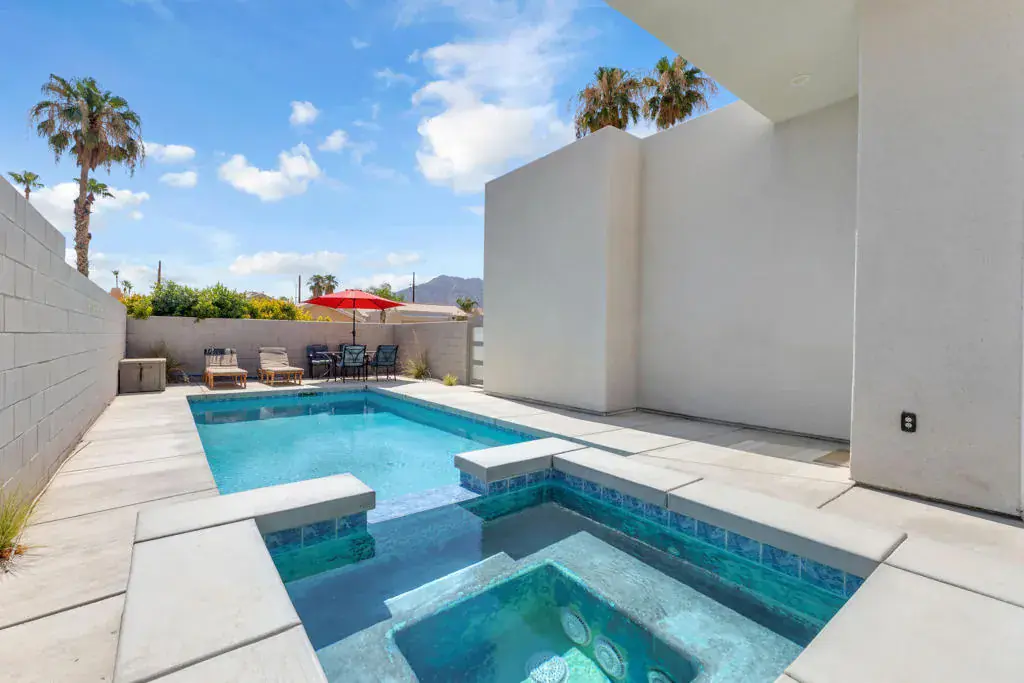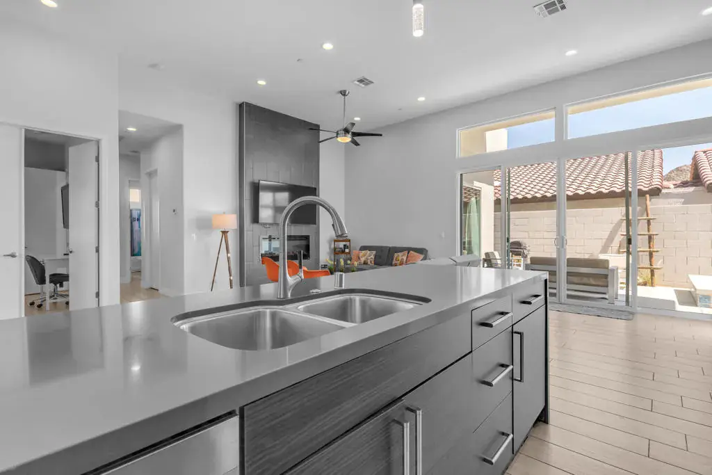 Discover this 4-bedroom home exuding modern sophistication. Constructed in 2018, this property boasts modern efficiency, natural gas connectivity, IID power, and close proximity to Old Town La Quinta. The open floor plan seamlessly blends indoor and outdoor living, highlighting a tiled fireplace, subway tile backsplash, stainless steel appliances, 8-foot doors, and 12-foot ceilings.The kitchen, complete with a quartz waterfall island, is a dream for any culinary enthusiast. The master suite features a slider leading to the spa, perfect for enjoying the starlit nights. The ensuite bathroom offers dual vanity sinks with quartz countertops and a walk-in shower with custom tile.Outside, a spacious pool and ample lounging area beckon for relaxation, while the covered patio provides a serene retreat after a day of desert activities such as golf, tennis, hiking, dining, and shopping.