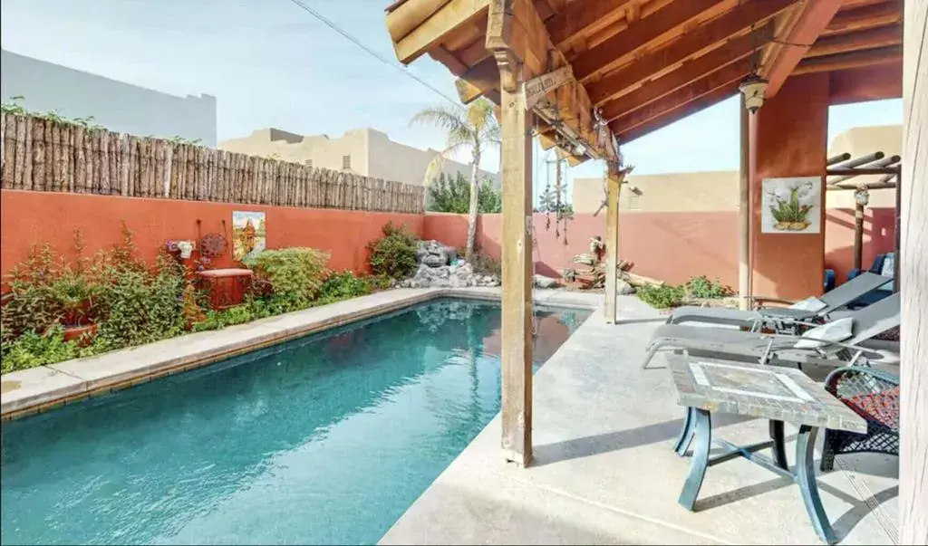 Available after April 2026, long term, furnished or unfurnished, or seasonal rental at a different rate. Discover this charming 3BD/2BA Santa Fe-style home, perfectly situated high in the historic La Quinta Cove. Spanning 1,378 sq ft, this residence offers a blend of character and modern upgrades that discerning renters will appreciate. Enjoy tile floors throughout, stunning wood-beamed ceilings, and a beautifully upgraded master bath. The outdoor oasis features a private pebble pool and an expansive rooftop deck, ideal for soaking in the breathtaking views. Excellent curb appeal is highlighted by a walled front yard with a lovely seating area and a sparkling waterfall, making this home truly stand out. Located near shopping, hiking trails, and major event venues like the Empire Polo Fields and Indian Wells Tennis Garden, this home is a must-see for anyone seeking the best of Coachella Valley living. Furnishings can be negotiated for your convenience.