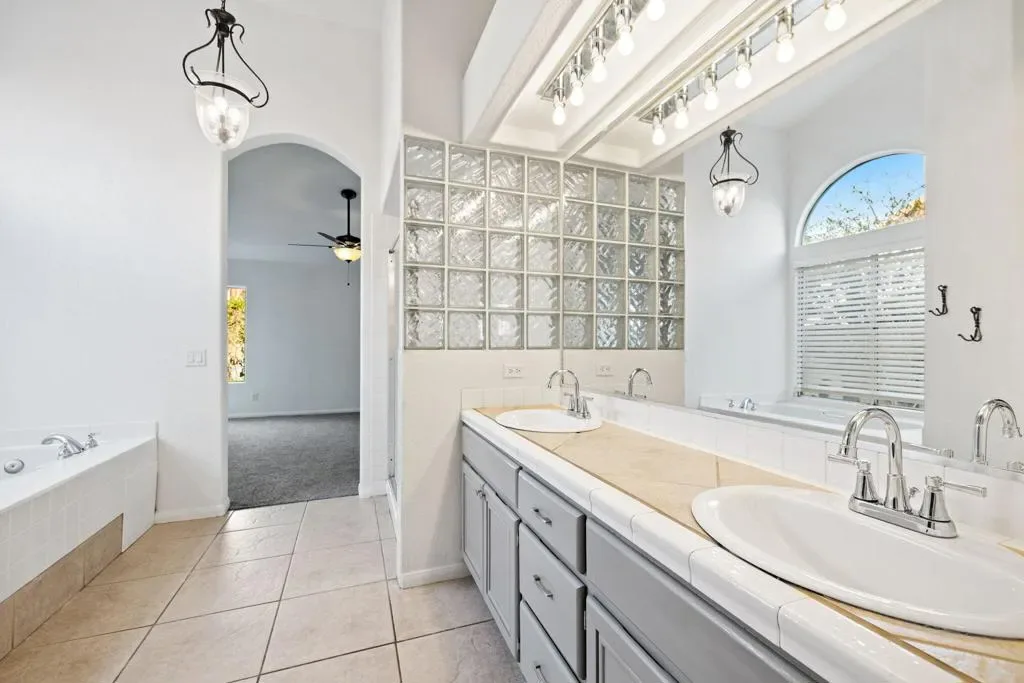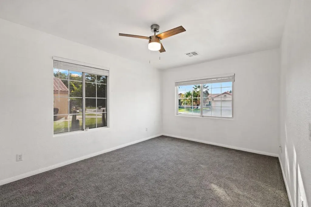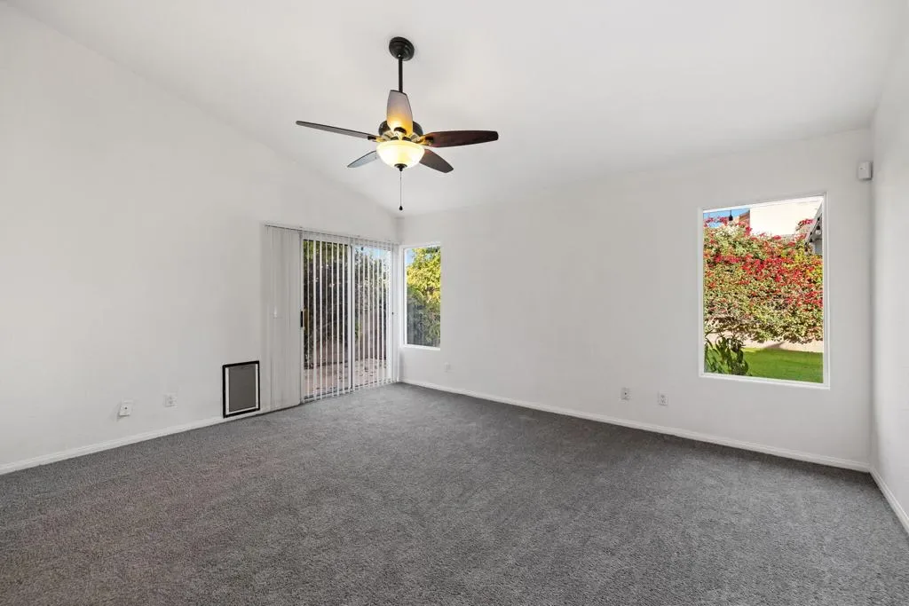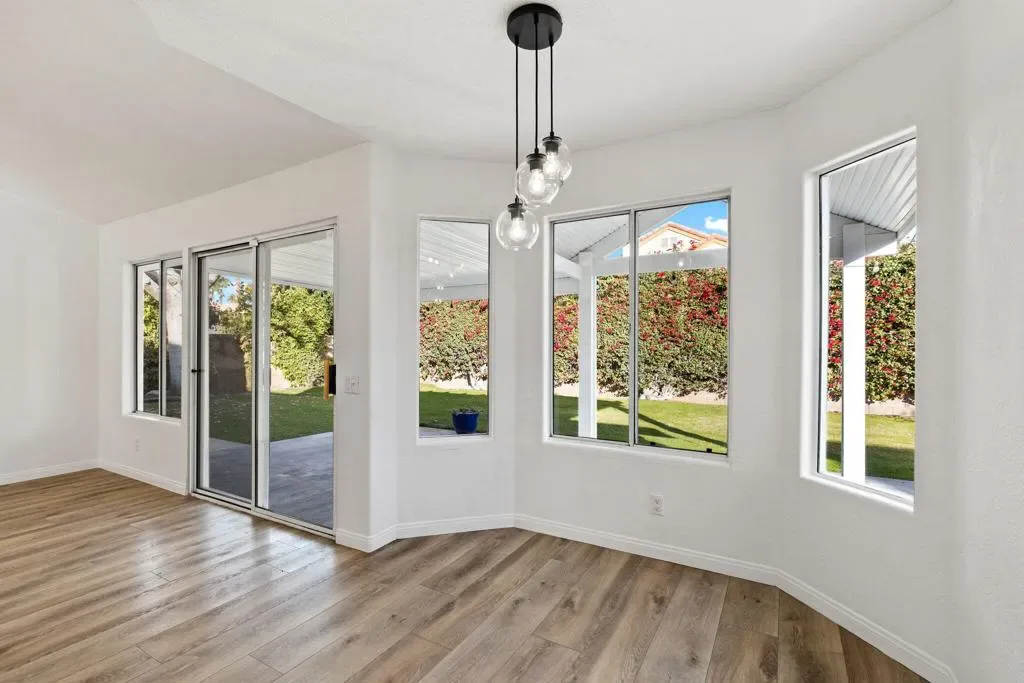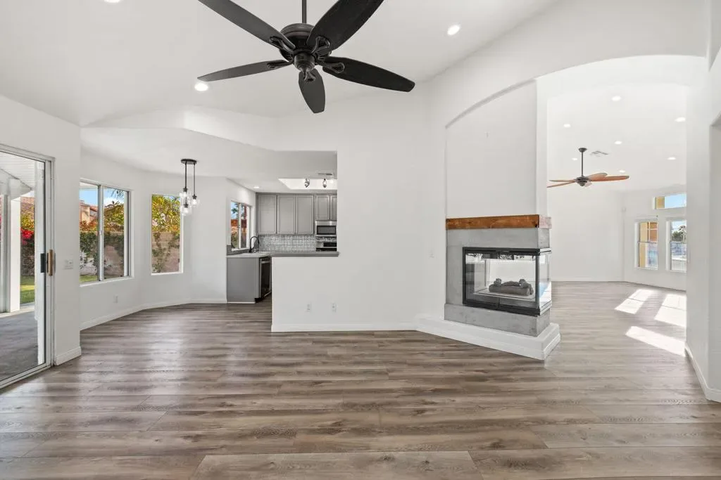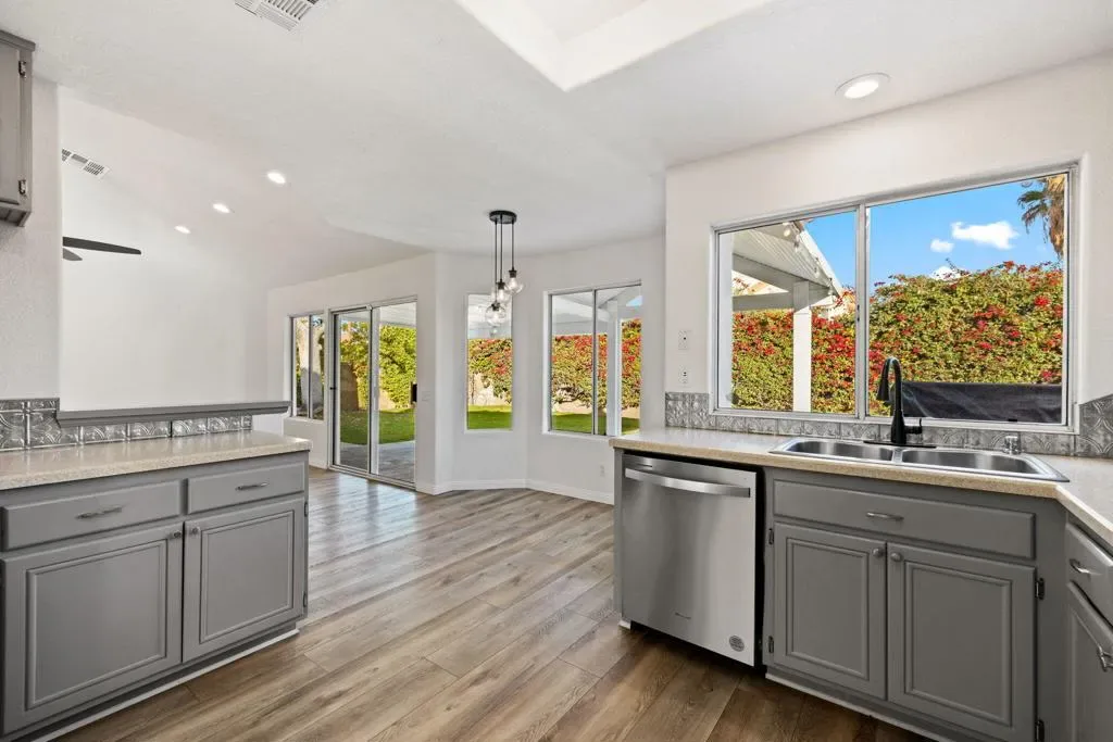 Welcome to this chic desert abode located in the highly sought-after La Quinta Vistas neighborhood. Upon entry, you’re greeted by a bright open-concept living and dining area featuring luxury wood-like vinyl flooring and stylish modern lighting throughout. An inviting ambient fireplace subtly separates the living space from the family room, which opens to a well-appointed kitchen with contemporary gray cabinetry, newer stainless steel appliances, and a cozy breakfast nook, perfect for enjoying your morning coffee. The home offers four spacious bedrooms with plush newer carpeting and two tastefully updated bathrooms. The primary suite features dual sinks, a soaking tub, and a walk-in closet for added comfort and convenience. Step outside to an expansive backyard with mature landscaping, ideal for entertaining, complete with a built-in BBQ. Additional highlights include a two-car garage and a laundry room equipped with a newer washer and dryer. Ideally located near shopping, popular restaurants, golf courses, and highly rated schools, this home offers the perfect blend of comfort, style, and convenience.