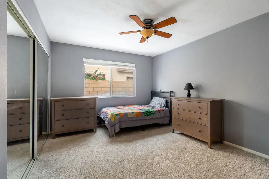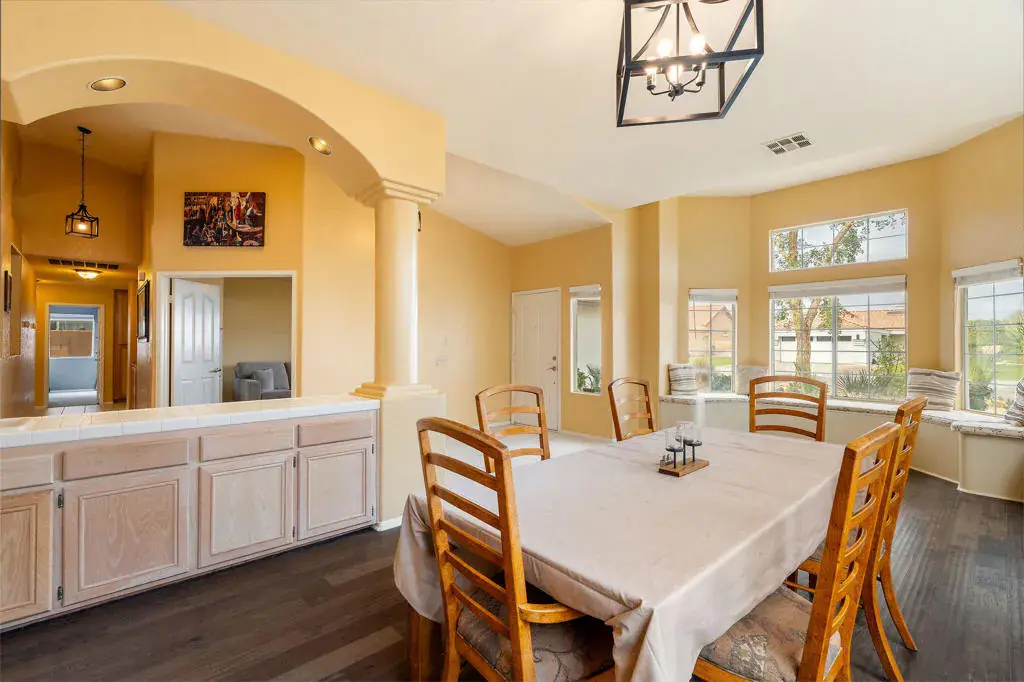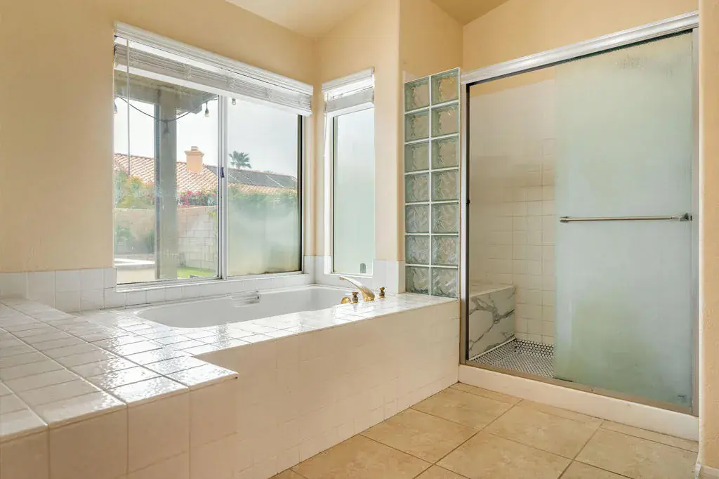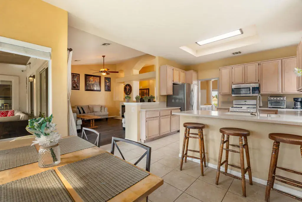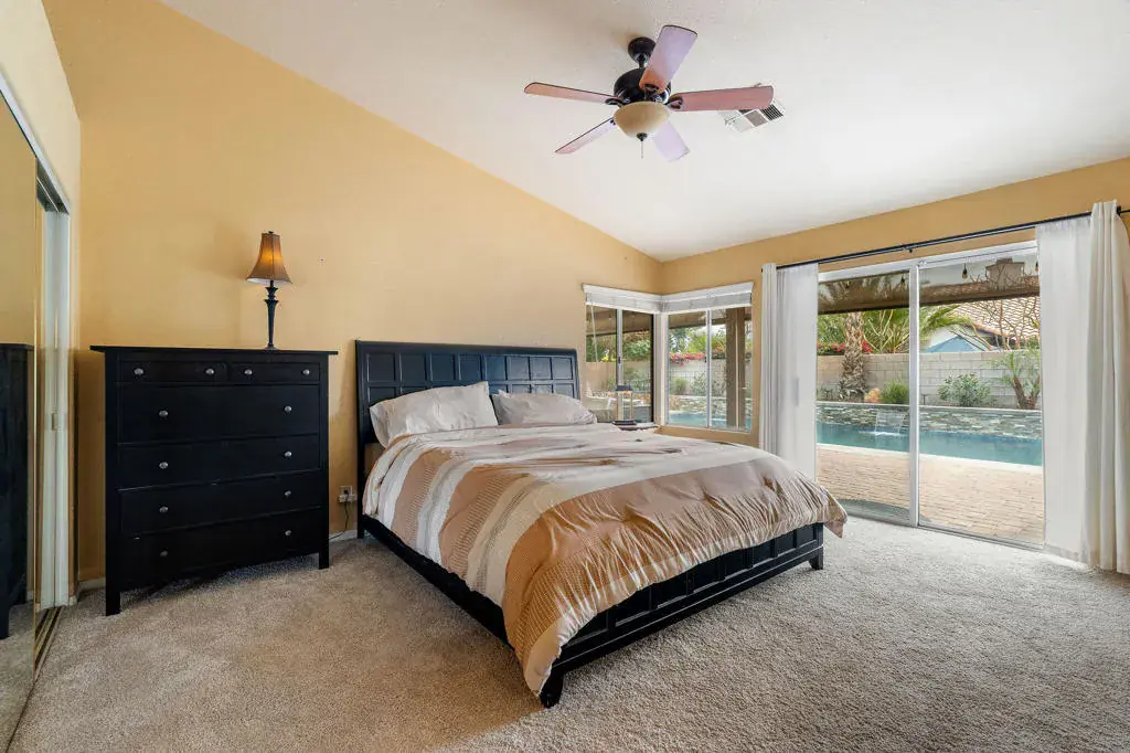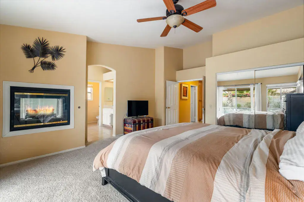 Opportunity meets value in this spacious North La Quinta home offering over 2,300 square feet of comfortable living space and an incredible south-facing backyard designed for relaxation and entertaining.The low-maintenance, drought-tolerant landscaping provides great curb appeal while keeping upkeep simple and efficient. Inside, the home features a blend of ceramic tile, wood laminate, and carpet throughout, creating a warm and functional living environment.The open-concept living room is light and inviting, showcasing vaulted ceilings and a cozy fireplace that flows seamlessly into the kitchen — ideal for everyday living and hosting guests. The kitchen is well-appointed with stainless steel appliances, Corian countertops, and abundant cabinetry for storage.The spacious primary suite serves as a true retreat, complete with a double-sided fireplace that adds warmth and character to both the bedroom and adjoining bath area. Generous proportions provide plenty of room to unwind comfortably.Step outside to your private backyard oasis featuring desirable southern exposure for optimal sunlight. The Pebble Tec pool and spa create a true resort feel, enhanced by three cascading waterfalls and a tanning shelf perfect for lounging. A large Alumawood patio cover provides ample shade and makes outdoor entertaining effortless year-round. Wind screens add additional comfort and privacy.With size, upgrades, and location all working in your favor, this home represents one of the best values currently available in North La Quinta.