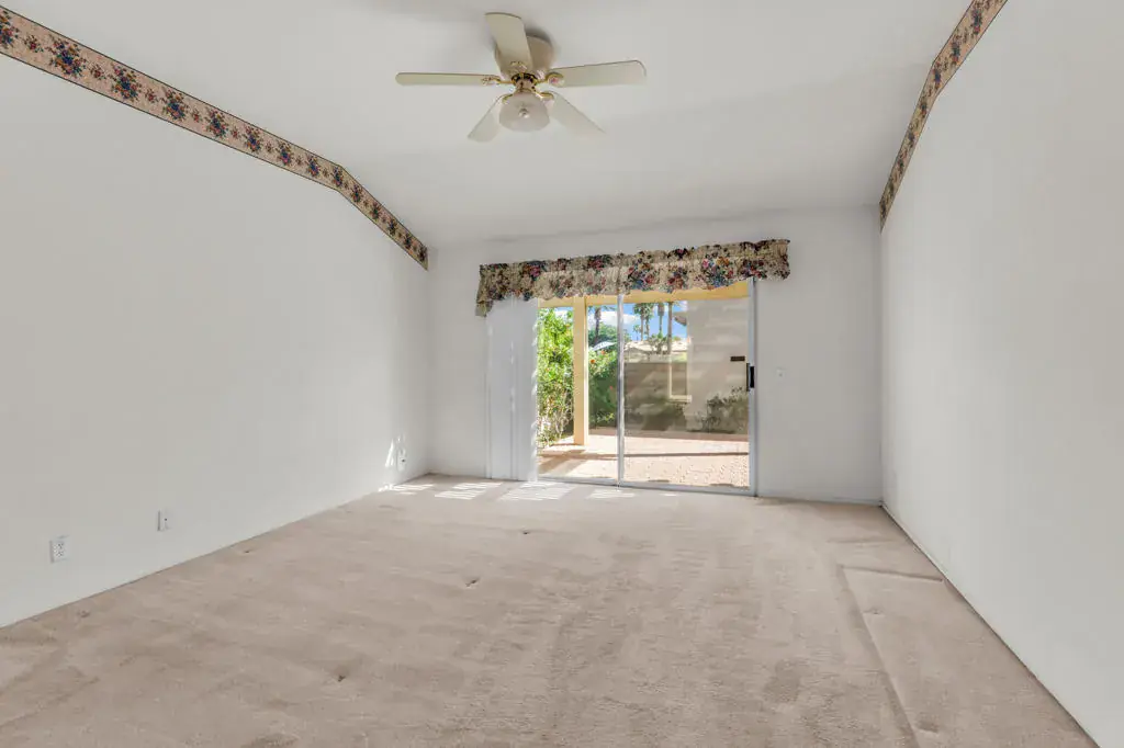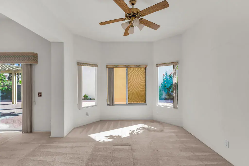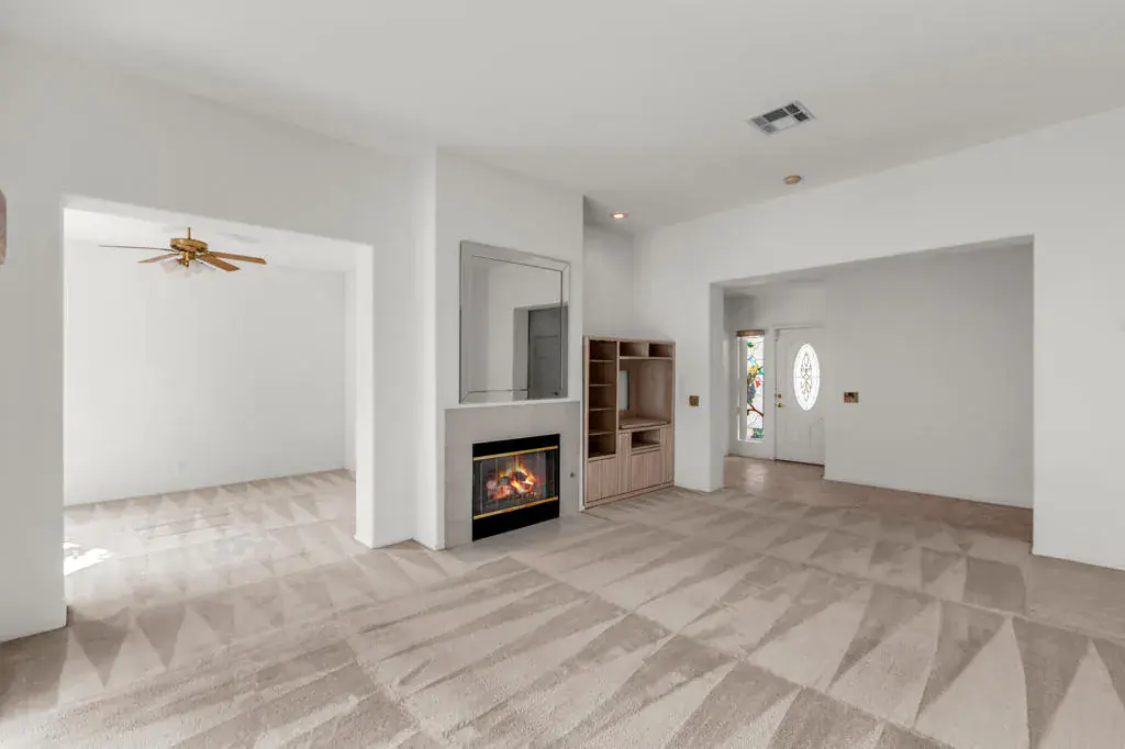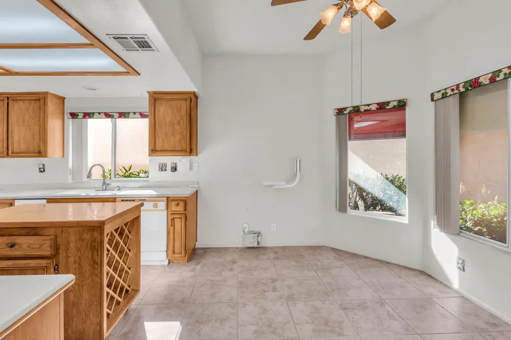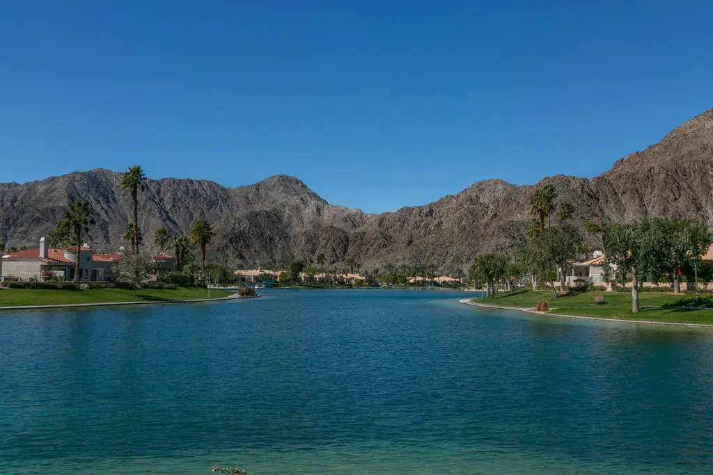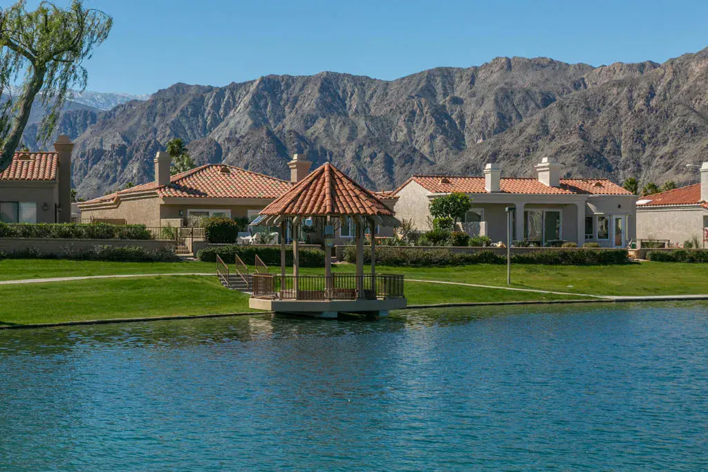 Charming two-bedroom, two-bath home in the guard-gated lake community of Laguna De La Paz. The living room welcomes you with a fireplace and entertainment center. The kitchen features a breakfast nook and a center island, flowing into a dining room surrounded by windows that comfortably seats eight and offers an airy, open feel.The primary suite includes space for a sitting area, two large closets, and an ensuite bath with a double vanity, separate soaking tub, and seperate shower. The guest bedroom and bath provide comfortable accommodations for visitors. Outside, a large brick private patio with an Alumawood cover creates an ideal spot for entertaining or relaxing.Community amenities include a 5-acre lake with an electric boat and two paddle boats, catch and reless fishing, tennis and pickleball courts, a fitness room, a clubhouse, and more. The location is close to premier desert golf and tennis, live entertainment and concerts, restaurants, hiking and biking trails, hotels, and spas.