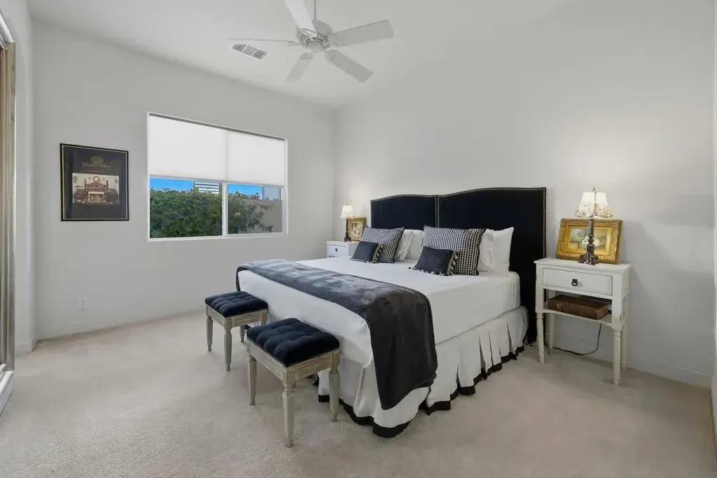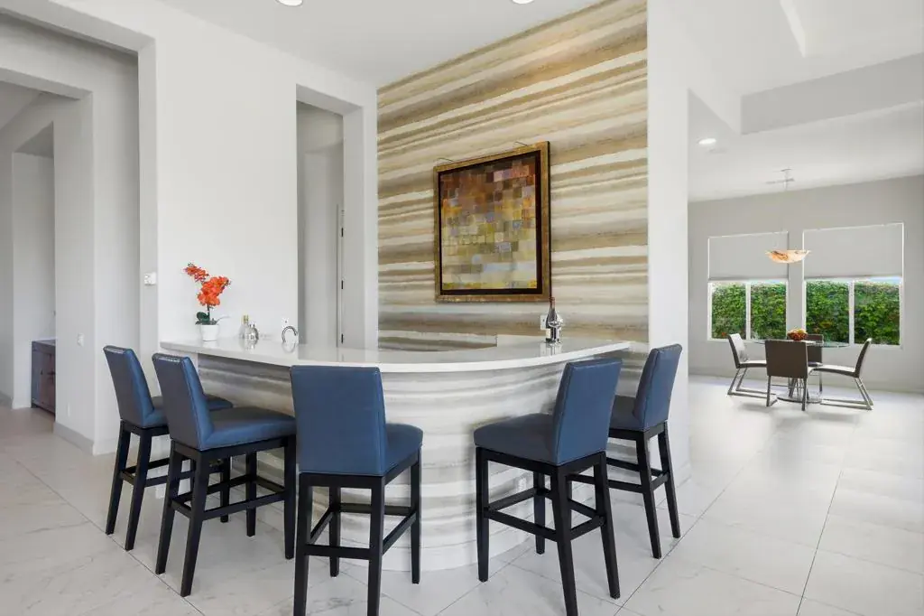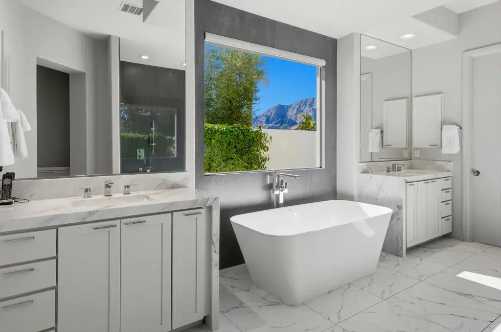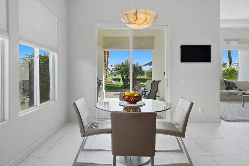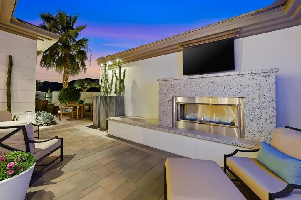 OPEN HOUSE. 3/8 FROM 11-2. AMAZING VIEWS & REMODELED. Welcome to an elegant desert sanctuary offering refined living, exceptional privacy, and breathtaking views. This beautifully reimagined residence includes a bonus room ideal as a den, executive office, or easily made into a 4th bedroom and is thoughtfully designed for both sophistication and comfort.The remodeled living space showcases clean lines and elevated finishes, creating a seamless blend of style and functionality. At the heart of the home, the chef’s kitchen has been expertly renovated with Wolf appliances, custom details, and an open-concept design that flows effortlessly into the main living areas–perfect for elevated entertaining.Retreat to the spa-inspired bathroom, where luxurious finishes create a calming, resort-like experience. Positioned on an expansive 13,000 sq ft lot, the property captures stunning mountain and lake views overlooking the 13th hole, offering a dramatic yet serene backdrop to daily living.Truly indoor/outdoor living – just open the expansive door and enjoy the amazing views. The outdoor living is exceptional. The expanded covered patio serves as a sophisticated entertaining space and transforms into an unforgettable outdoor movie-night retreat. The expansive backyard is ideal for hosting gatherings, while the private front courtyard provides an intimate setting for quiet evenings and morning coffee.Additional highlights include a separate golf cart garage and Tesla charger, enhancing both convenience and lifestyle appeal – plus 3 Air Conditioners and washer/dryer replaced in 2025. Peaceful, private, and impeccably appointed, this home embodies luxury desert living at its finest–perfect for refined entertaining and relaxed enjoyment with family and friends.