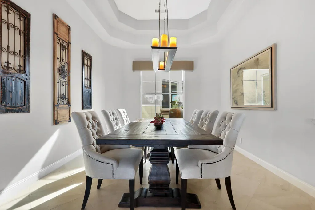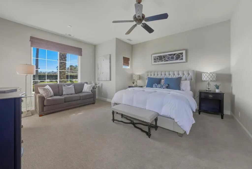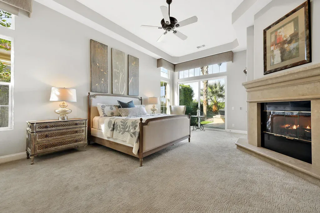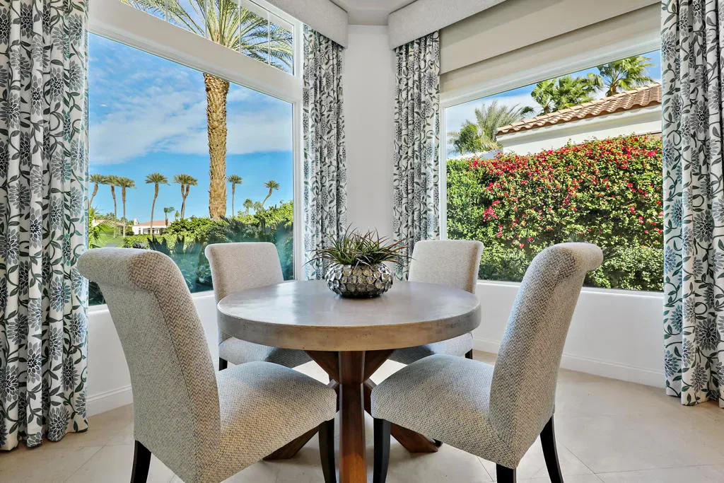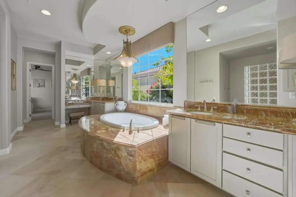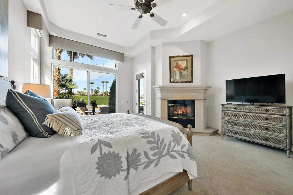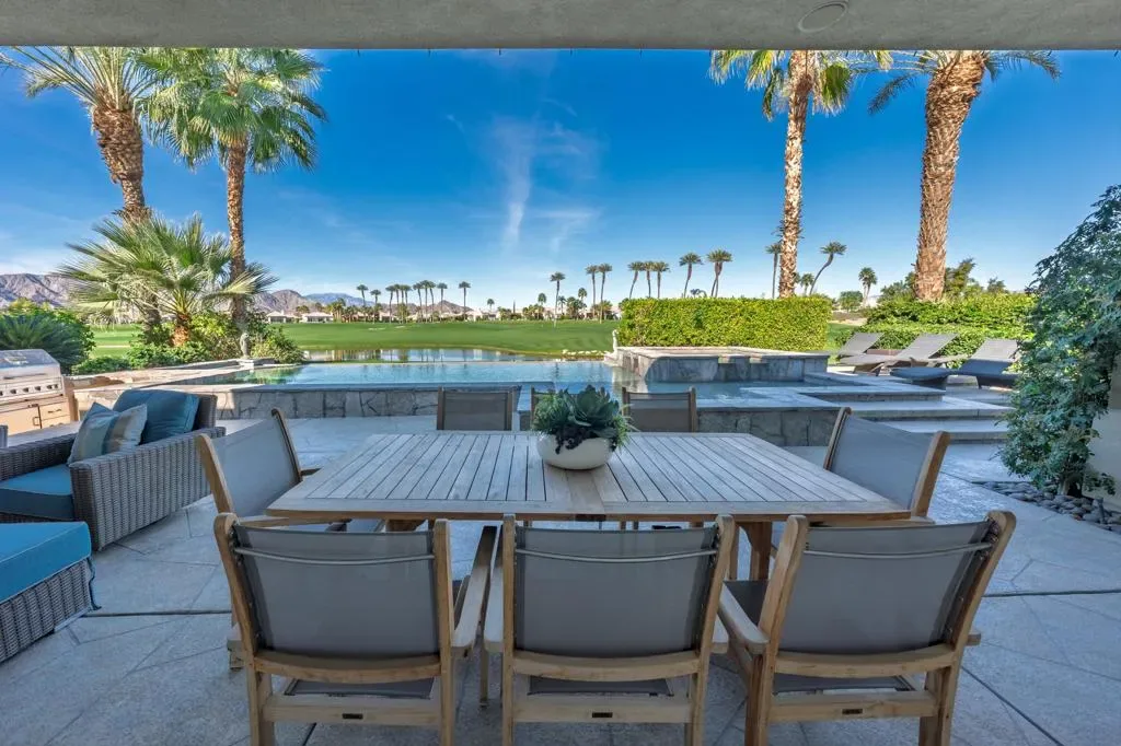 Set on an expansive 12,632 sf view lot with sweeping fairway, lake, and mountain vistas, this exceptional residence is the ultimate desert retreat. Thoughtfully designed for both refined everyday living and grand scale entertaining, the property boasts an oversized yard highlighted with a true resort style backyard. Outdoor amenities include a stunning infinity edge pool with swim up bar, BBQ island, tanning shelf, raised sunning deck, and expansive patio enhanced with automatic awnings, ceiling mounted heaters, and a misting system, creating the perfect setting for year round outdoor enjoyment.Inside, the light filled open floor plan impresses with dramatic 12′ soffited ceilings, 8′ interior doors, and elegant custom window treatments throughout, including automatic blackout and solar shades. The newly redesigned gourmet kitchen serves as the heart of the home and a true showpiece, featuring a large waterfall edge quartz island ideal for gathering, custom flat panel cabinetry, herringbone tile backsplash, designer pendant lighting, a Wolf convection range, built in refrigerator, and premium stainless steel appliances, all perfectly positioned to capture the home’s breathtaking views.The home offers four generously sized bedrooms plus an office off the primary suite that can easily function as a fifth bedroom. The private, oversized casita with courtyard access provides exceptional accommodations for guests, offering both comfort and privacy. Additional highlights include switch start fireplaces with elegant stone surrounds and a luxurious primary suite retreat featuring a spa inspired marble bath, Jacuzzi soaking tub, dual vanities, and a separate walk in shower.Blending sophisticated design with resort style living, this remarkable property is a true entertainer’s dream and private sanctuary, an extraordinary home that must be experienced to be fully appreciated.