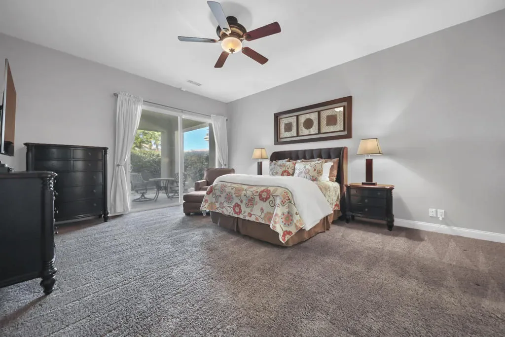 Opportunity knocks! This popular ‘Camina’ floor plan offers an open great room layout with incredible golf course views and significant potential to make the home your own. Situated on the 15th hole of the Arnold Palmer-designed Mountain View Country Club, this property features a deep lot with an expansive patio, fire pit, and ample room for outdoor entertaining. The backyard faces east over a popular Par 4, offering stunning views of the lake with abundant birds (including whooping cranes), the Chocolate Mountains to the east, and the Santa Rosa Mountains to the south. This house is located near the south gate for easy access in and out of the club. The interior boasts high ceilings and a large living room with a fireplace and wet bar. The island-style kitchen is equipped with slab granite countertops, an eating bar, and a breakfast nook. The spacious primary suite includes a walk-in closet and an ensuite bathroom with dual sinks, large soaking tub and a separate walk-in shower. The 2 other bedrooms are ensuite and the 2.5 car garage has epoxy floors and work bench. Ready to live your best life style in this vibrant Club? Call for a private show, this home is ready and calling for its new homeowner.