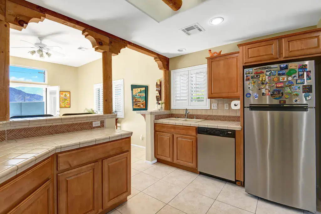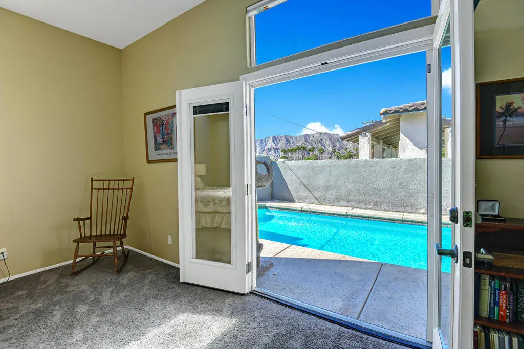 The absolute best-value ”Santa Fe” style home in La Quinta, with sweeping, panoramic, south-facing views of the Santa Rosa mountains, completely unobstructed by neighbors! And if the view doesn’t have your jaw-dropping, wait ’til you fall in love with the charm, be it the wood beams in the kitchen, or the beautifully landscaped entryway courtyard. Surrounded by mature citrus trees that cast ample shade from the afternoon heat, it’s a tranquil environment to host friends and family for an al fresco dining experience to remember. The home has three spacious bedrooms, with a slider from the Primary Suite giving direct access to the pool and hot tub, with West-facing views of the mountains. The seller also built an extended back patio to provide sufficient lounging space to soak up all the south-facing sunlight you could possibly want! The home is priced to sell, so see it quickly and make your best offer!
