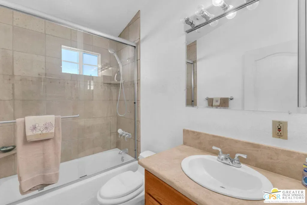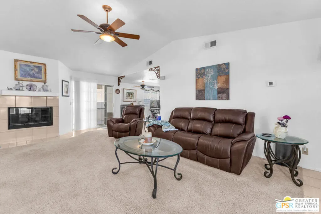 Set on a corner homesite in a peaceful La Quinta neighborhood, this charming single level residence offers privacy, mountain views, natural light, and easy low maintenance desert living. Fully walled and gated, the property features several outdoor areas designed for relaxing and enjoying the desert climate, including a sunny front patio with retractable shade awning, a covered rear patio perfect for alfresco dining, and a private gated side yard. Inside, the approximately 1,559 square foot floorplan offers three bedrooms and two bathrooms with comfortable living spaces throughout. The living room features vaulted ceilings, a cozy fireplace, and large windows that bring in abundant natural light and mountain views. The open kitchen is well suited for modern living, offering generous cabinetry, solid surface countertops, stainless steel appliances including a double oven, a dining nook with cozy booth seating for everyday dining, and a peninsula bar that works perfectly for casual seating, workspace, homework, or even arts and crafts. The primary suite provides a peaceful retreat with an ensuite bath, while the two additional bedrooms offer flexibility for guests, a home office, or hobbies, with one featuring a built-in desk ideal for a workspace. Plantation shutters, updated bath finishes, and an attached two car garage with direct interior access add to the home’s appeal. Thought to have undergone extensive reconstruction in the early 1990s, the home blends comfort and charm with a practical and welcoming layout. With no HOA and a convenient location close to local dining, shopping, and nearby schools, this home offers a wonderful opportunity to enjoy relaxed desert living in a quiet, convenient, and established La Quinta neighborhood.