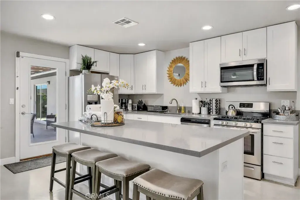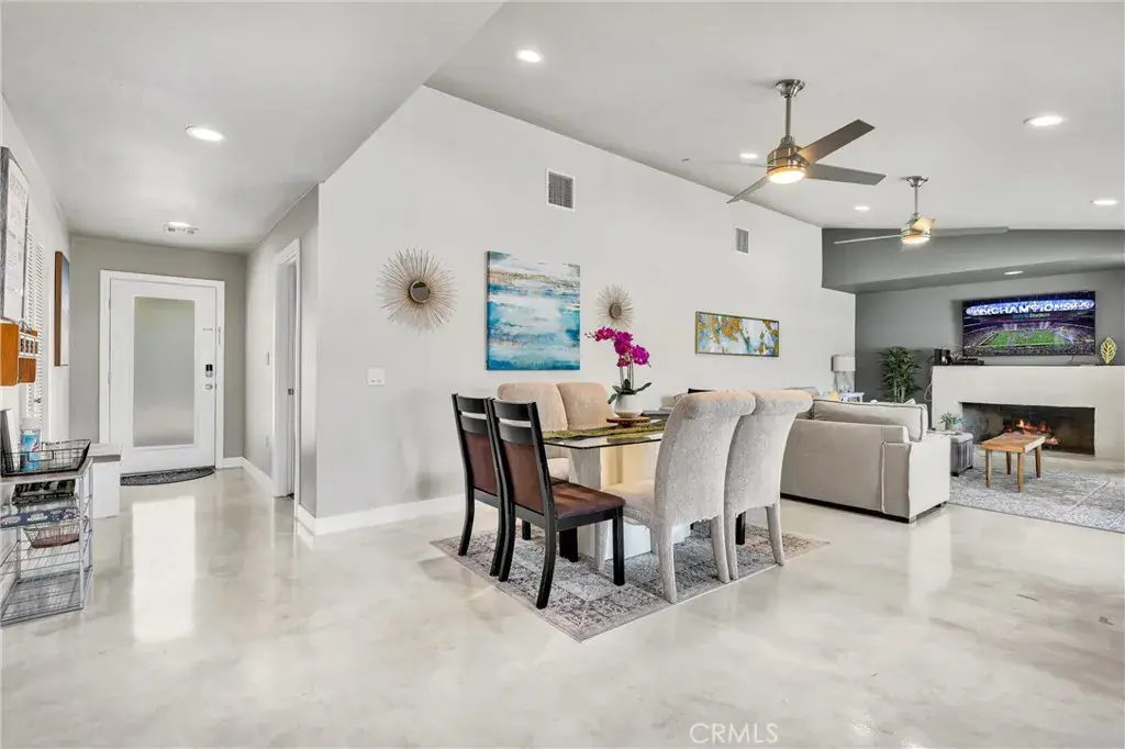 The interior features a bright, open layout with raised ceilings and a concrete overlay flooring system that provides a clean, modern aesthetic along with energy efficiency. The remodeled kitchen is designed for everyday living and entertaining, featuring quartz countertops, stainless steel appliances, a large center island, and updated cabinetry.