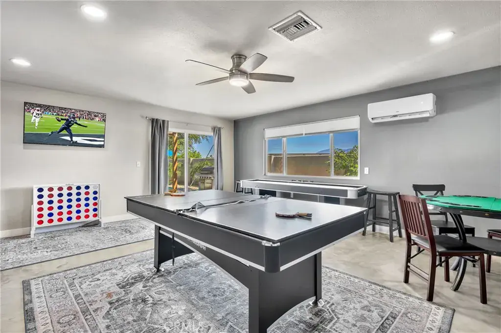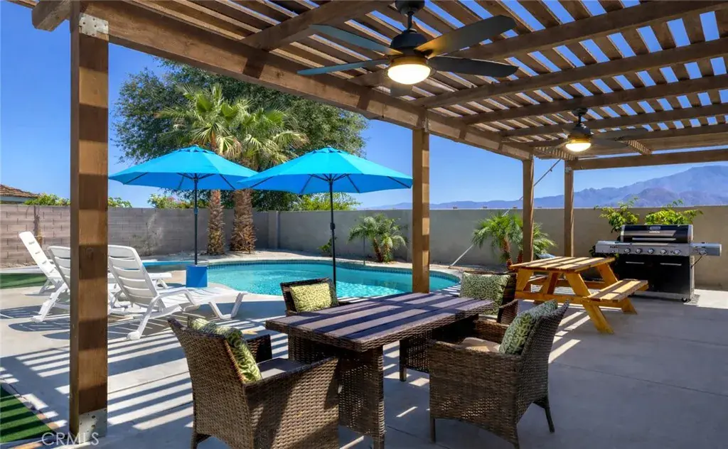 Outdoor living is centered around a recently built saltwater pool and spa with mountain views, along with an outdoor shower, covered lounge area with ceiling fans, and a turf putting space. The backyard offers ample room for relaxing, dining, and entertaining.