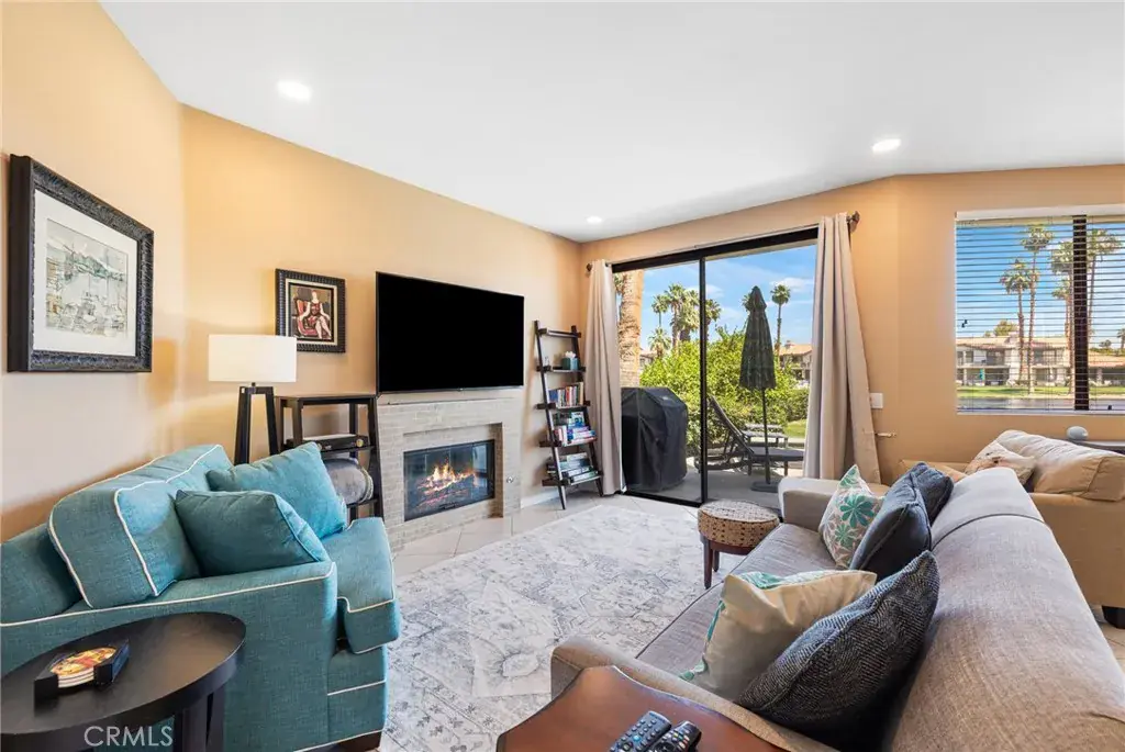 As you enter, a light-filled living space draws you in with floor-to-ceiling windows framing the lake. The updated, fully equipped kitchen opens seamlessly into the dining area and cozy family room, creating a welcoming flow perfect for entertaining or relaxing. A spacious breakfast nook offers the ideal spot for morning coffee, while the family room, complete with a fireplace, invites you to unwind. Glass sliding doors lead directly to a private patio with a seating area and a barbecue grill, where you can enjoy sunsets over the lake, dine alfresco, or simply soak in the tranquility of the surrounding desert landscape.