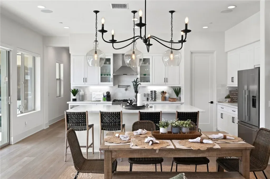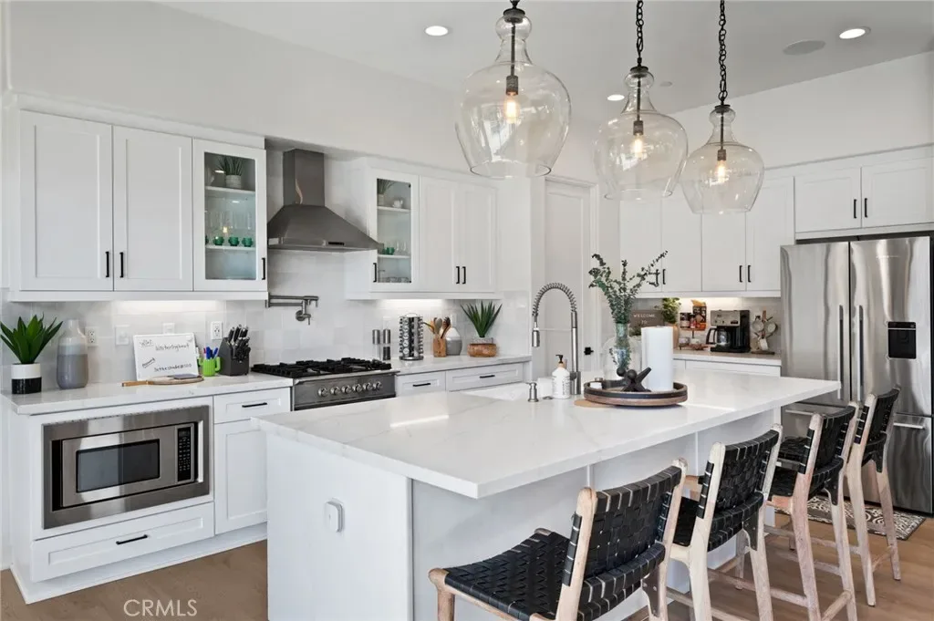 This single-story residence features 3 bedrooms, 2.5 bathrooms, and approximately 2,034 sq ft with an open-concept great room, dining area, and chef’s kitchen. Upgrades include quartz countertops, hand-glazed tile backsplash, Fisher & Paykel appliances with dual dishwashers, professional range with hood, pot filler, Kohler farmhouse sink, wide plank vinyl flooring, smooth stucco walls, and designer finishes throughout.
