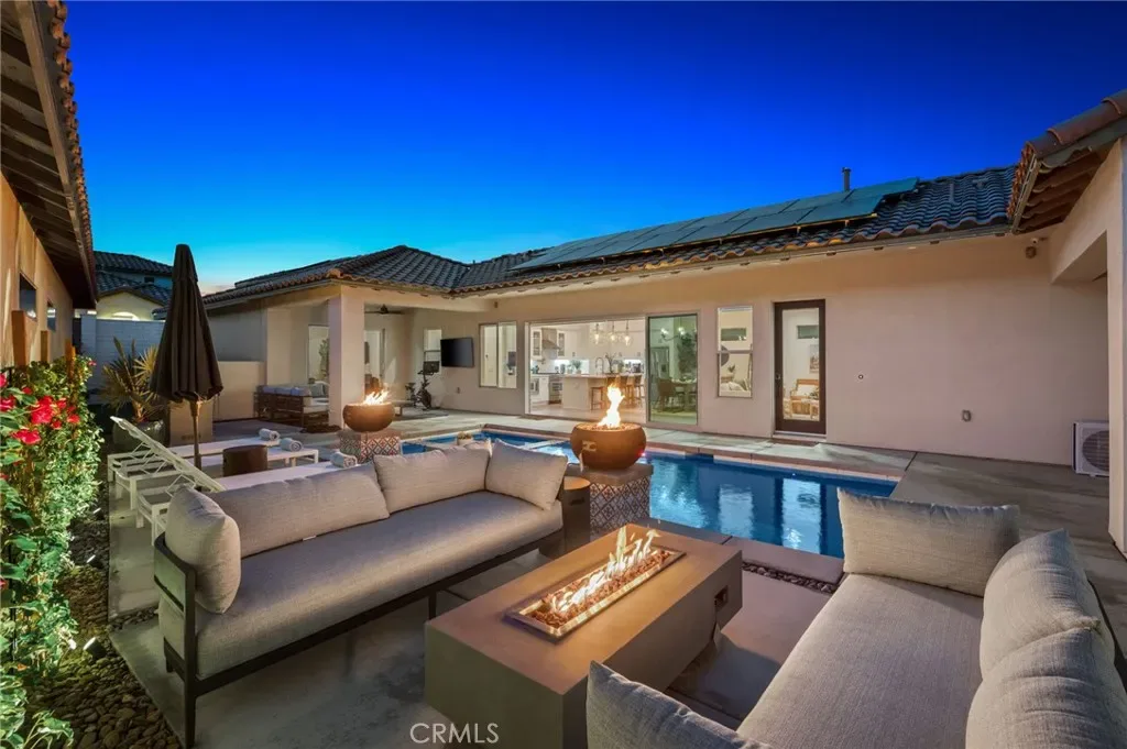 The outdoor space includes an extended patio with private pebble sheen pool and spa, built-in BBQ island, and fire feature. Additional features include fully paid solar, indoor/outdoor sound system, security system, enhanced insulation, and a 2-car garage with additional golf cart/storage space.