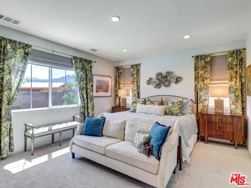 Welcome to this beautifully upgraded, Piazza Serena home completed in 2024 and located in a quiet, gated community. Designed with an open-concept floor plan, the home features a spacious great room anchored by a chef’s kitchen with an oversized island, abundant cabinetry, and a walk-in pantry, perfect for everyday living and effortless entertaining. The expansive primary suite offers a spa-like ensuite bath, while three additional bedrooms each feature walk-in closets for ample storage. With three bathrooms and a large laundry room, functionality meets modern convenience at every turn. Step outside to a true desert oasis. Extensive landscaping upgrades showcase a sparkling saltwater pool and spa, lush grassy yard, in-ground trampoline, custom putting green, and a cozy gas fire pit, all framed by sweeping mountain views. The covered California room with double sliding doors creates seamless indoor-outdoor living, year round. Additional highlights include upgraded flooring, premium carpeting, owned solar, EV charging, and a 3-car garage. This home blends new-construction style with thoughtfully curated upgrades for the ultimate move-in ready retreat.