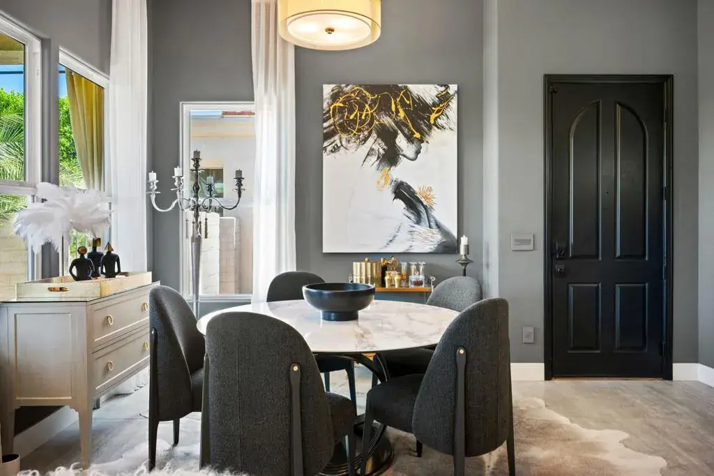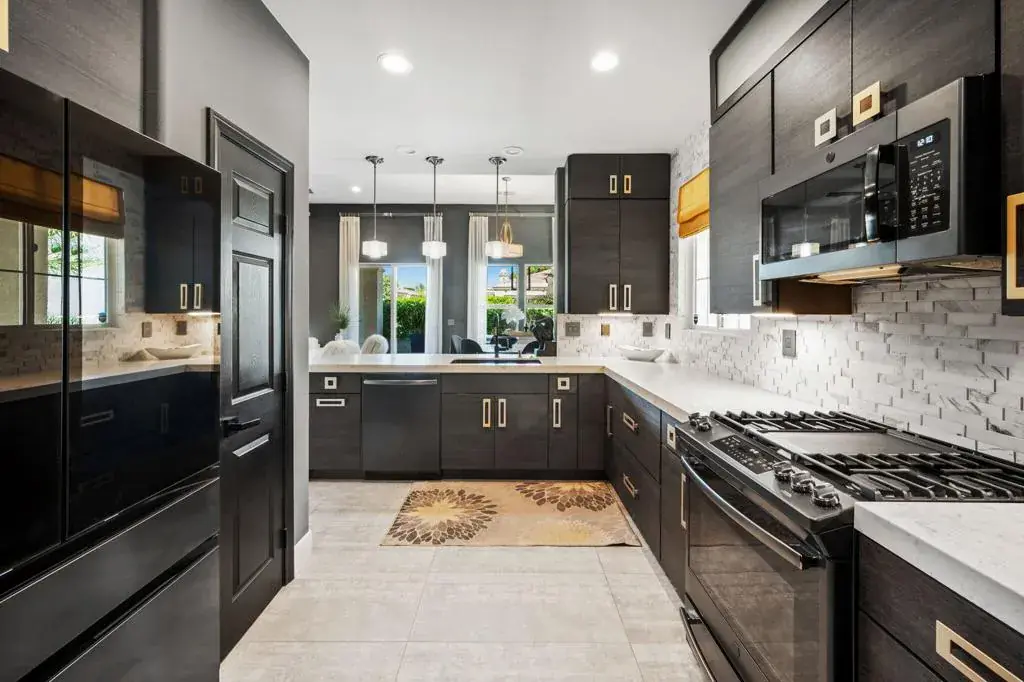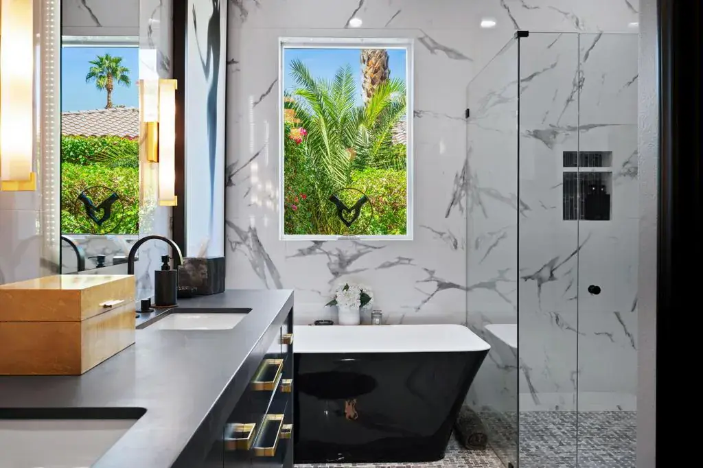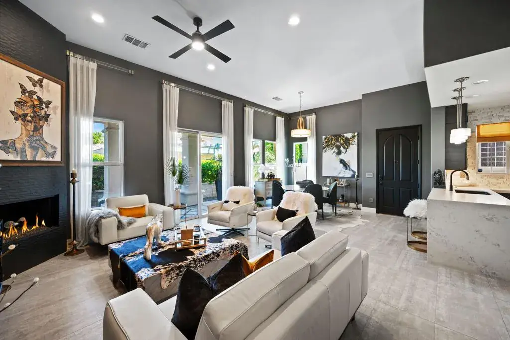 Designer Showcase Home. Completely remodeled ($100K+) over the past five years. Includes all new gourmet kitchen with custom cabinetry, quartz waterfall countertop, and new appliances. The great room design boasts raised 12-foot ceilings, archways, decorative linen panels, a luxury wallpapered accent wall, custom lighting, and a tiled fireplace. Abundant windows provide natural lighting and views of lush landscaping. The owner’s suite is on the main level. It has 10′ coffered ceilings, an oversized sliding glass door with scenic views. An archway leads into the ensuite bathroom with beautiful porcelain tiled flooring and walls, custom floating and back lite cabinetry, dual sinks, a free-standing soaking tub and tiled glass-encased shower. An additional archway leads into the walk-in closet with custom cabinetry. The main floor powder room includes designer floor tiles and a custom floating cabinet with sink. Upstairs, there are two spacious rooms, each with sliding glass doors and amazing views, new carpet, and a Jack & Jill bathroom concept featuring custom cabinets, a tiled floor, and tiled shower. Scenic mountain views from the backyard, two covered patios with fans for expanded outdoor living, and custom landscaping that provides privacy, and features artificial turf and Canary Island palm trees. Additional updates include custom laundry cabinets and LG stacked washer/dryer, exterior painting, new energy-efficient HVAC system, new water heater, Simple Safe security system, and custom storage racks in the garage. Puerta Azul is an enchanting gated community of only 127 homes, neighboring PGA West, with outstanding amenities that include two large pools, a clubhouse, a fitness center, and a tennis court. This exceptional property is perfect for either seasonal ownership or as an investment property.