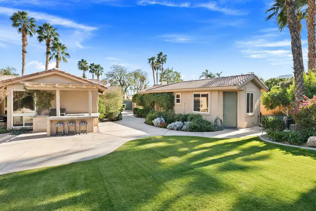 Available all Months! Located within the prestigious Rancho La Quinta Country Club, , community pools and spas, and a beautiful cantina for dining located at the main pool area.Set on a lushly landscaped 13,000 sq. ft. lot away from the golf course, the home welcomes you through a gated courtyard and custom double-door entry. Inside, the spacious floor plan features 4 bedrooms, a formal living room, elegant built-ins, surround sound, custom lighting, and a striking shadowbox faux copper fireplace. One bedroom includes office built-ins, while the dedicated office features French doors opening to a private side patio.The luxurious primary suite boasts a generous bathroom with marble countertops. The kitchen and bathrooms have been remodeled, and the home features custom paint throughout, along with a three-car garage.The resort-style backyard is ideal for entertaining, offering lush landscaping, a built-in barbecue, refrigerator, outdoor fireplace and bar, an expansive pool, sparkling spa, and a misting system for year-round comfort.A detached casita completes the property, featuring a living room, mini kitchen, beautiful bathroom, laundry area, and spacious bedroom with a queen bed–perfect for guests or extended stays.Call us today to book your stay. Pricing varies by season–please call for current rates.FYI: Owner is adding another queen bed to home. Office has a Pull out couch $5K & very comfortable.