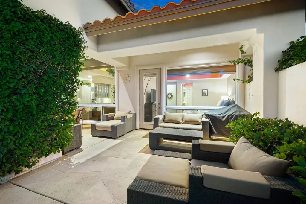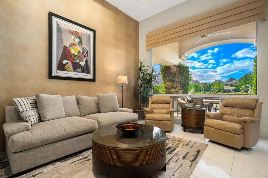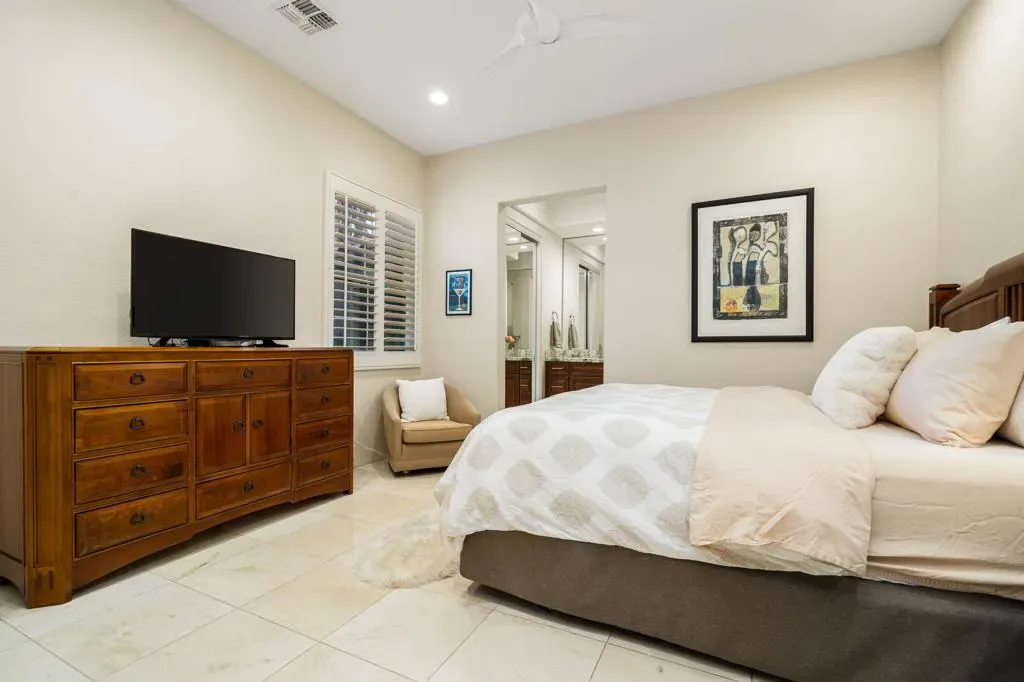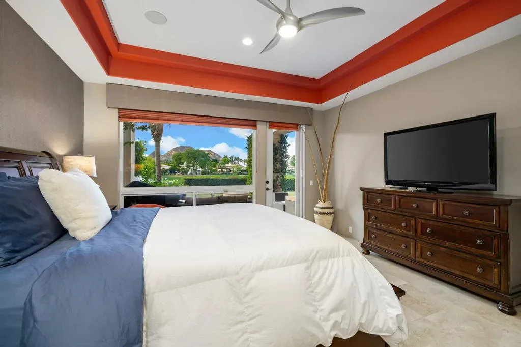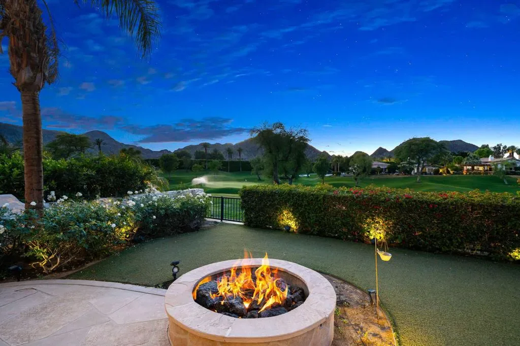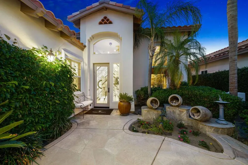 Welcome to pristine Rancho La Quinta Country Club in La Quinta. This highly desired Terraza II Plan, with stunning details, features an open floor plan and high ceilings, a stunning Santa Rosa Mountains view from inside through the walls of glass, and is on an elevated lot on a cul-de-sac with low traffic overlooking the par 5, 3rd green of the Robert Trent Jones Course, one of two Private golf courses in the development. Inside, you will find a remodeled high-end kitchen, gorgeous tiled floors, a contemporary fireplace, LED can lights, and more awaiting you in this 3 en-suite bedroom, plus powder room (including detached Casita) 2,648 SF home. The kitchen is a cook’s paradise and has been remodeled with contemporary Shaker cabinets, a waterfall Cambria quartz countertop, KitchenAid appliances, a Blanco sink, a custom pull-out pantry, pendant lighting, and more. HOA’s include the social and fitness membership. The already stunning Private Clubhouse is undergoing a complete renovation and is slated for completion shortly. The generously sized lot allows room for your own custom pool, or just enjoy the conveniently located Community pool, literally located just across the street. The 2-car plus golf cart garage has an epoxy floor and custom cabinetry. Home is being offered furnished per the written inventory.