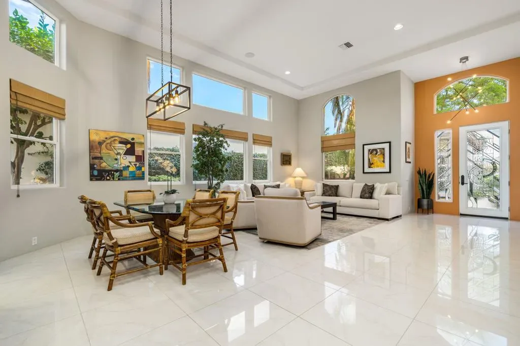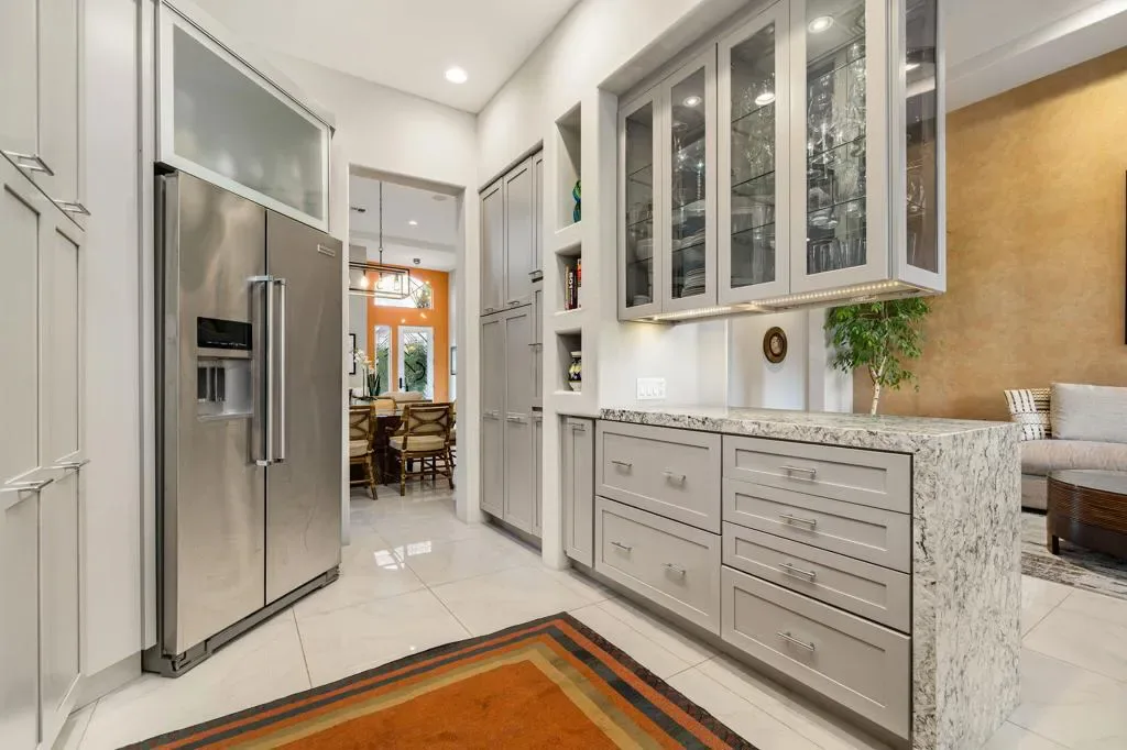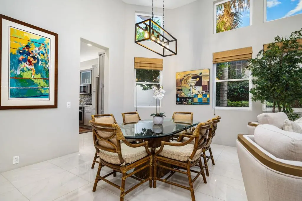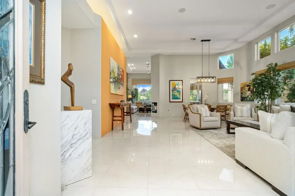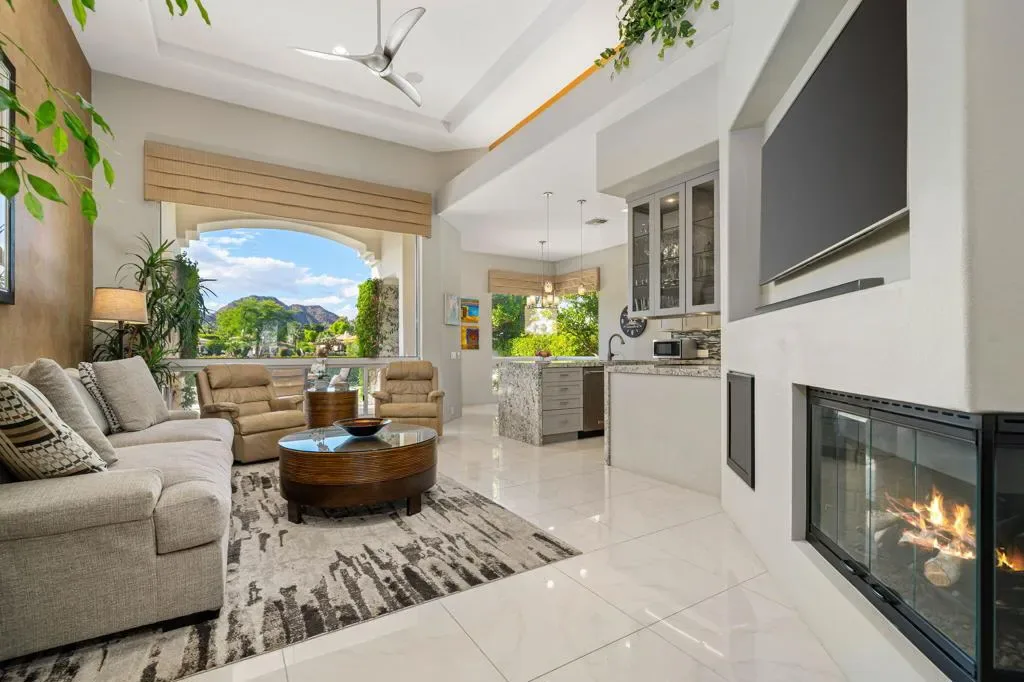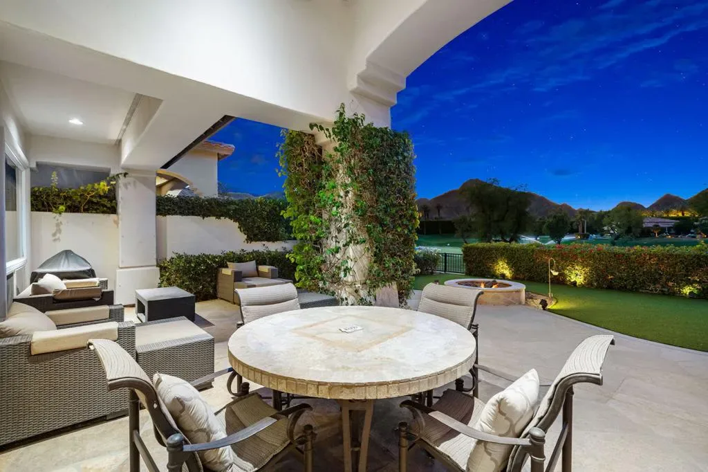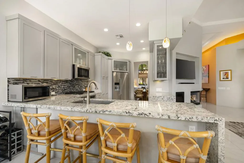 Welcome to pristine Rancho La Quinta Country Club in La Quinta. This highly desired Terraza II Plan, with stunning details, features an open floor plan and high ceilings, a stunning Santa Rosa Mountains view from inside through the walls of glass, and is on an elevated lot on a cul-de-sac with low traffic overlooking the par 5, 3rd green of the Robert Trent Jones Course, one of two Private golf courses in the development. Inside, you will find a remodeled high-end kitchen, gorgeous tiled floors, a contemporary fireplace, LED can lights, and more awaiting you in this 3 en-suite bedroom, plus powder room (including detached Casita) 2,648 SF home. The kitchen is a cook’s paradise and has been remodeled with contemporary Shaker cabinets, a waterfall Cambria quartz countertop, KitchenAid appliances, a Blanco sink, a custom pull-out pantry, pendant lighting, and more. HOA’s include the social and fitness membership. The already stunning Private Clubhouse is undergoing a complete renovation and is slated for completion shortly. The generously sized lot allows room for your own custom pool, or just enjoy the conveniently located Community pool, literally located just across the street. The 2-car plus golf cart garage has an epoxy floor and custom cabinetry. Home is being offered furnished per the written inventory.
