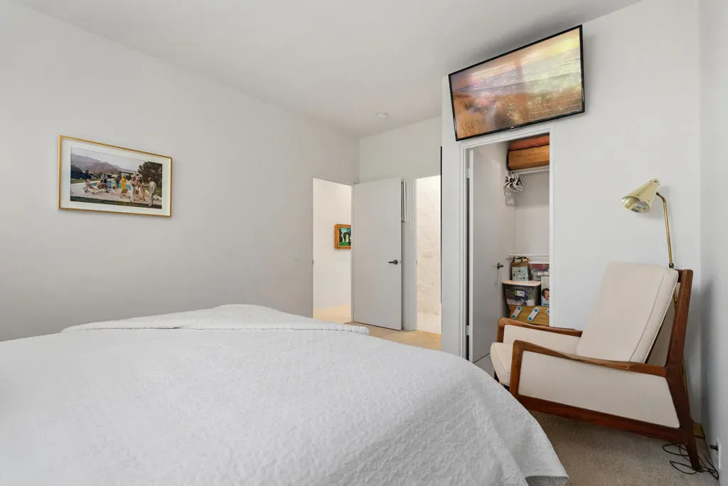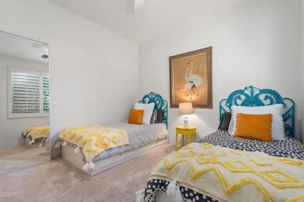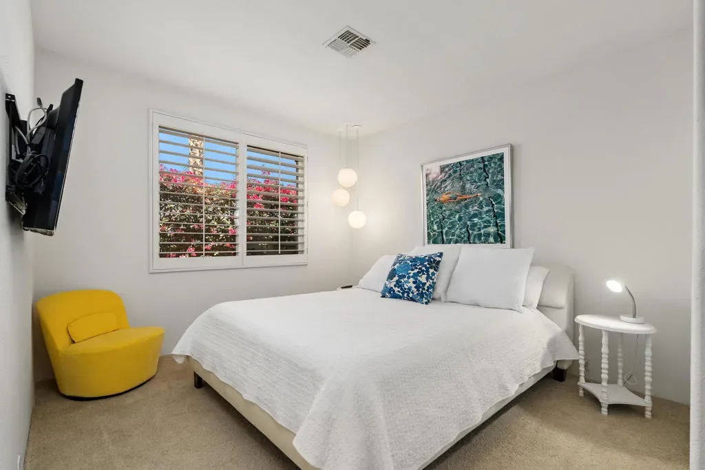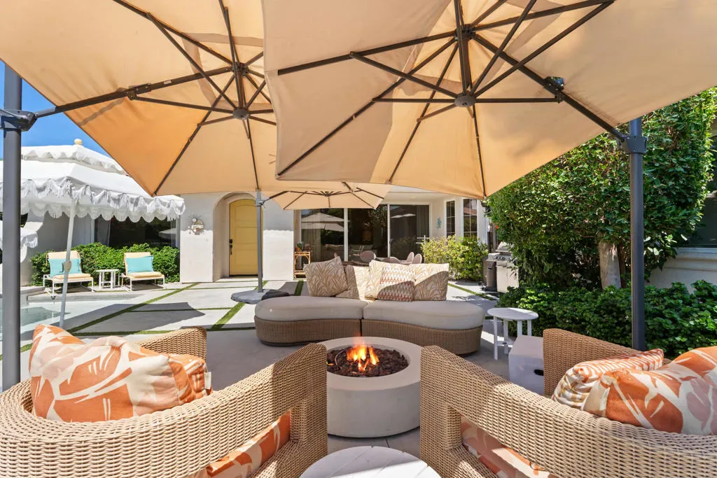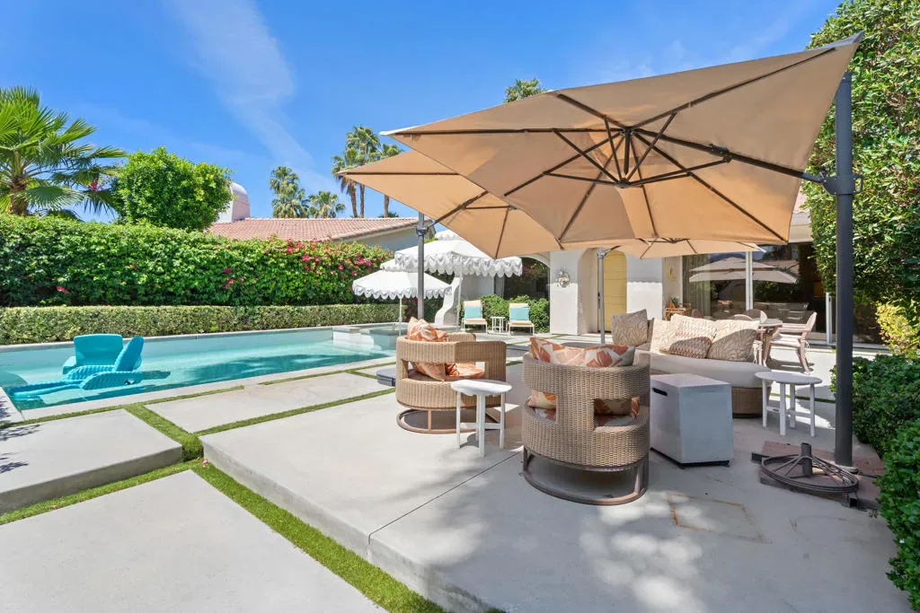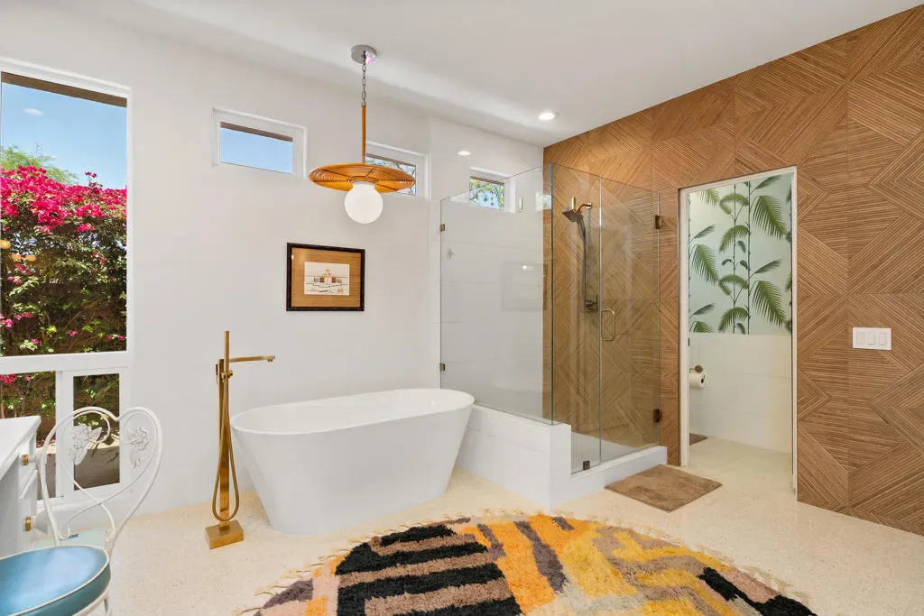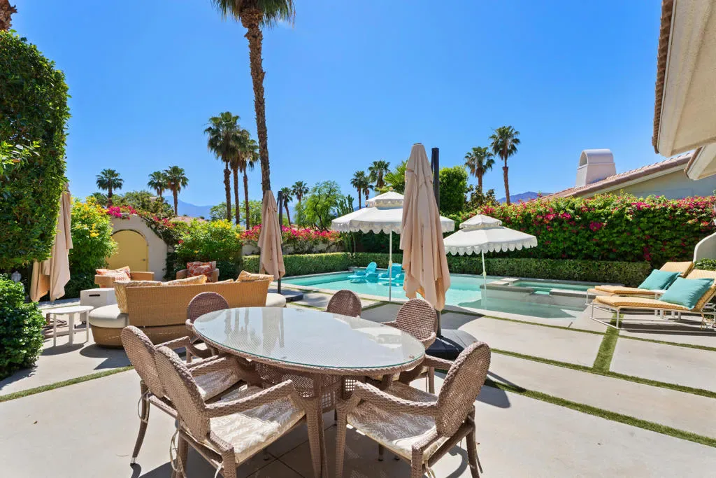 Step into a world where mid-century soul meets contemporary luxury in this meticulously reimagined Valencia Plan–the largest floor plan in the Ventanas enclave of Rancho La Quinta Country Club. Spanning 2,566 square feet, this one-of-a-kind residence is anchored by stunning Terrazzo flooring that flows seamlessly throughout. The grand living room serves as an architectural centerpiece, boasting an expansive vaulted ceiling with crisp tongue-and-groove planking, rich wood beams, and a feature wall of custom vertical wood paneling. This sophisticated aesthetic carries into the chef’s kitchen, featuring two-toned cabinetry, airy open shelving, and a custom mosaic backsplash, all accented by elegant quartz countertops and a premium suite of GE Cafe appliances. Designed for both relaxation and high-end entertaining, the home offers three spacious bedrooms, three baths, a dedicated office, and a versatile bonus room. The primary suite is a true sanctuary, featuring a spa-like bath with a sculptural freestanding tub, a glass-enclosed shower against a geometric wood-tile feature wall, and a private outdoor shower for the ultimate desert experience. Outside, the lifestyle is defined by sun-drenched southern views and a contemporary front-loaded pool and spa, all strategically positioned to capture maximum sunlight while framing breathtaking mountain vistas. This property is an invitation to an elevated lifestyle where iconic design meets modern convenience and world-class amenities.