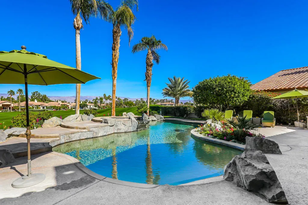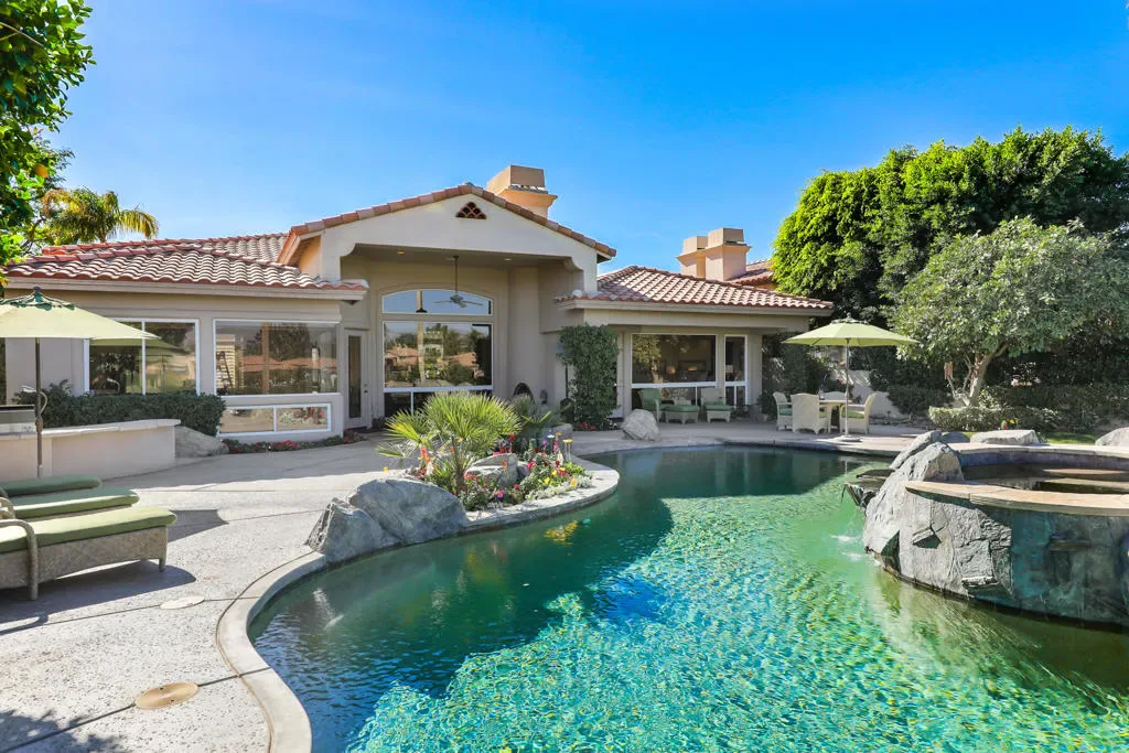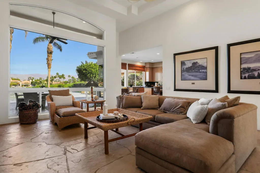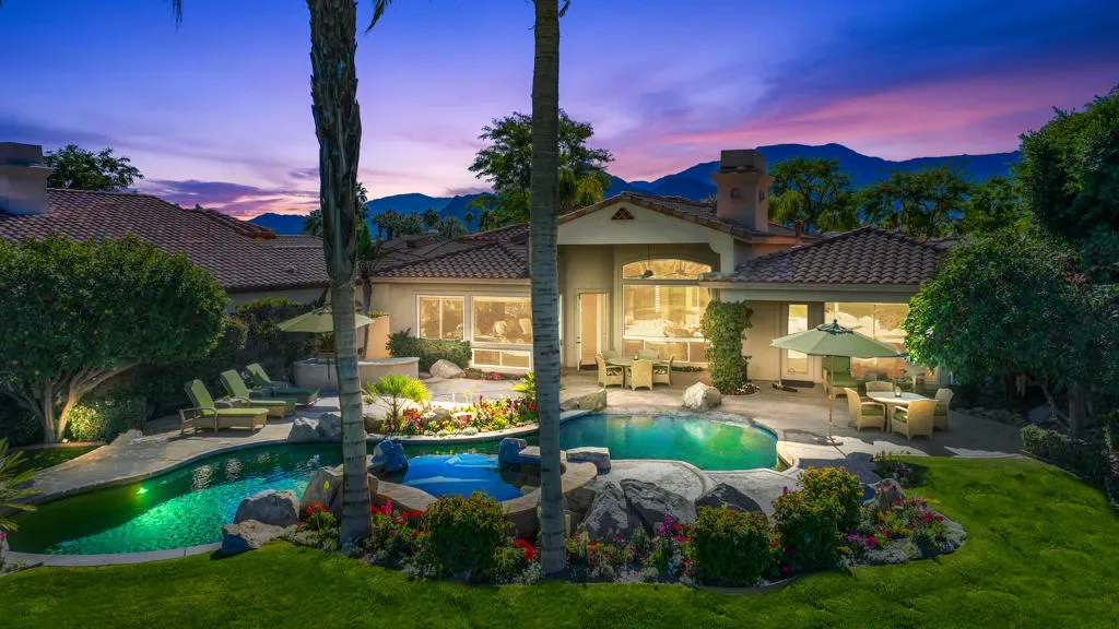 Beautiful 4BD/5BA home with over 3,500 sq. ft. overlooking the 18th fairway of a Robert Trent Jones designed course.This Spacious residence features flagstone flooring, high ceilings, abundant natural light, formal dining, full bar, spearate living and family rooms, and large picture windows with golf course and mountain views.The detached 1BD/1BA casita includes a fireplace and kitchenette-perfect for guests.Resort style backyard with a pool spa and covered entertaing spaces offering privacy and expansive views.A rare opportunity in one of La Quinta’s most desirable communities.