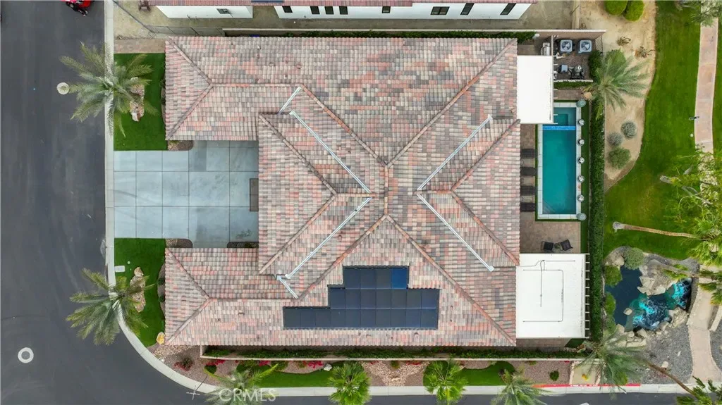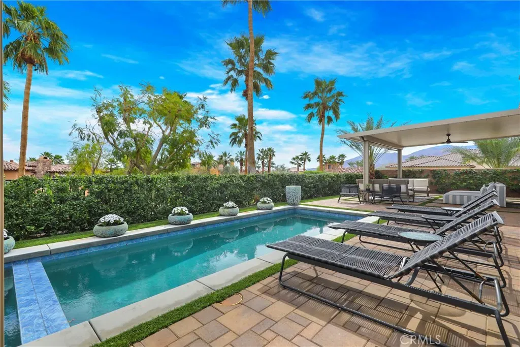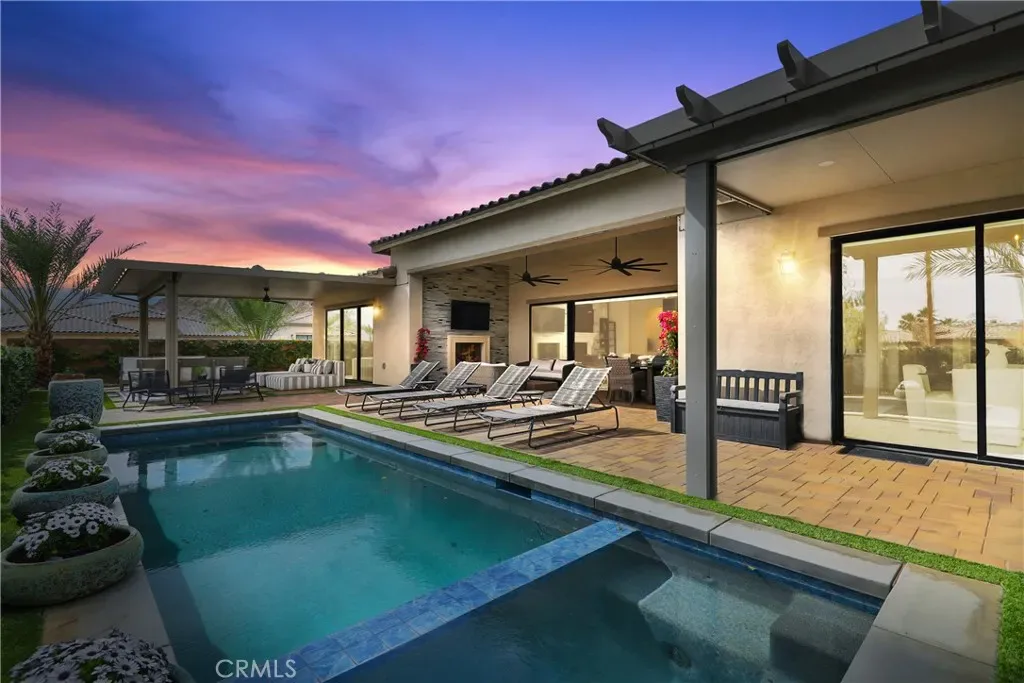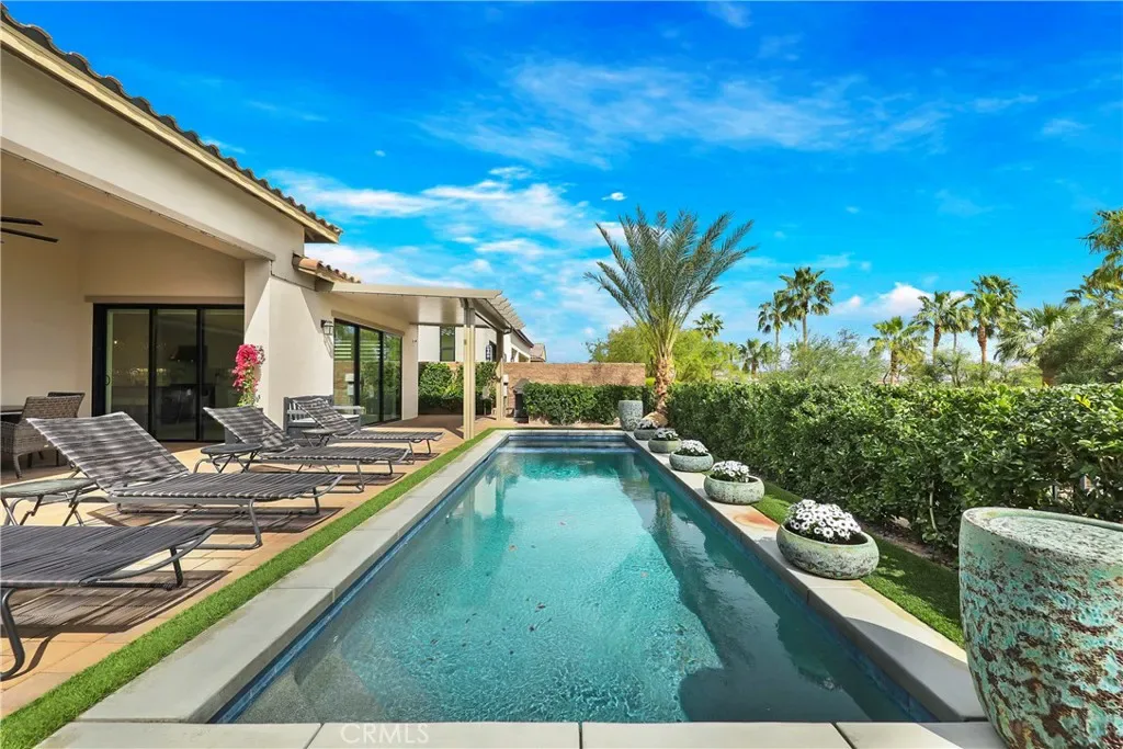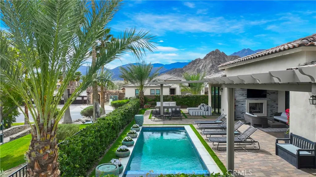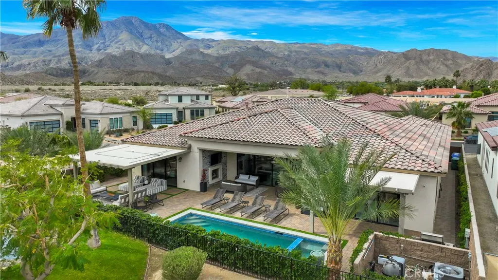Priced to sell! Low HOAs! This extensively upgraded home in the prestigious Stone Creek Ranch neighborhood is an exceptional value offering over $642,000 in custom luxury upgrades, owned solar, and a reverse osmosis water system located within one of La Quinta’s most picturesque gated communities. Perfectly positioned on a premium lot with lots of privacy, this stunning 3,908-square-foot residence captures sweeping sunlight along with the tranquil sounds of nearby streams and cascading waterfalls. The contemporary open layout is highlighted by soaring 12-foot ceilings in the great room, four spacious bedroom suites and 4.5 bathrooms, a striking glass-walled executive office, a designer kitchen and bar area, and a versatile flex room with barn doors—perfect for a movie room, casual living space, or potential fifth bedroom. The primary suite offers a private retreat with custom marble finishes, a custom-designed walk-in closet, and direct access to the lush backyard oasis. Additional highlights include a resort-style backyard, featuring a sparkling pool and spa surrounded by premium pavers, multiple lounging areas, two solid pergolas, a large awning with misters, and corner bi-fold doors that seamlessly open to blend indoor and outdoor living. Please come and view this stunning property while it is still on the market!