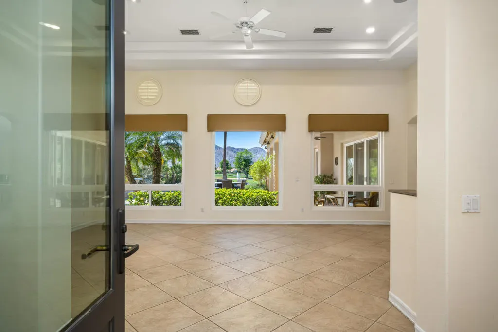 Perfectly positioned within The Citrus Club, this beautifully upgraded Trovita 2 residence offers refined desert living on an oversized 13,000+ square foot premium lot. Enjoy your morning coffee on your expansive patio with sweeping double fairway views and panoramic vistas of the Santa Rosa Mountains. At the heart of the home, a custom-renovated kitchen with stainless steel appliances and a walk-in pantry opens to the family room, while a wall of glass sliders invites the outdoors in. Designed with comfort and flexibility in mind, each bedroom offers its own en suite bath, ideal for visiting guests. The third guest bedroom is currently configured as an office with a built-in workspace. The property has been meticulously maintained and boasts remote controlled window coverings and exterior retractable awnings. The formal living and dining area feature a custom built-in, temperature-controlled wine cabinet. Multiple seating and gathering areas create the perfect environment for hosting friends or simply enjoying the peaceful desert surroundings. Enjoy your private gazebo in the afternoons or take in the sunset by your firepit in the evenings overlooking both the 13th and 14th fairways of the Pete Dye designed golf course. A rare opportunity to own one of the most desirable view properties in The Citrus. Close proximity to the Desert International Horse Park, SilverRock Golf Course, Old Town La Quinta, El Dorado and Empire Polo, Thermal Race Track, Thermal Airport and more. HOA inc cable/wifi, front landscaping, 24/7 guard gate.