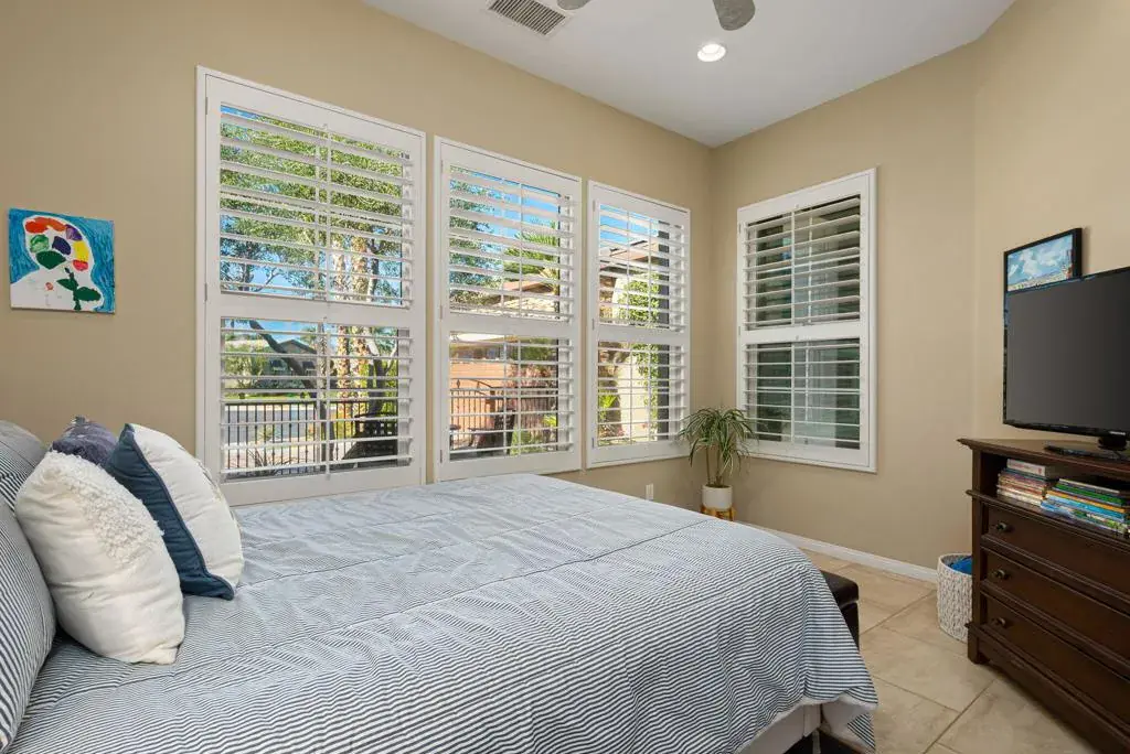 Live Life Brilliantly! Luxurious touches amplify the joy of desert living in this meticulous Trilogy at La Quinta resort property. A popular Oreas model, the home is open and bright with ten-foot ceilings and a smart and flexible 2,331 SQ FT floor plan that accommodates your changing lifestyle needs. The home is currently used as a three-bedroom, 3-baths with a great room with fireplace, a grand gourmet kitchen, and a separate large recreation room with direct access to a full bath. Resting on a grand 10,454 SQ FT lot with partial mountain views, there’s plenty of space for a pool, spa, putting green and more. Set back off the end of a cul-de-sac, a gated front patio with big SW mountain views and tall wooden door mark the entry to the main home. A main entry, tile floors, and a striking double-sided stone fireplace hints at the quality and invigorating lifestyle that lay beyond. The great room is spacious with big picture windows and white plantation shutters. Stunning custom lit built-ins make way for a big screen TV and in-ceiling surround that elevates your in-home media experience. Cool winter nights and Holidays are warmed by the fire as new memories are made with family and friends. A true gourmet sized kitchen, it features a new premium stainless GE Profile cooktop, microwave, and dishwasher. Volumes of warm wood cabinets extend into the informal dining area and the pantry will keep all your kitchen ware neatly tucked away. A prep island and a separate entertainment island with seating are crowned in creamy textured granite. An outstanding bedroom retreat features a sumptuous walk-in shower with multiple rainshower and hand-held shower heads. Dual vanity custom wood cabinets, cool white quartz countertops and luminous LED lit mirrors, spacious closets, and a hidden bonus room with mounted TV, rounds out this perfect retreat. Step out each sun drenched morning onto the covered patio with a cup of Joe to plan a day of fun. As the evening wanes, relax on the courtyard and watch the sun as it slips behind the Santa Rosa Mountains. The garage has a new epoxy floor, tall storage cabinets, and space for all your toys. This home is meant to be treasured and enjoyed!
